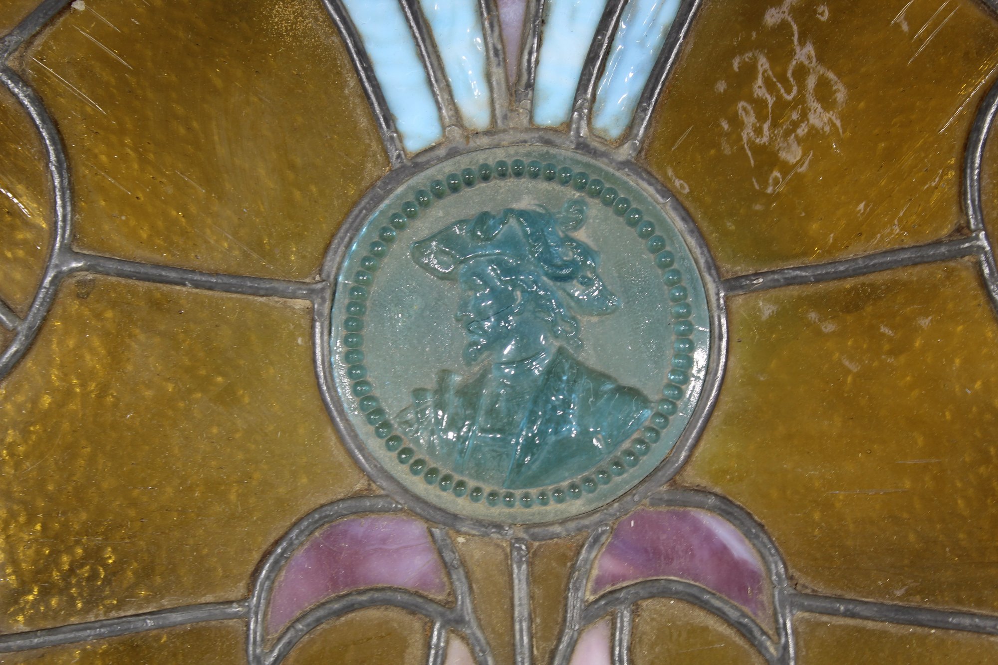 This exquisite antique stained glass panel showcases a stunning combination of artistry and craftsmanship. Measuring 20 inches by 32 inches, this piece is a beautiful example of classic decorative art. The intricate design features elegant floral motifs in shades of amber, pale blue, and soft lavender. A central medallion depicts a profile portrait, adding a unique and historical touch to the piece.