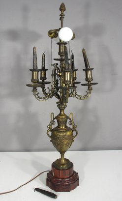 antique French-style bronze candelabra table lamp, standing 35 inches tall. This highly detailed lamp features an ornate urn-shaped body with floral and scrollwork engravings, complemented by an elegant multi-arm candelabra top.