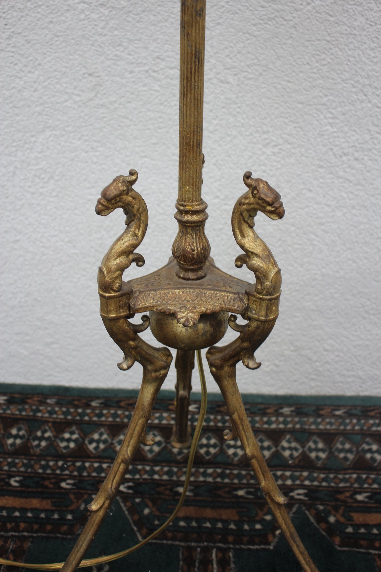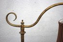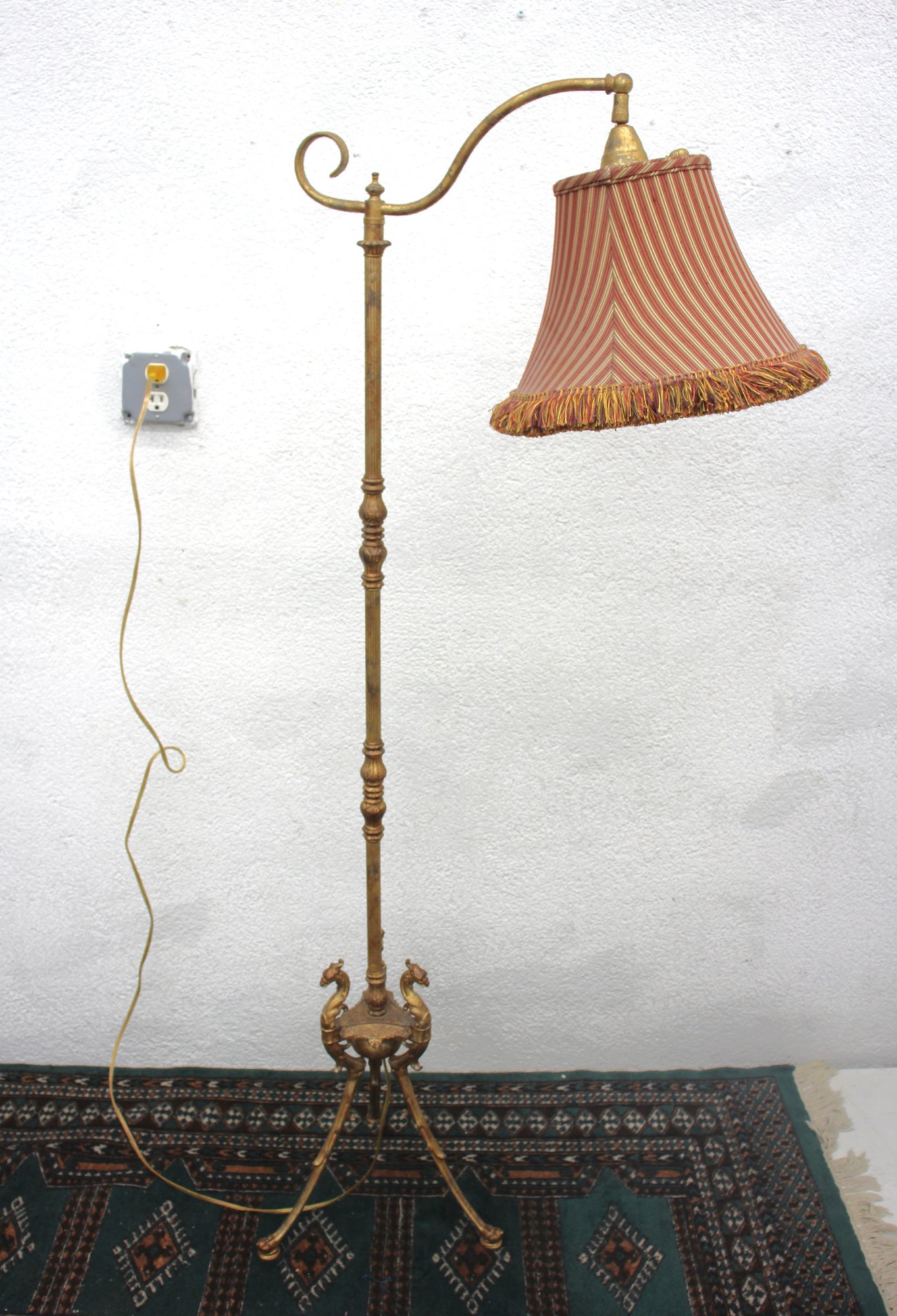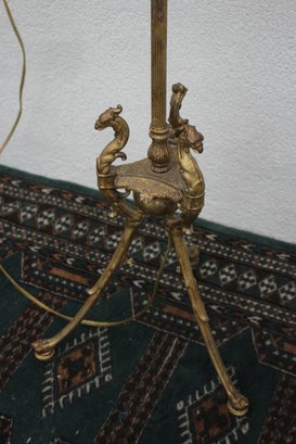 60” antique brass bridge arm floor lamp features an ornate horse head base and a beautiful tasseled fabric shade, embodying a sophisticated vintage aesthetic.