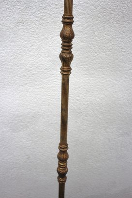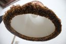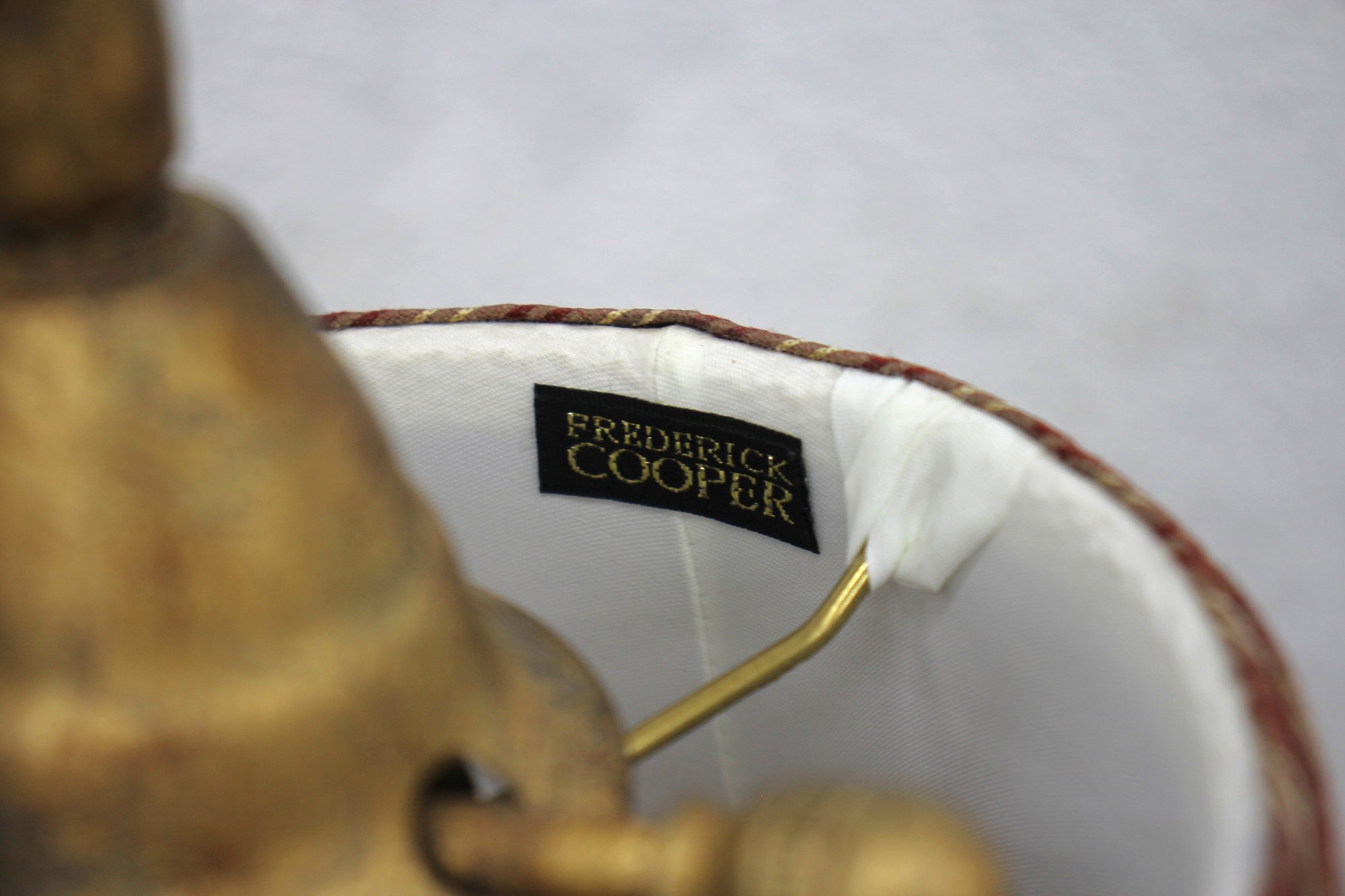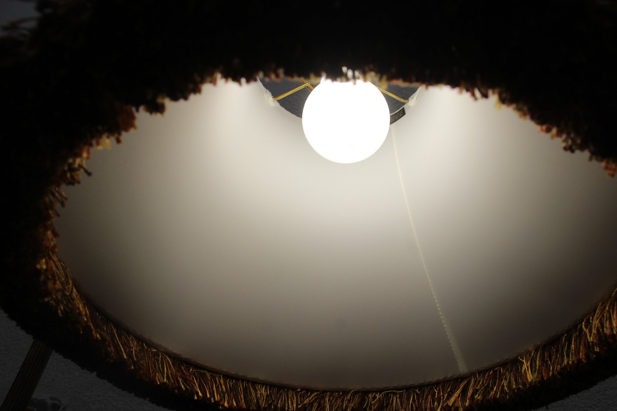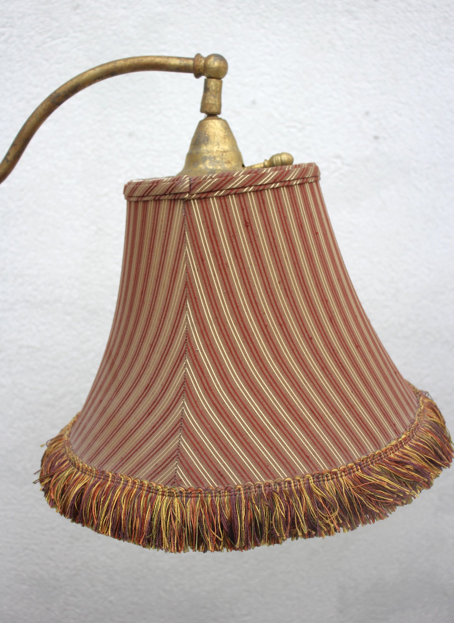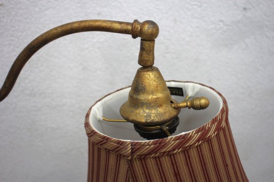 Shade: Striped fabric shade with fringe trim, adding a classic touch