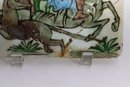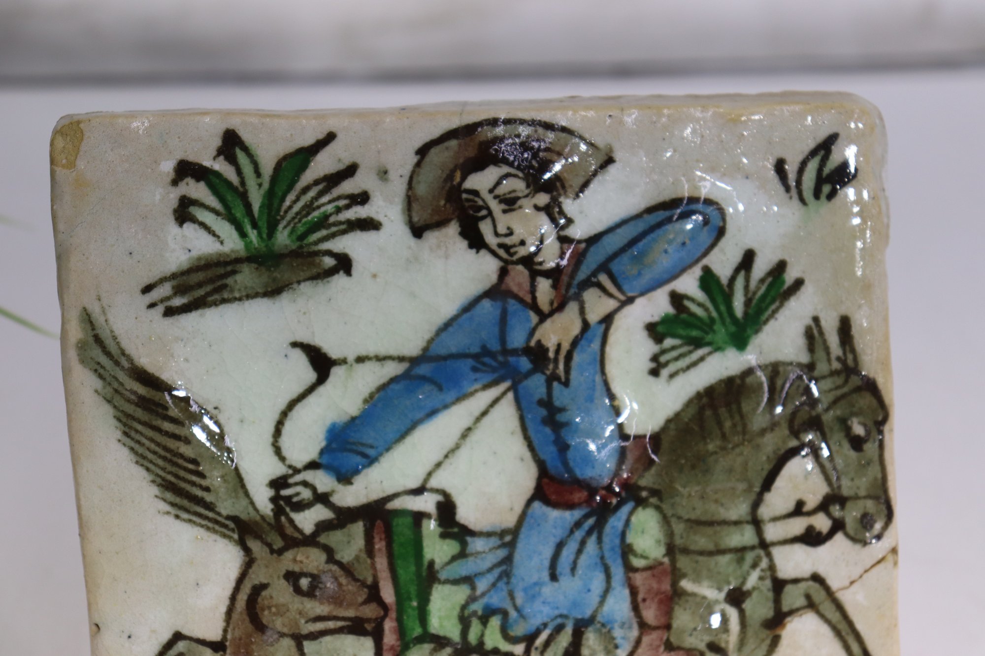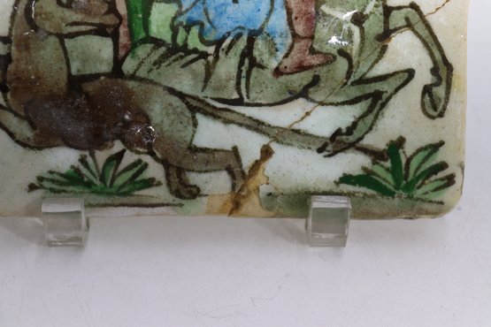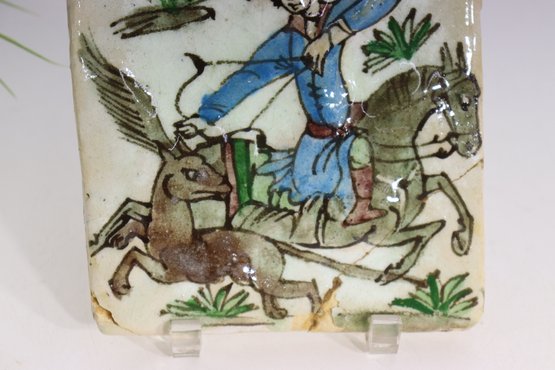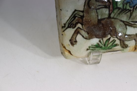 A striking antique Persian Qajar-era tile, hand-painted with a vivid equestrian hunting scene featuring a mounted archer aiming his bow at a winged mythical creature. This 7-inch square ceramic tile is a wonderful example of 19th-century Middle Eastern craftsmanship, characterized by expressive lines, natural pigments, and traditional Islamic artistry.