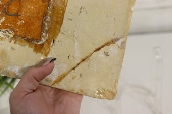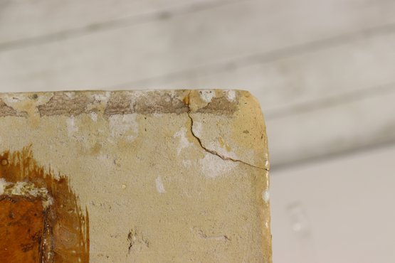 *The back retains remnants of old mortar, suggesting it was once part of an architectural setting or wall panel. There are visible age-related cracks and edge wear, consistent with its age and history, yet the piece remains stable and visually captivating.