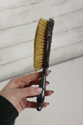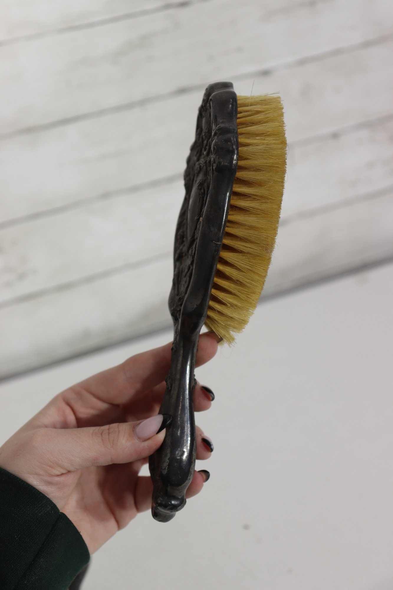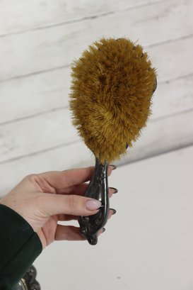 The mirror retains its original beveled glass, showing age-appropriate silvering and patina that adds charm and authenticity. The matching brush includes natural bristles and the same decorative motif on the reverse side.