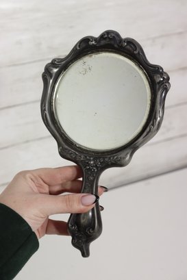 antique Art Nouveau vanity set consisting of a hand mirror (10”) and matching brush (8.5”), both featuring an intricately detailed repoussé floral and scroll design with a central cartouche. The beautifully shaped handles and frames showcase flowing organic lines characteristic of the early 1900s Art Nouveau style.