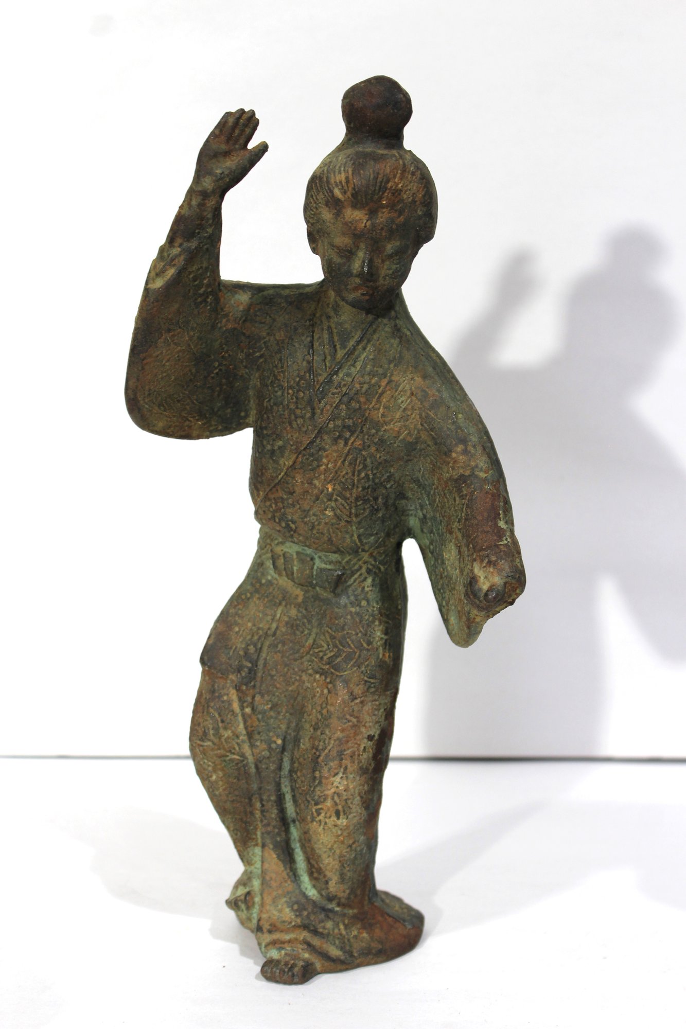 A captivating antique Asian iron figurine, featuring a figure in traditional attire, possibly representing a warrior or dancer. The figurine stands gracefully with one hand raised, showcasing intricate detailing on the garments and hair. The natural patina from age enhances its character and gives the piece an authentic, time-worn appearance.