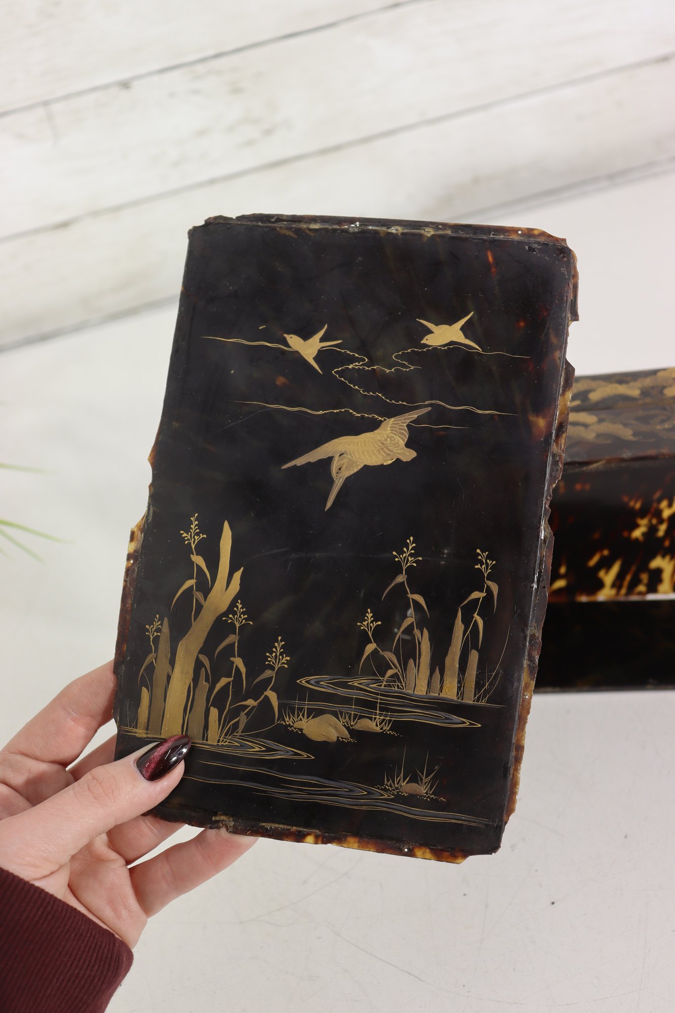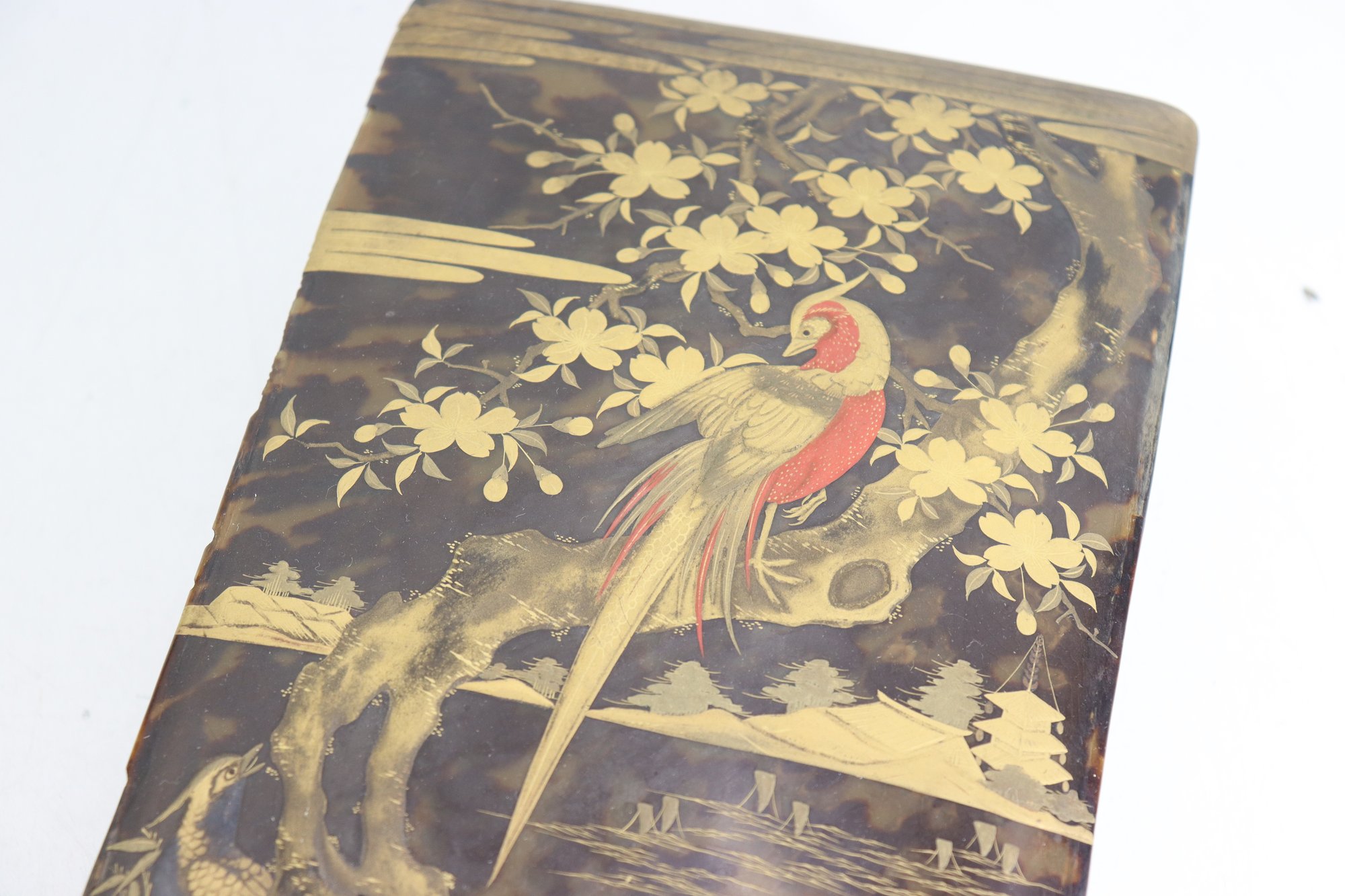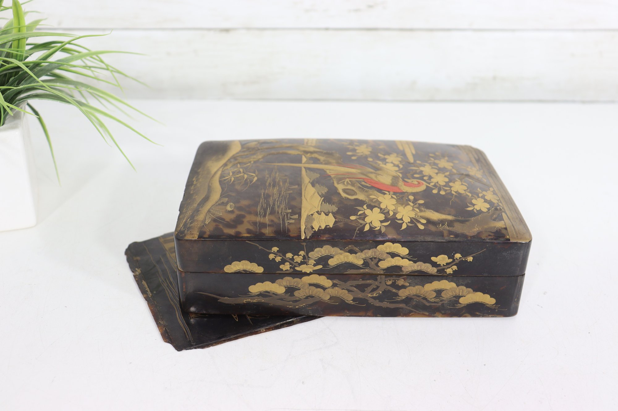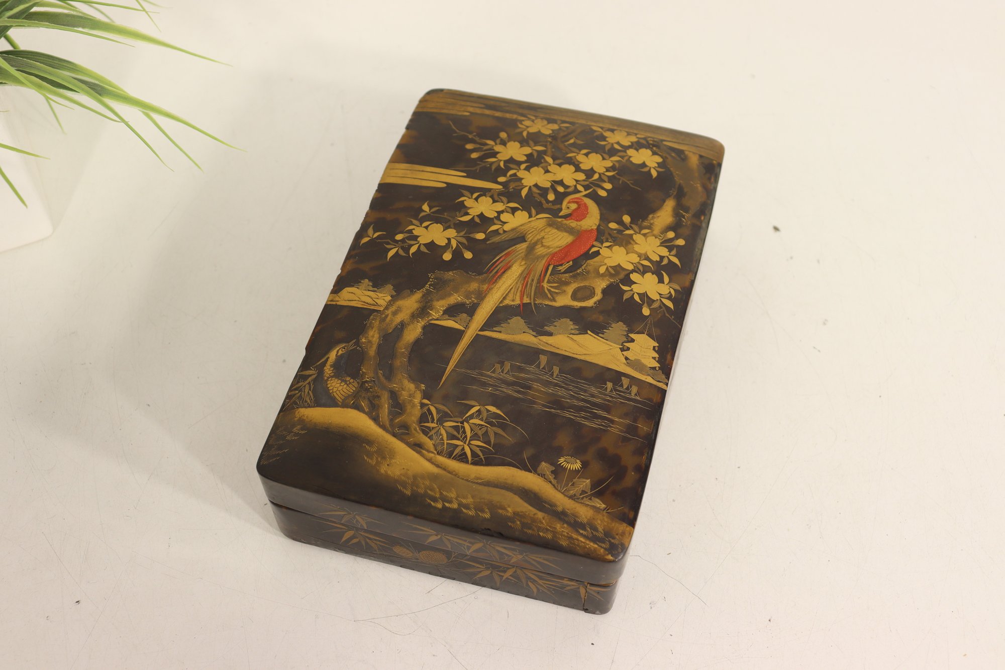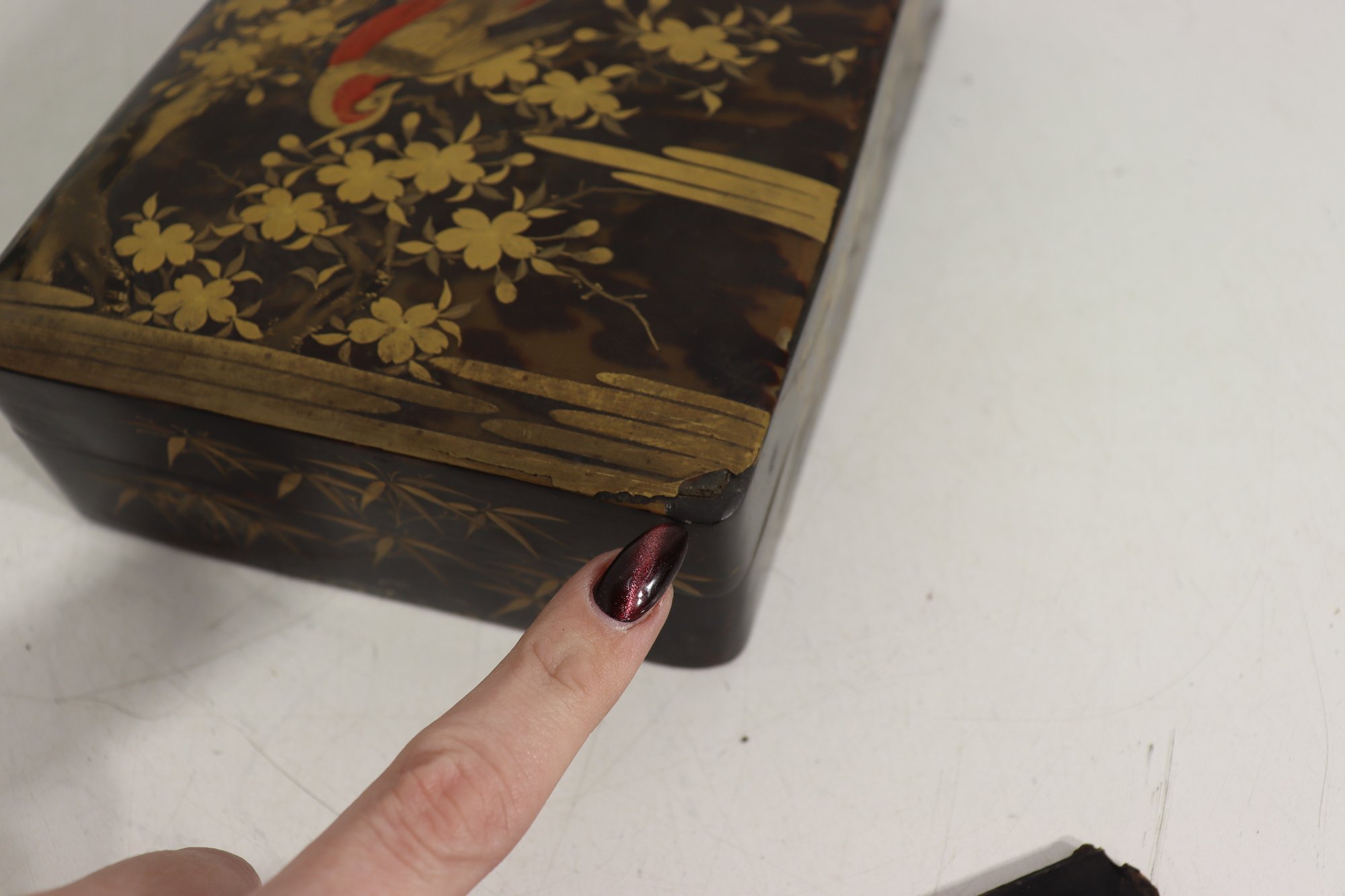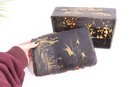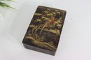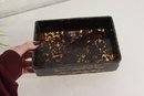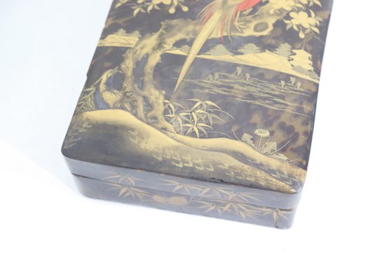 an antique Asian lacquered decorative box, richly adorned with hand-painted gilt imagery featuring birds, foliage, and landscape scenes. The box showcases traditional lacquer artistry with warm black lacquer contrasted by gold-toned detailing and colorful accents.