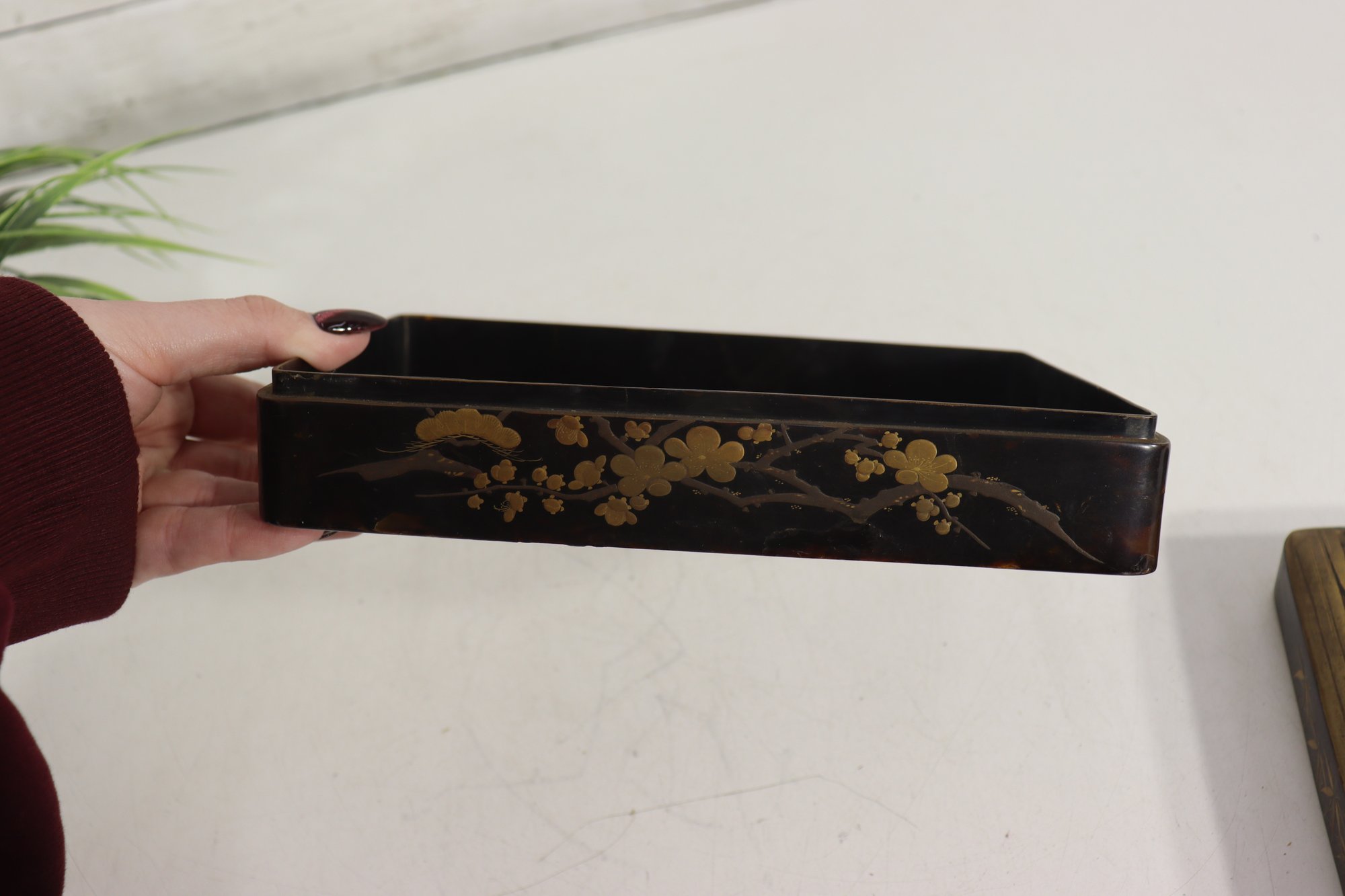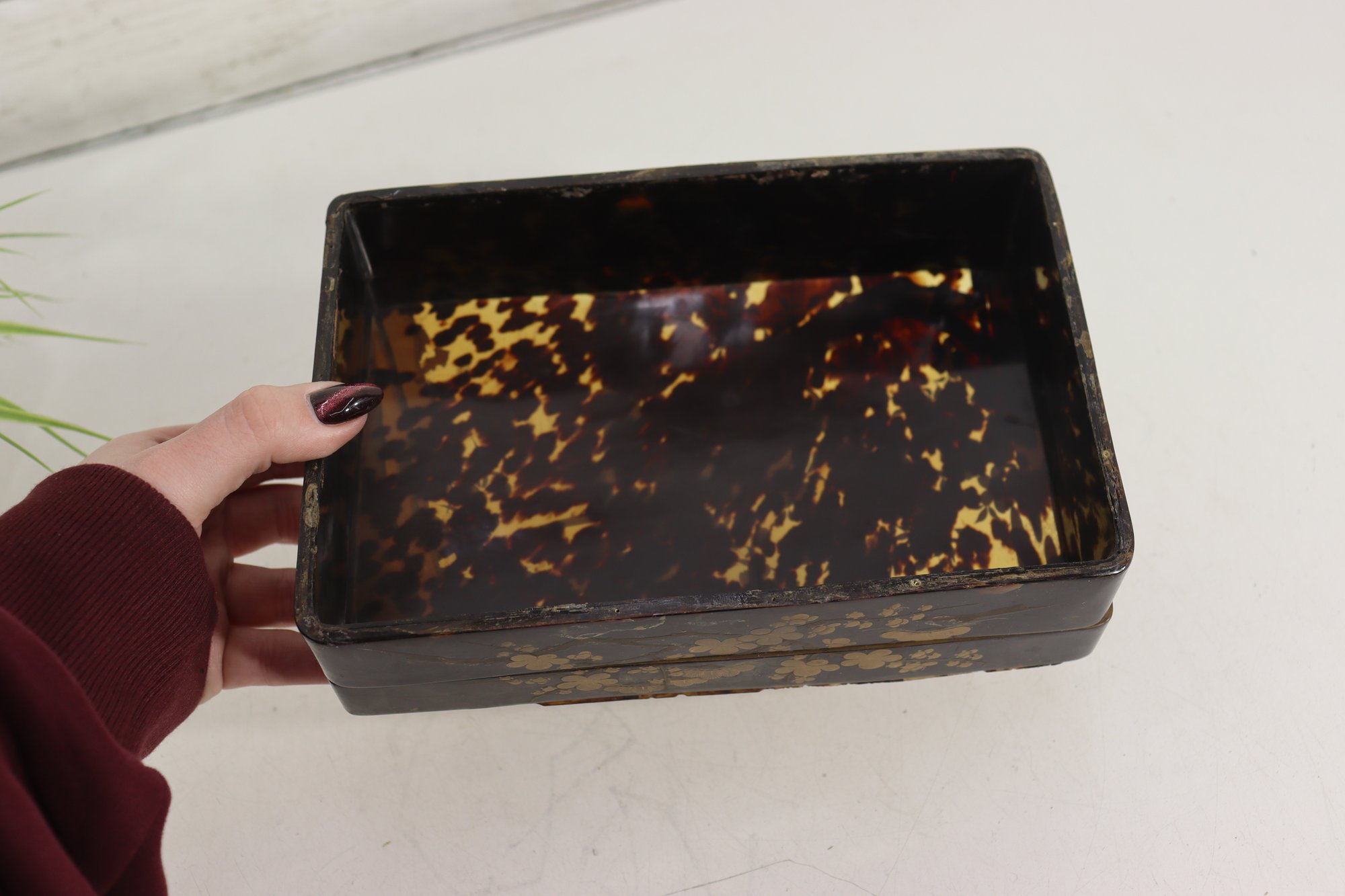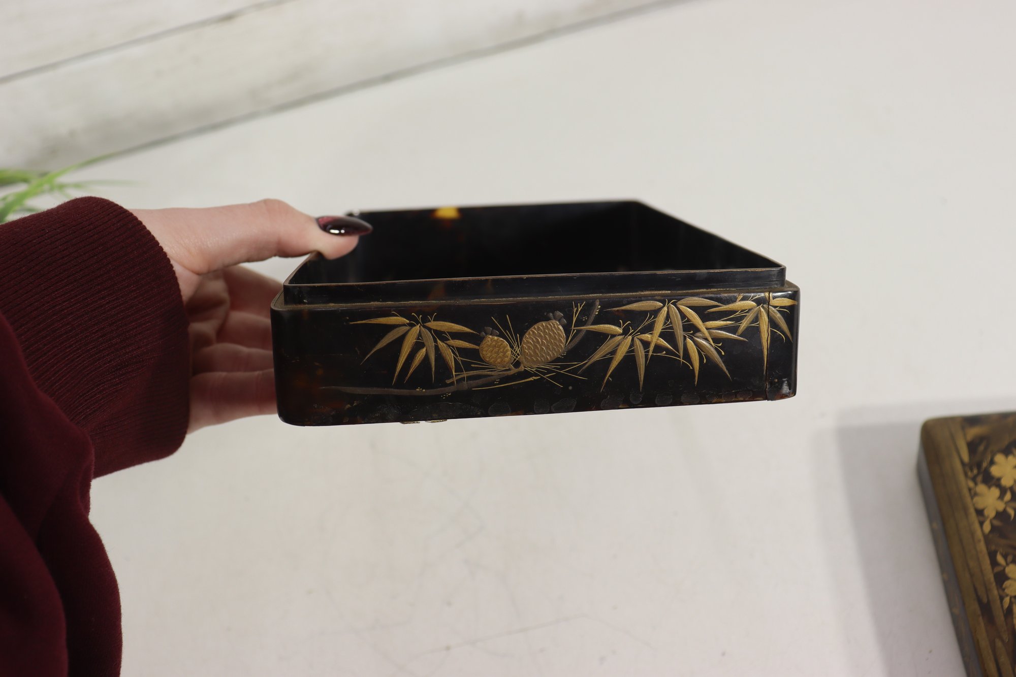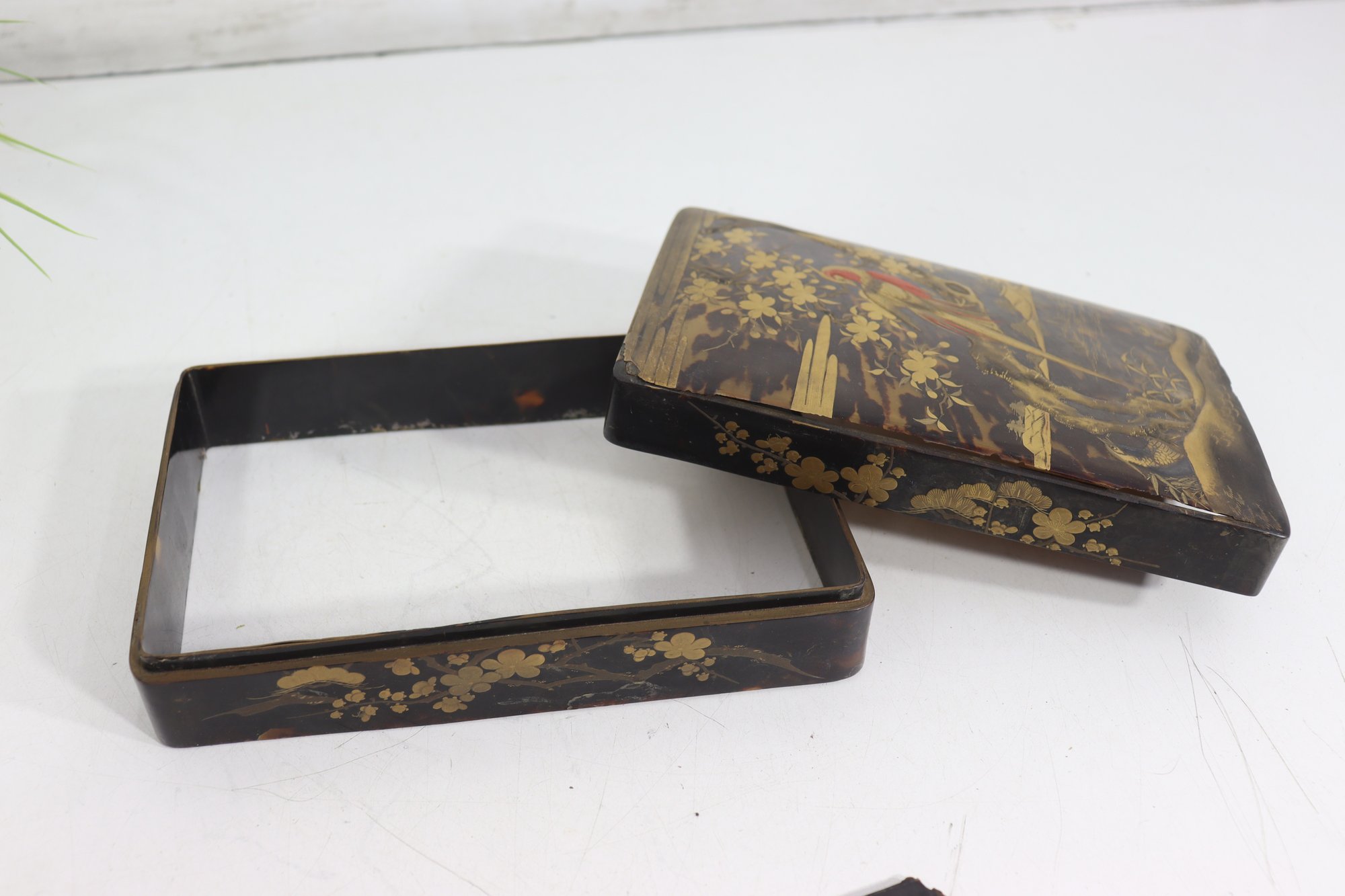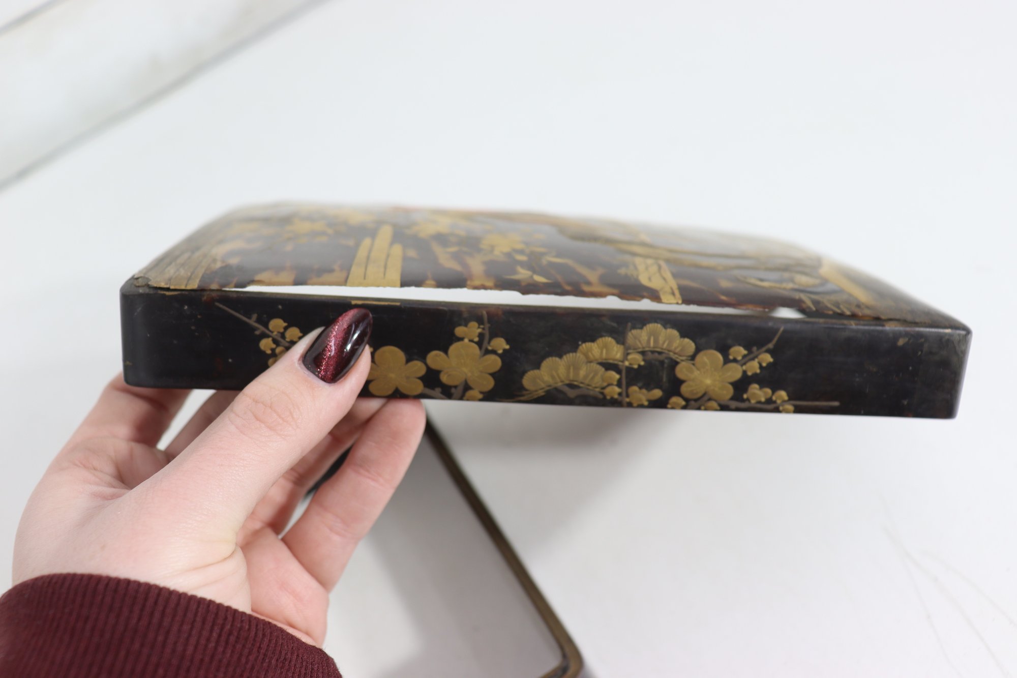 an antique Asian lacquered decorative box, richly adorned with hand-painted gilt imagery featuring birds, foliage, and landscape scenes. The box showcases traditional lacquer artistry with warm black lacquer contrasted by gold-toned detailing and colorful accents.