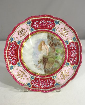 stunning 8.5-inch antique Austrian porcelain plate features a hand-painted portrait of a romantic maiden set against a scenic landscape. The plate is adorned with rich red, pink, and gold accents, intricate scrollwork, and raised gold beading around the center image. The scalloped rim adds an extra touch of elegance.