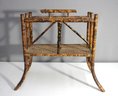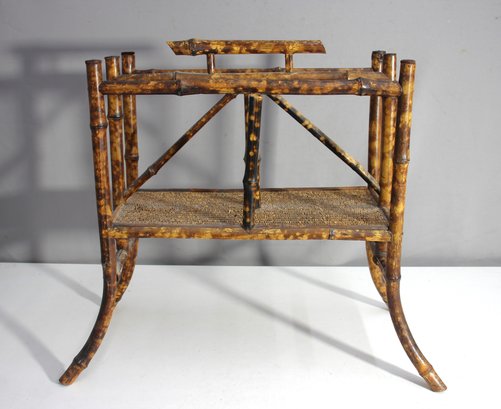 This is a beautifully crafted antique bamboo and wicker magazine, showcasing rustic elegance and timeless design. With its natural materials and curved bamboo legs, this piece adds a touch of vintage charm to any space.
