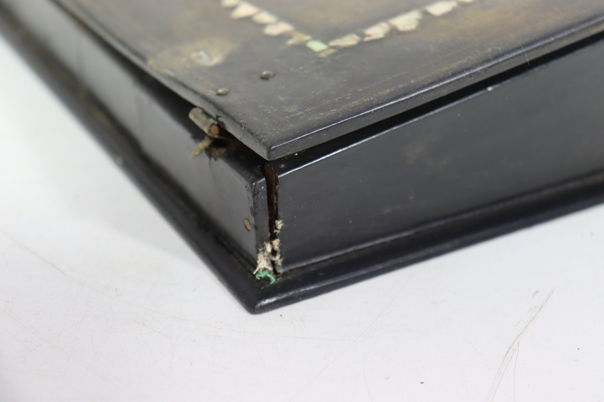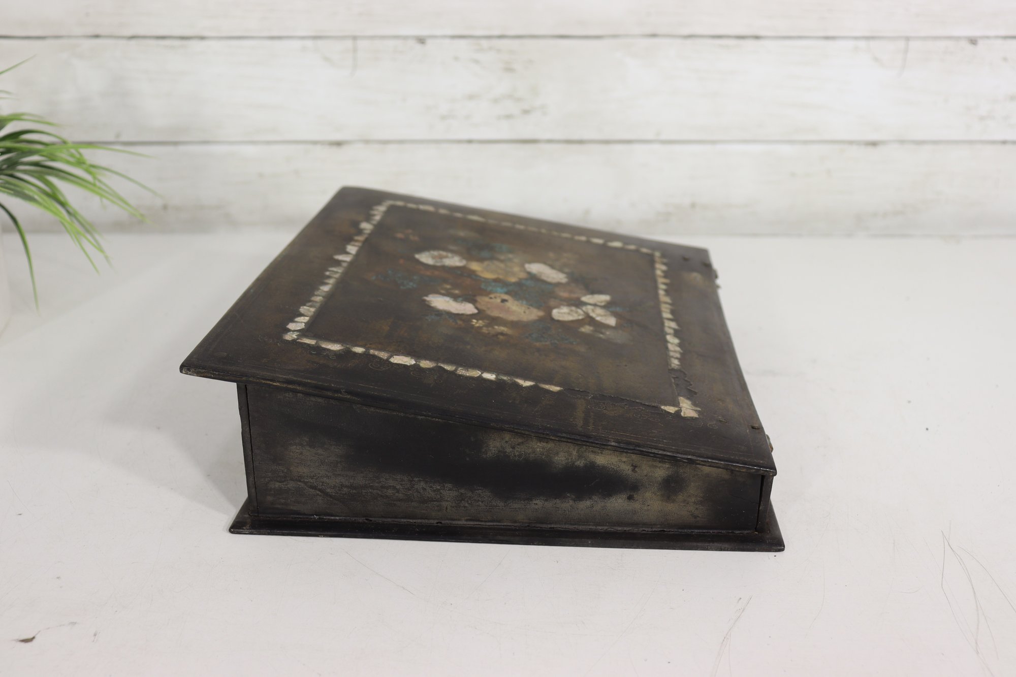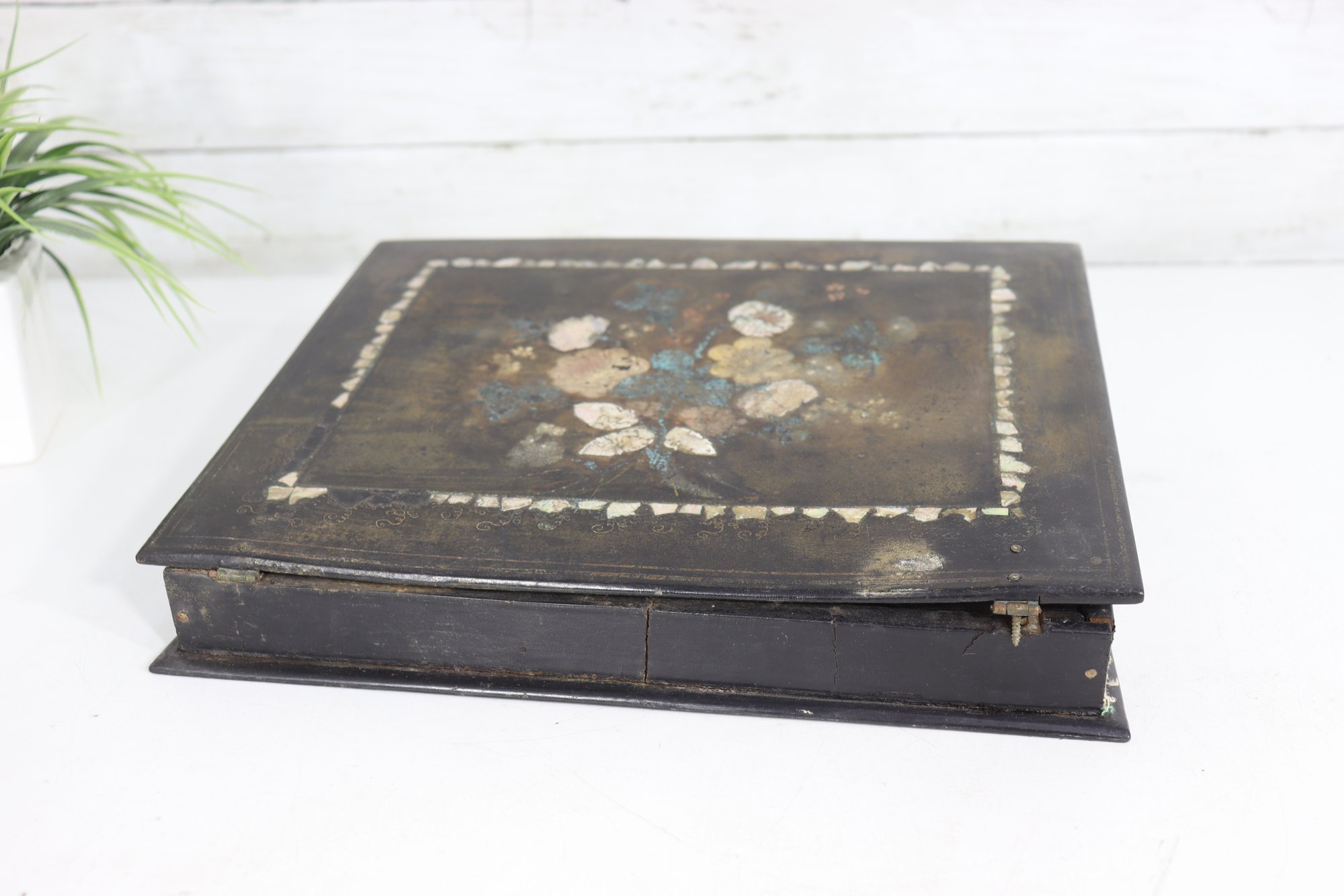 an antique black lacquer writing slope/document box featuring a beautifully aged mother-of-pearl floral inlay on the lid and a decorative border. This piece includes an interior writing surface that lifts, along with small storage compartments designed for writing tools and documents.