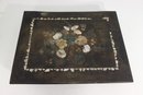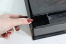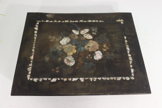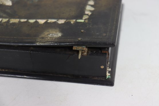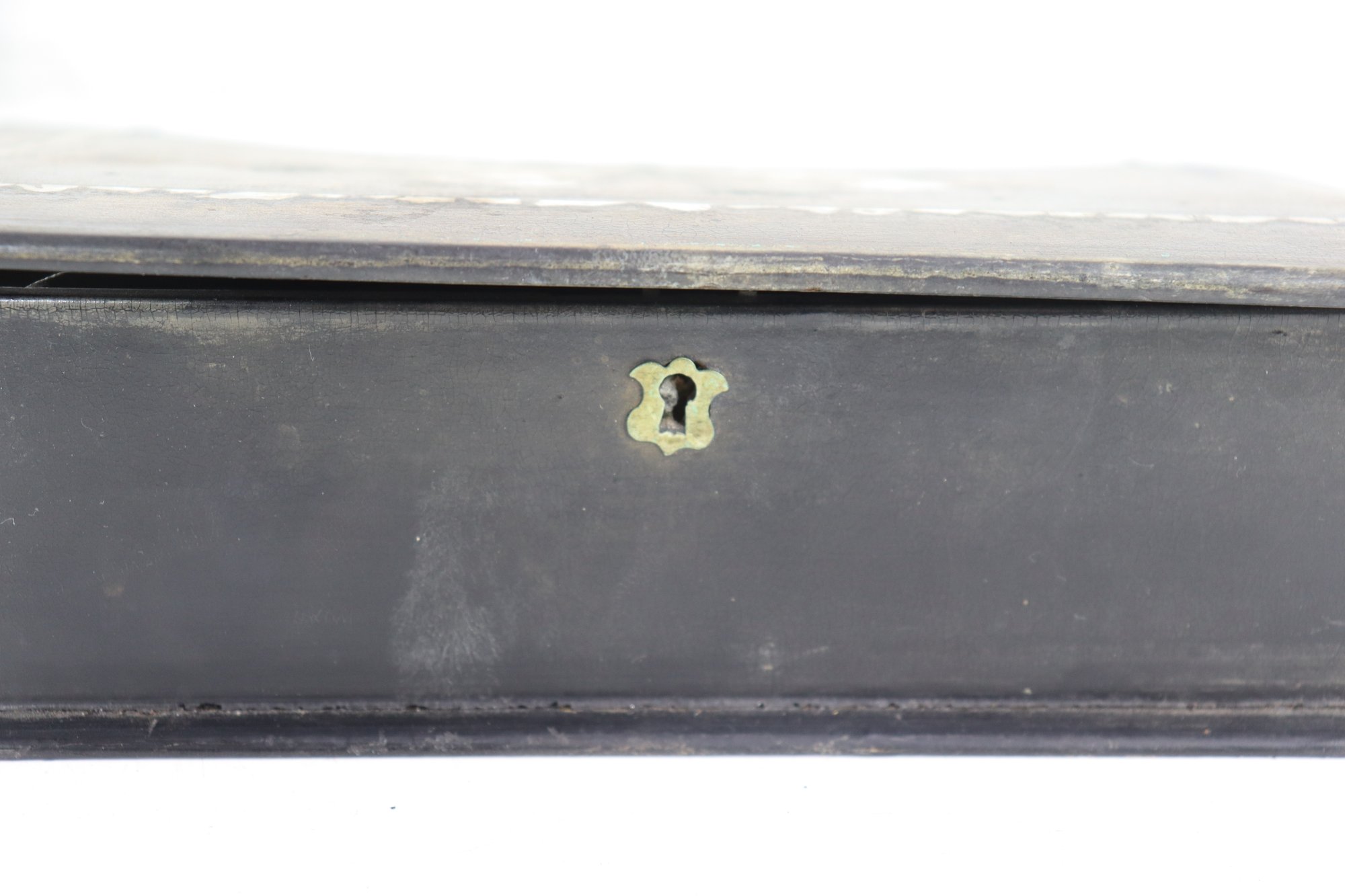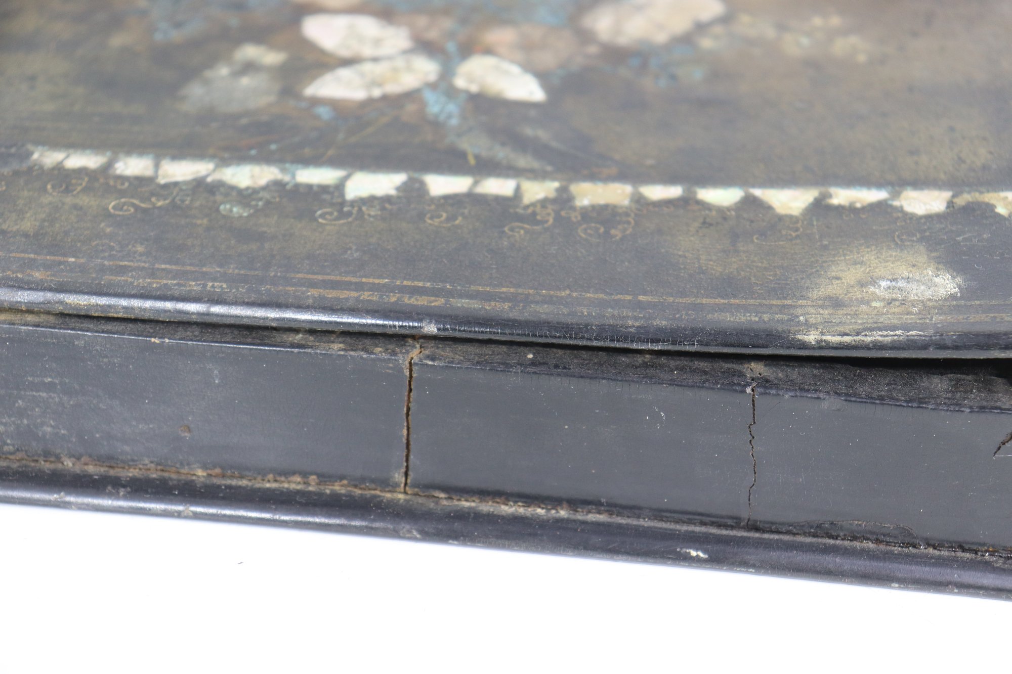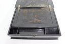 an antique black lacquer writing slope/document box featuring a beautifully aged mother-of-pearl floral inlay on the lid and a decorative border. This piece includes an interior writing surface that lifts, along with small storage compartments designed for writing tools and documents.
