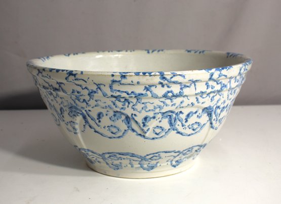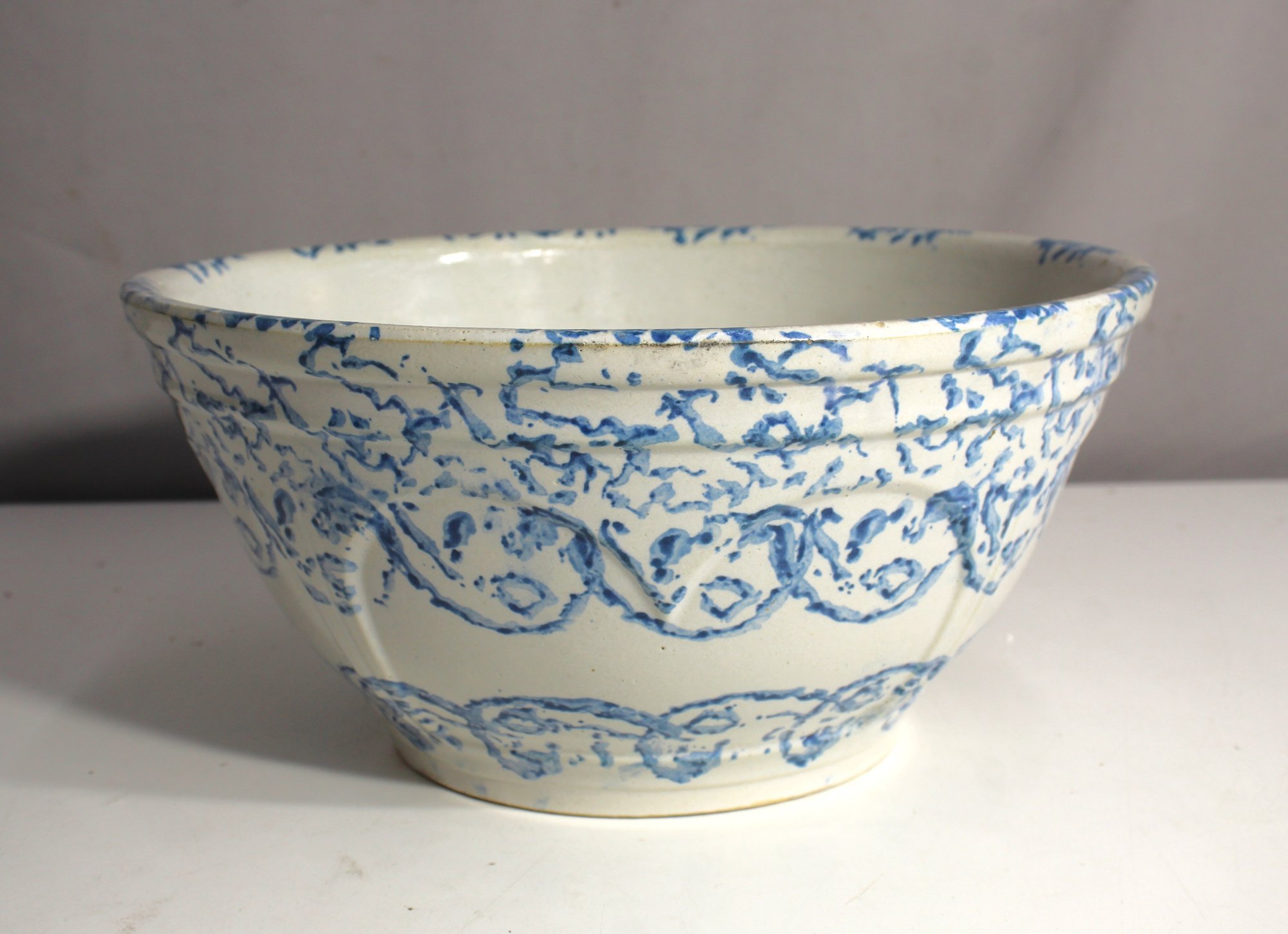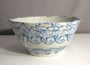 This antique blue and white stoneware mixing bowl is a beautiful and functional addition to any collection. Its classic design and substantial size make it perfect for display or use in the kitchen. Key features include: