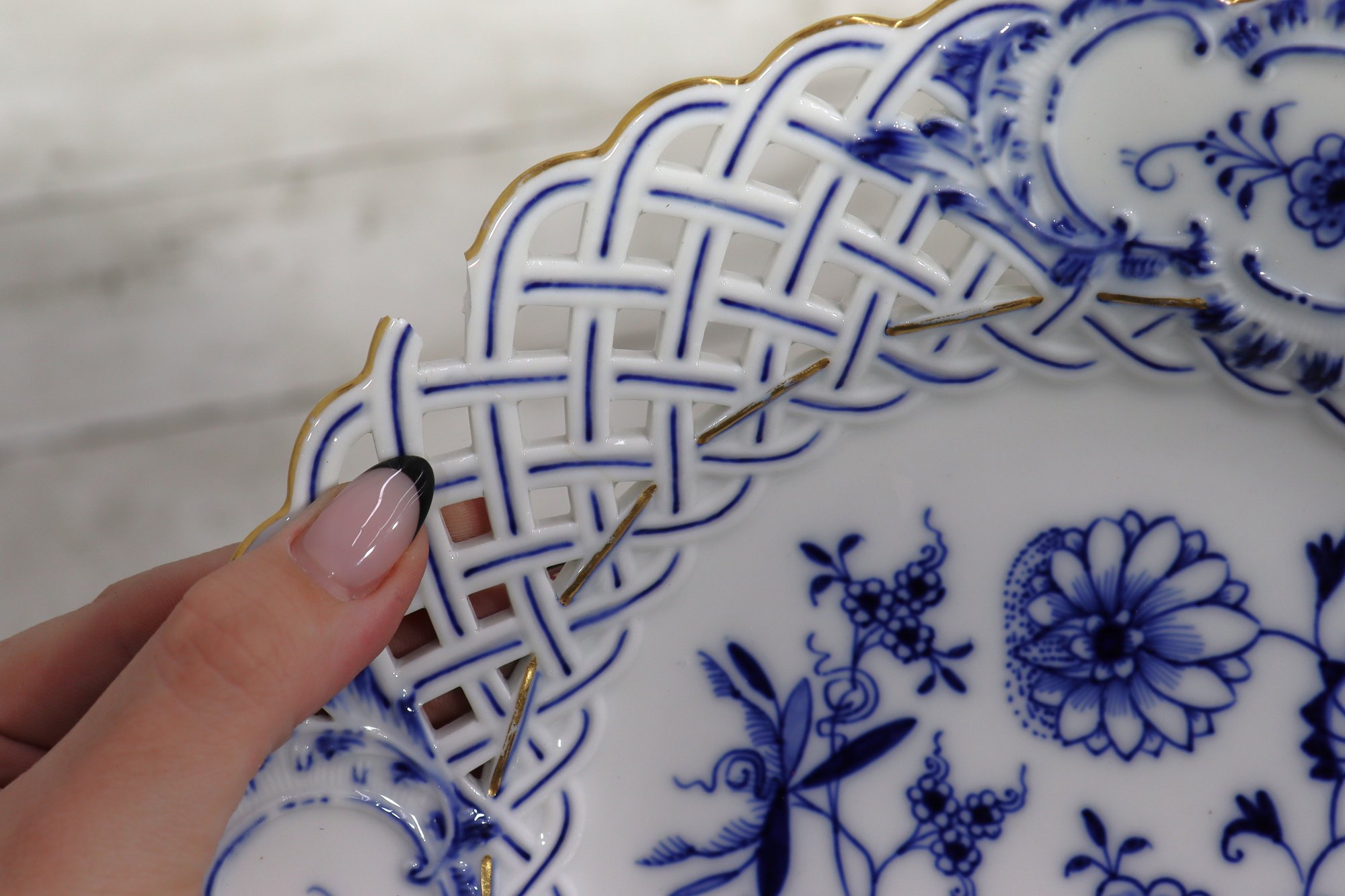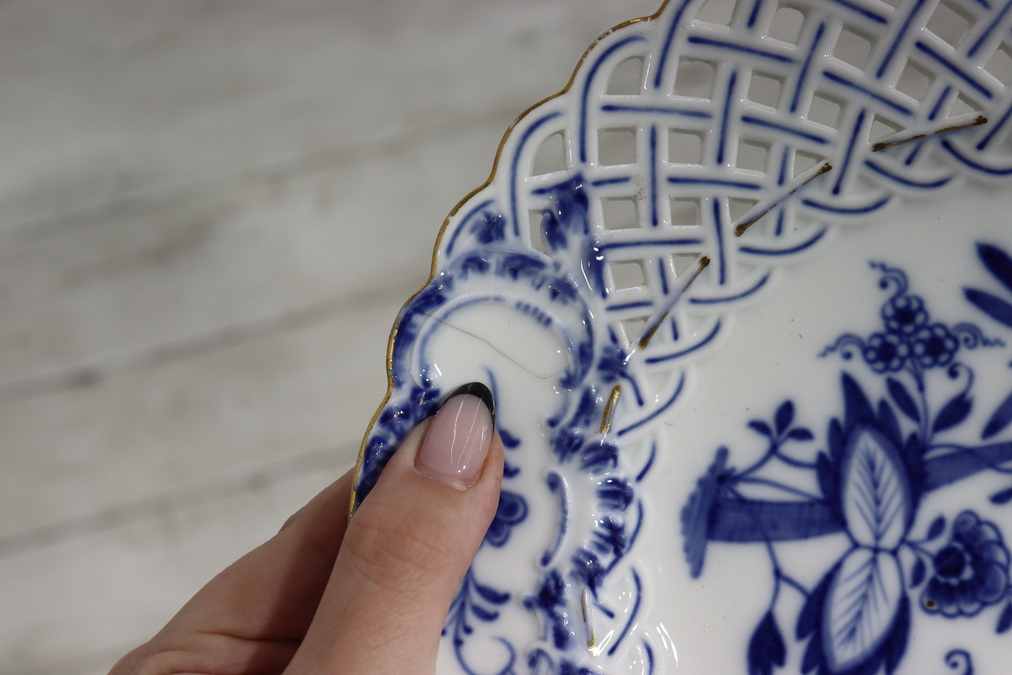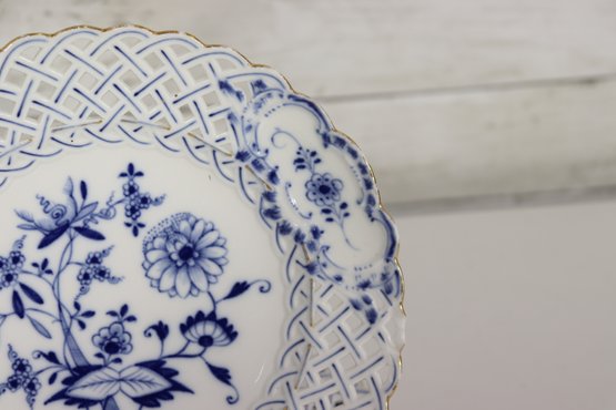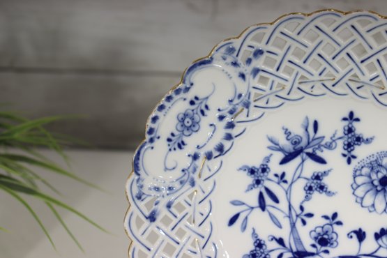 Beautiful antique blue & white reticulated border porcelain plate measuring approx. 9” in diameter. Features classic floral motif in center with intricate lattice pierced rim and subtle gold trimmed accent detail.