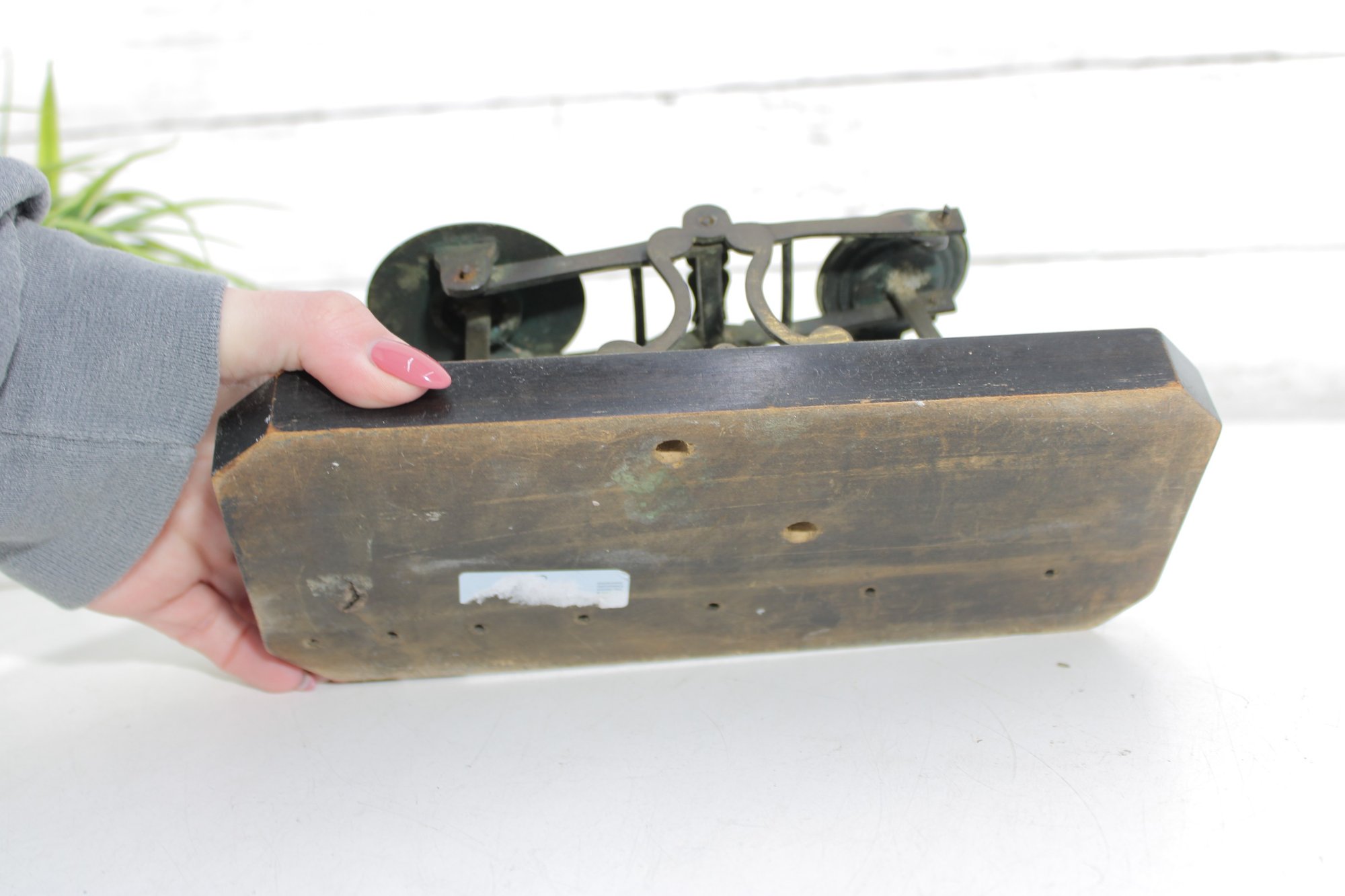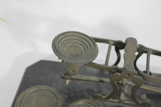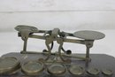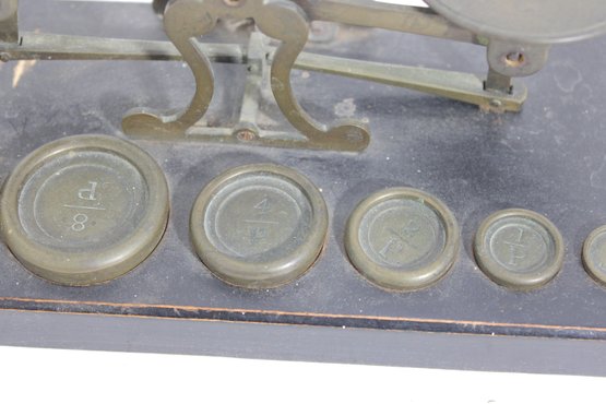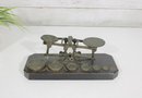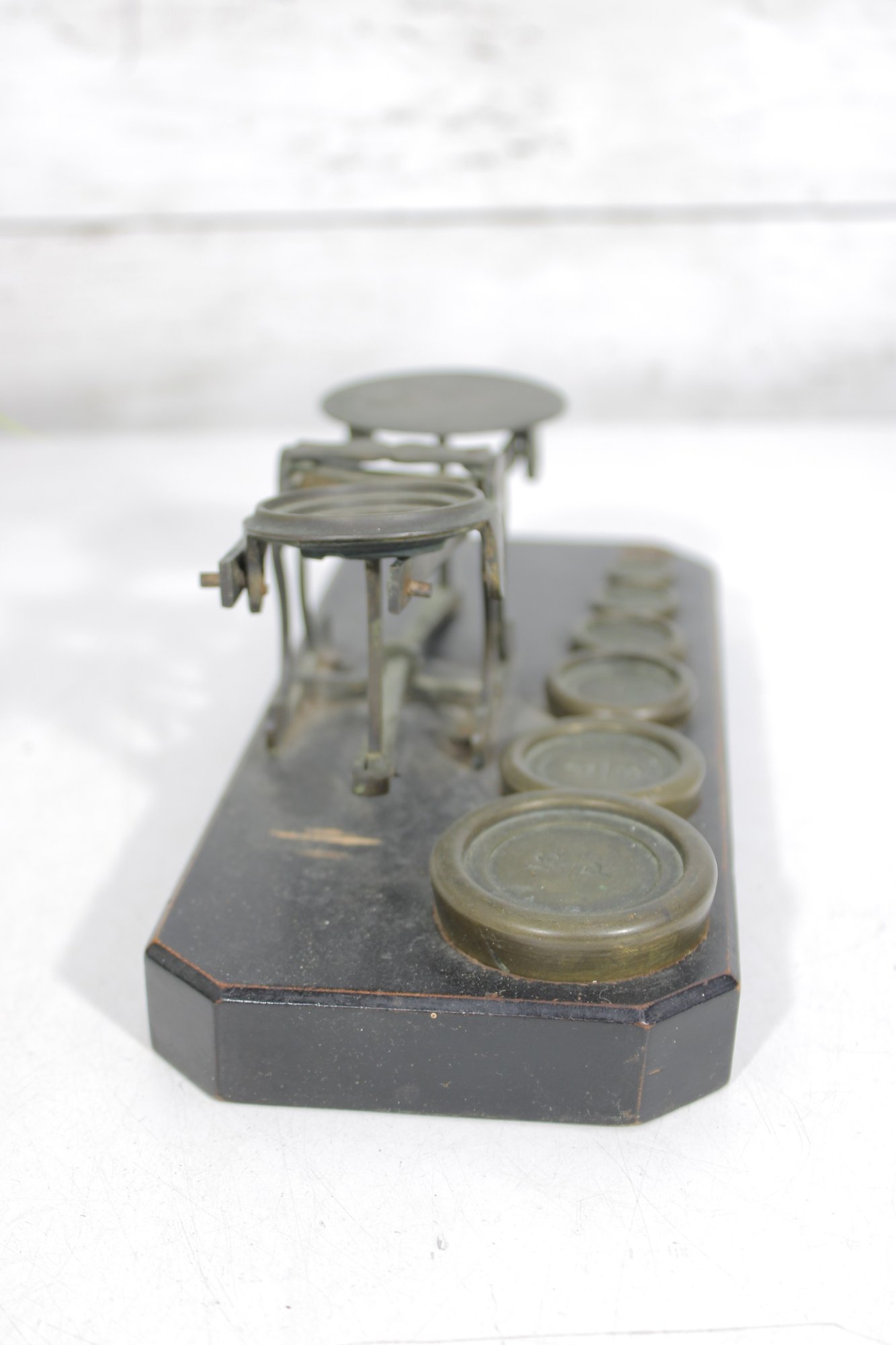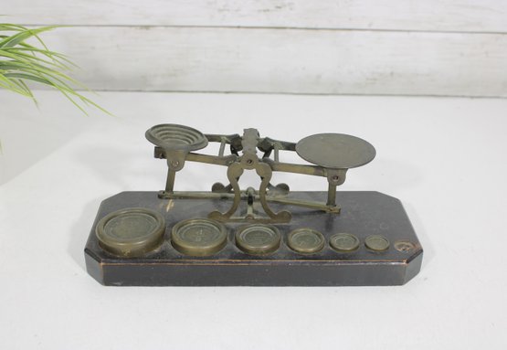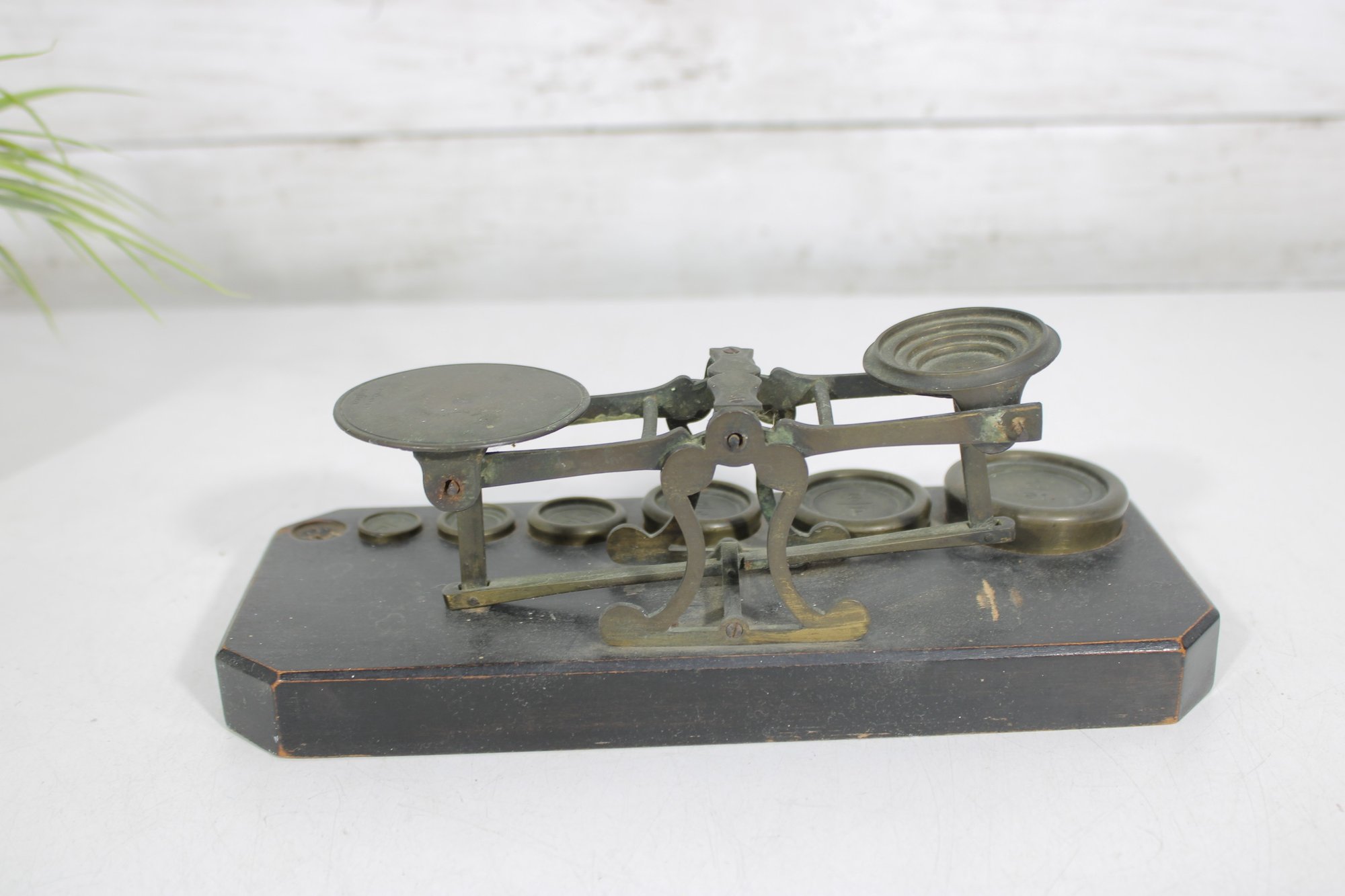 Charming antique brass balance scale mounted on a rectangular base, complete with a set of graduated weights. This classic piece features a traditional double-pan design with decorative metalwork and a nicely aged patina that reflects its history and use.