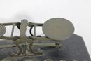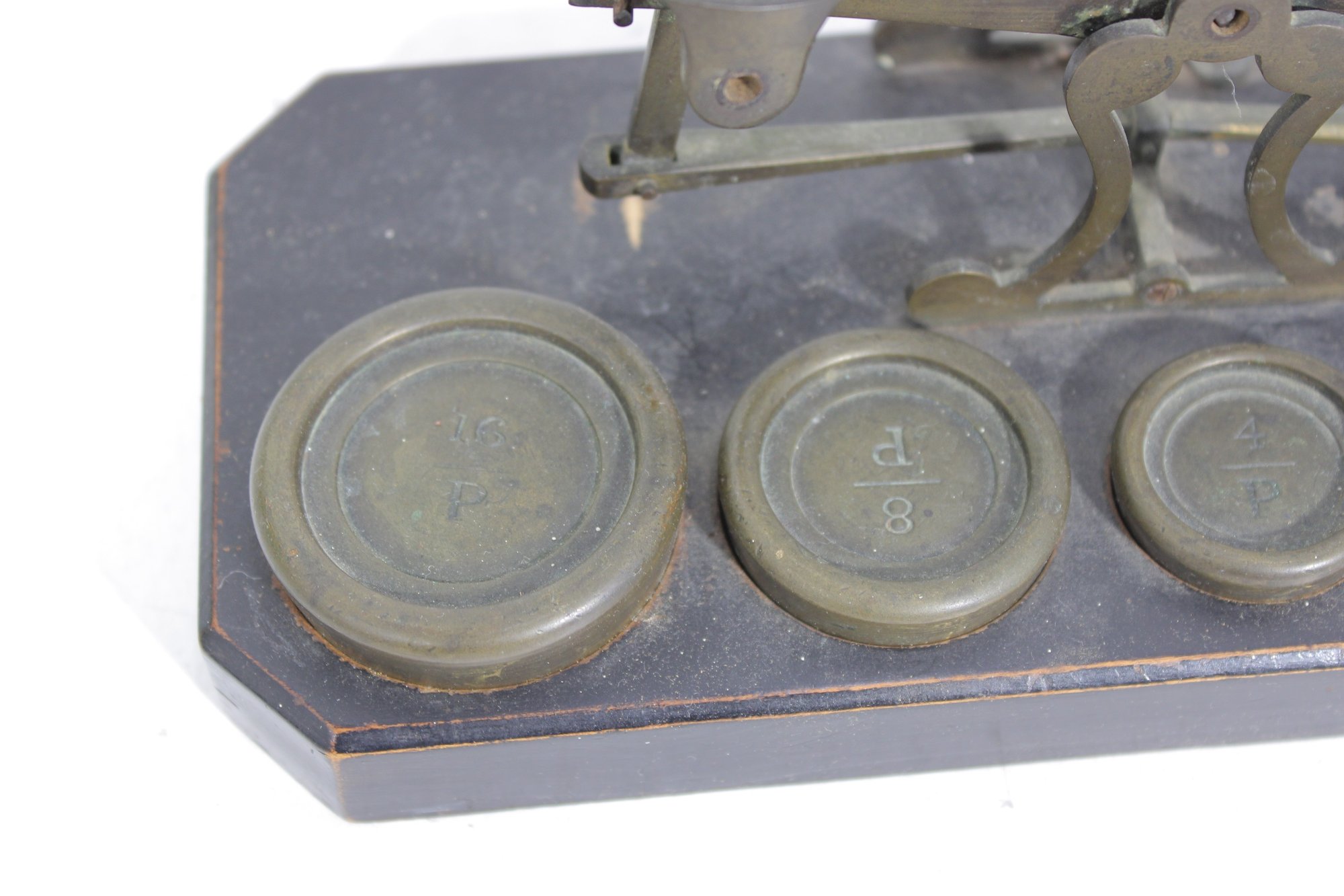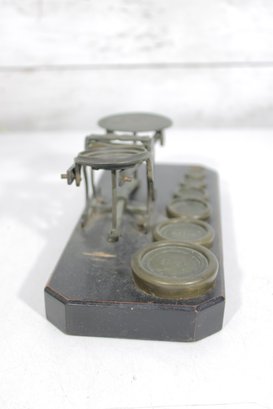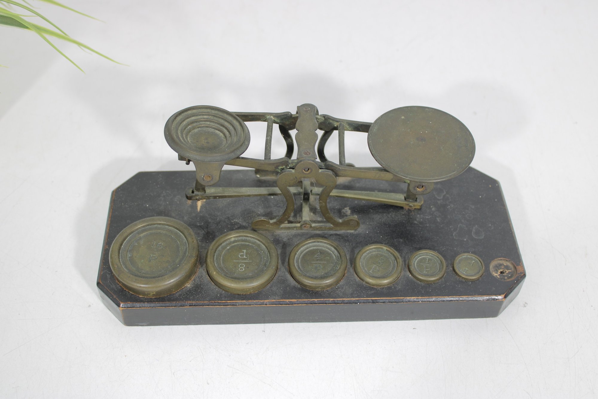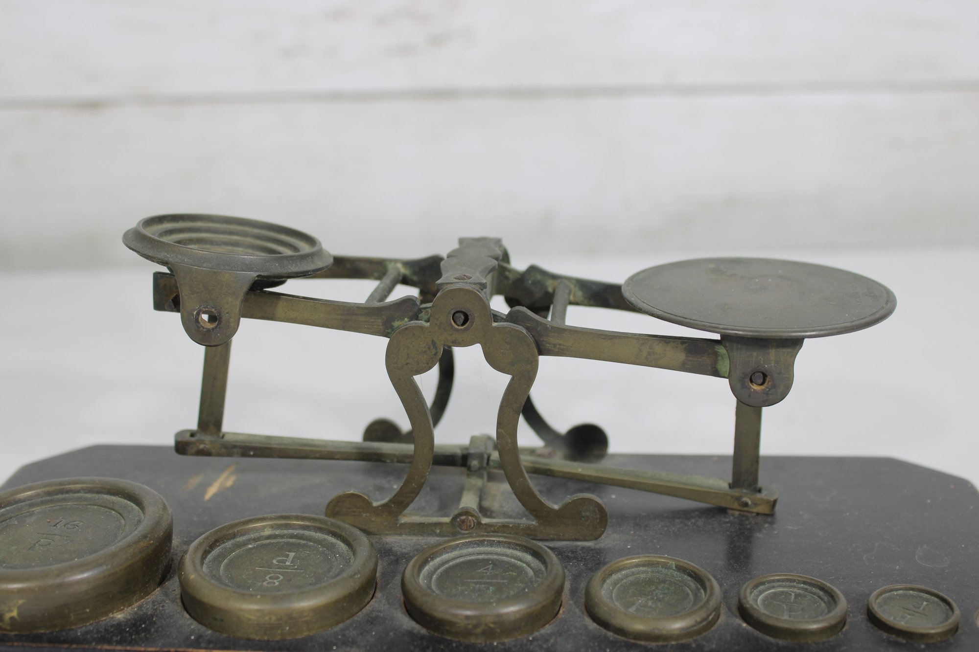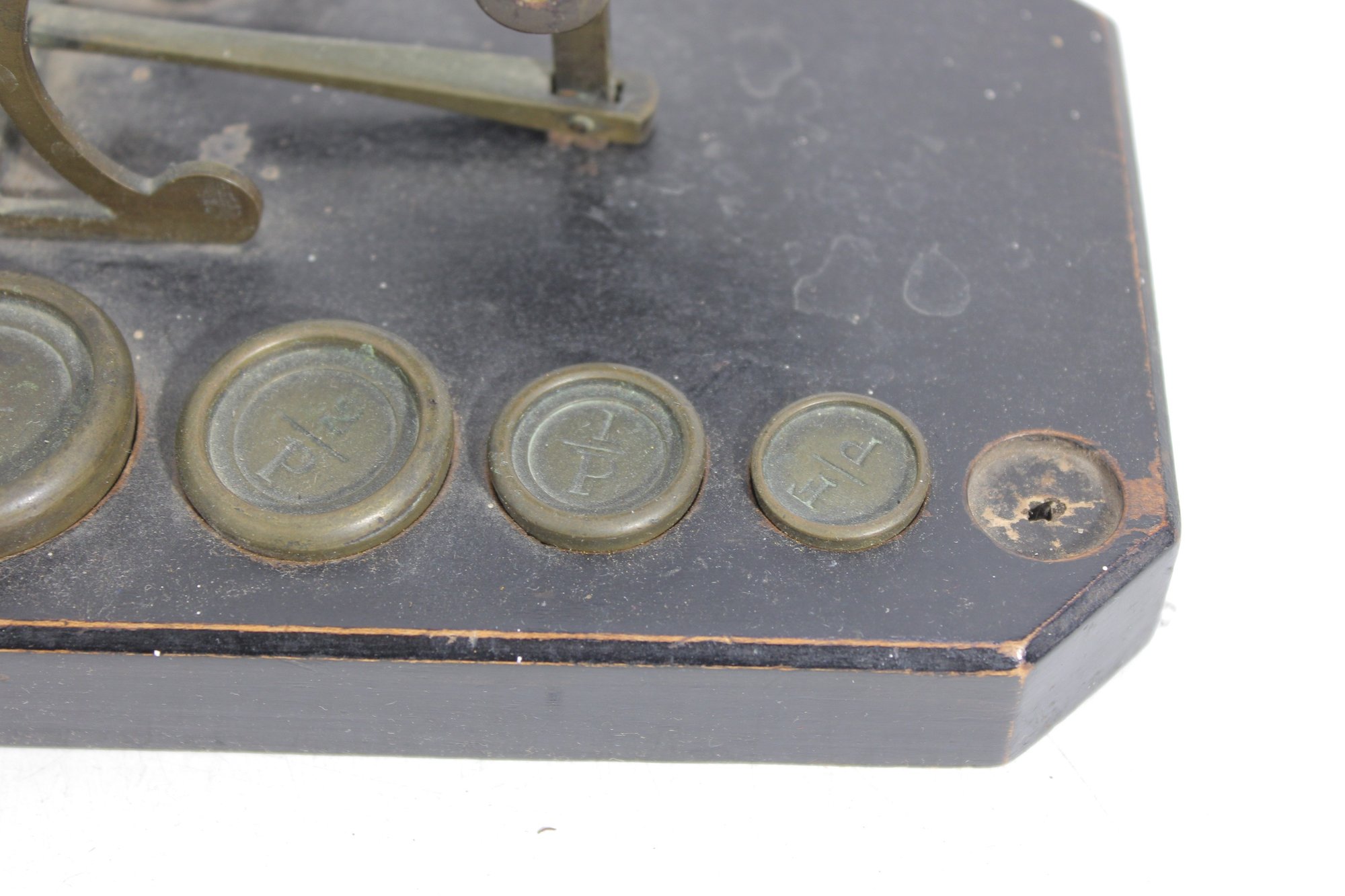 Charming antique brass balance scale mounted on a rectangular base, complete with a set of graduated weights. This classic piece features a traditional double-pan design with decorative metalwork and a nicely aged patina that reflects its history and use.