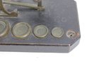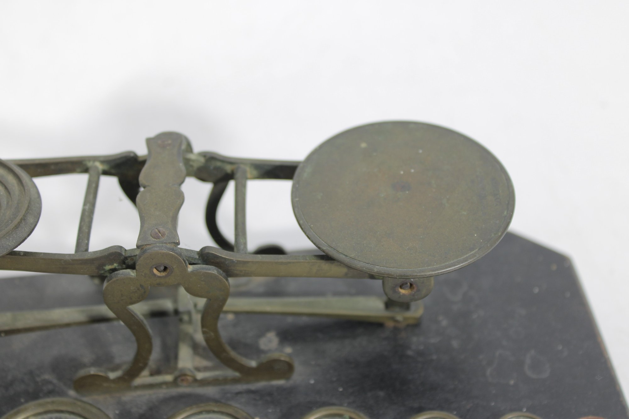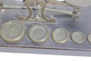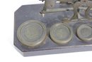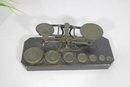 The set includes multiple round brass weights stored neatly on the base, making it both a functional collectible and an attractive display item. Perfect for collectors of scientific instruments, apothecary décor, or vintage office accents.