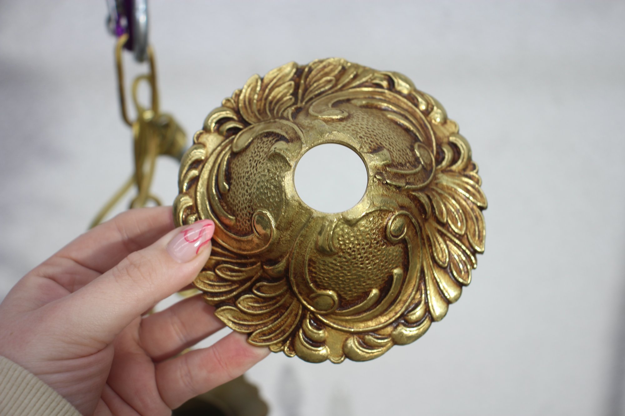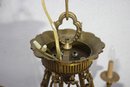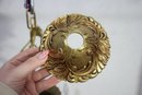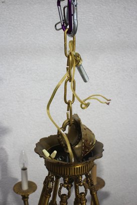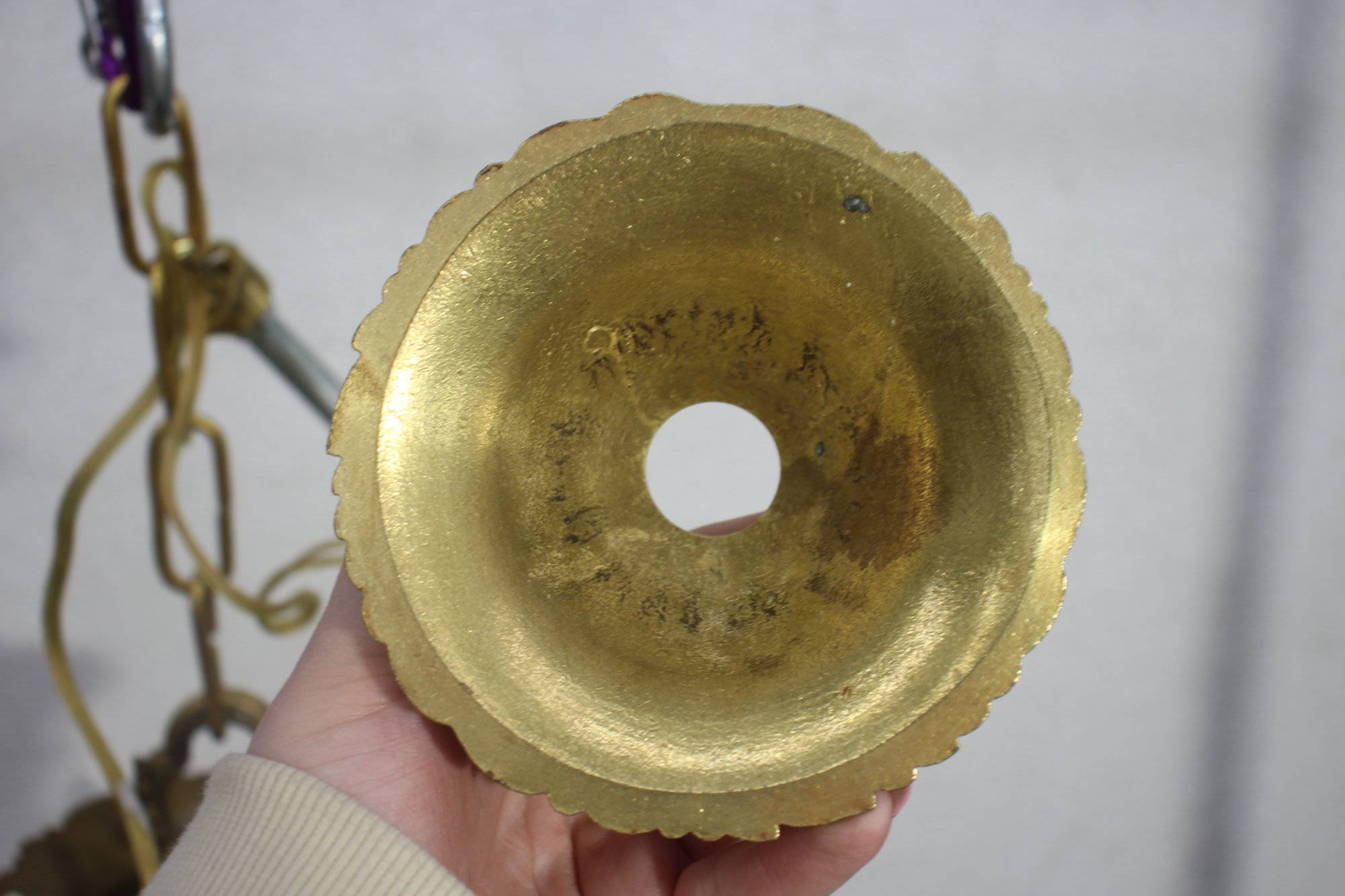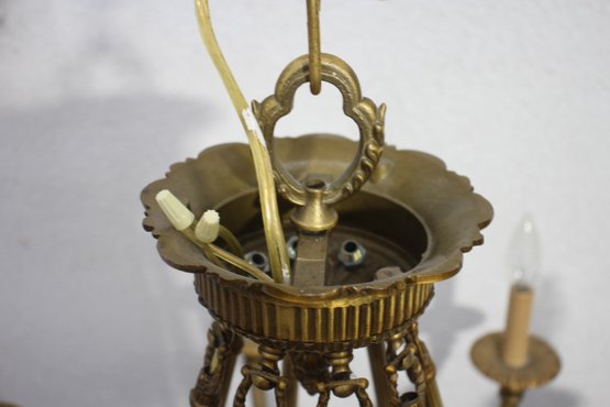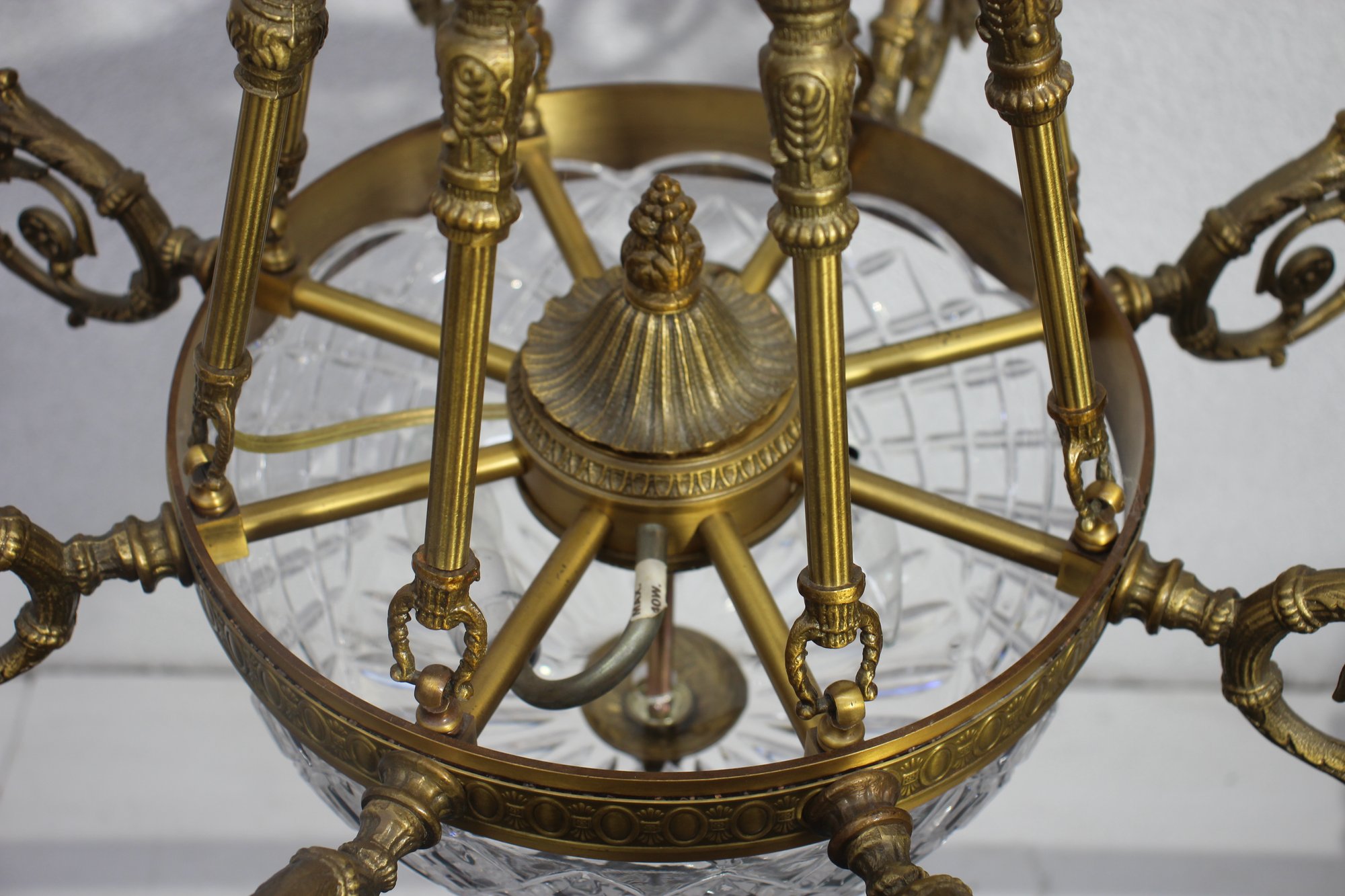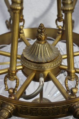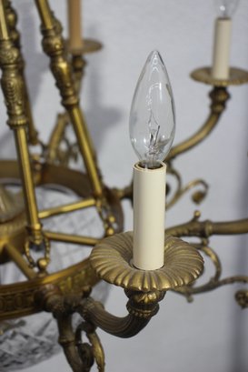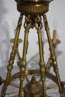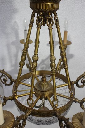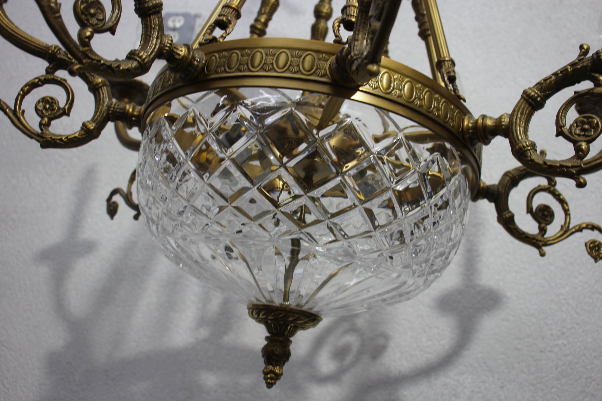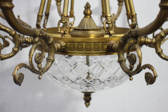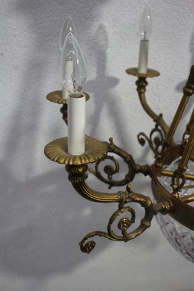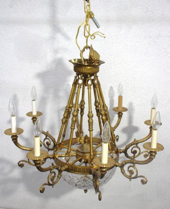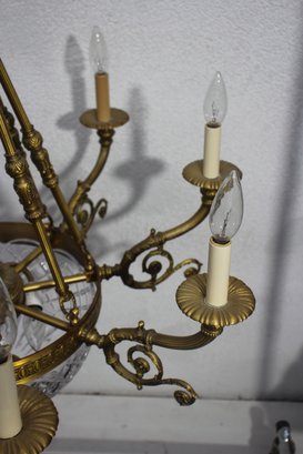This stunning antique brass chandelier features an elegant eight-light design, intricate scrollwork, and a beautiful cut crystal center bowl. A magnificent statement piece, perfect for adding vintage charm to any grand entryway, dining room, or historic home.