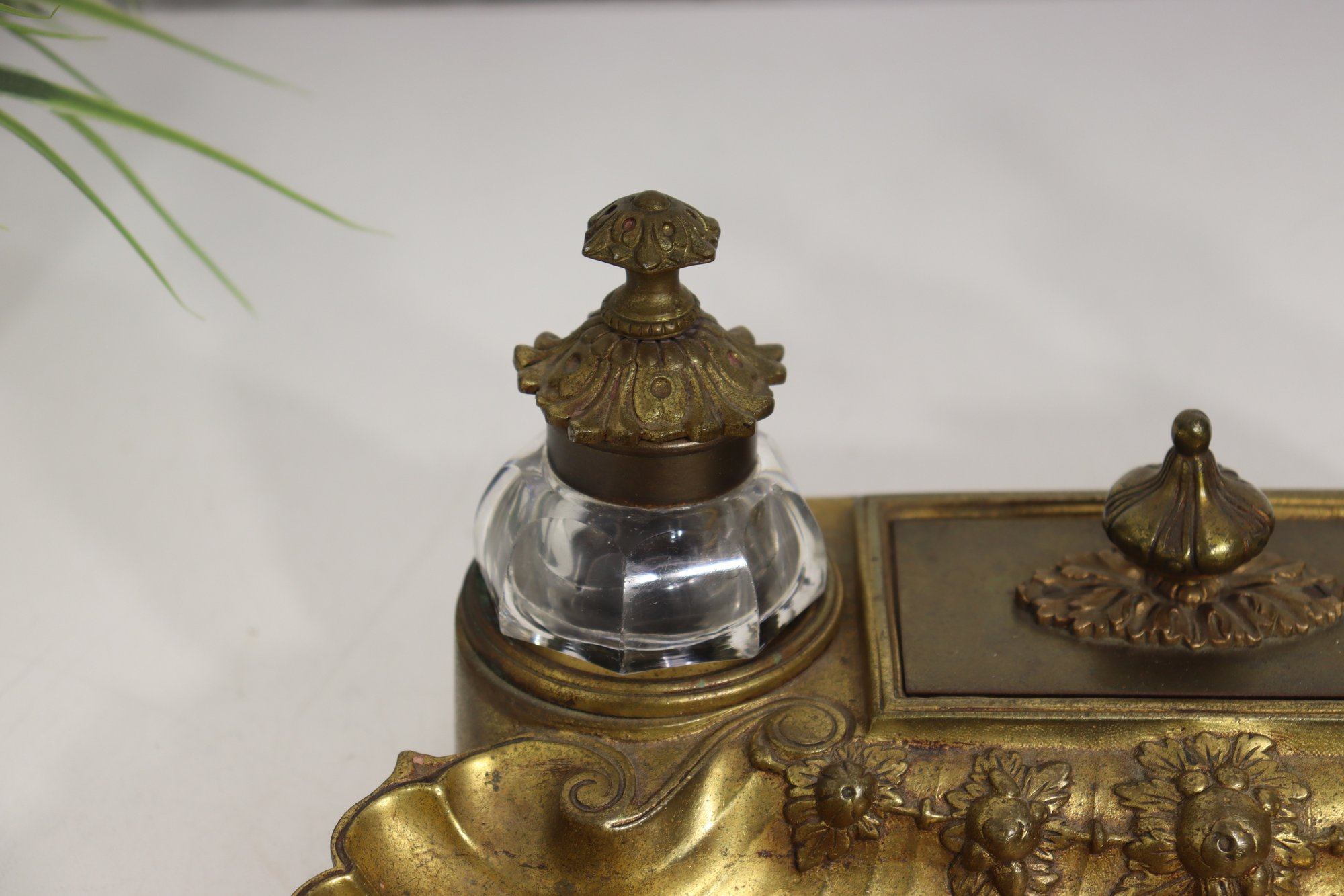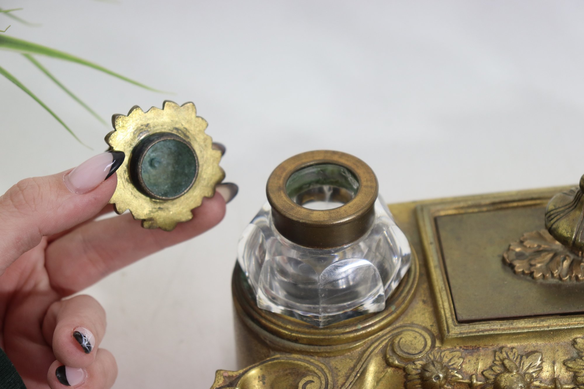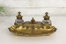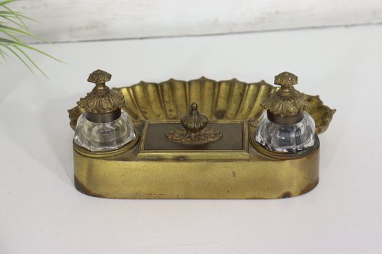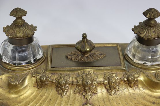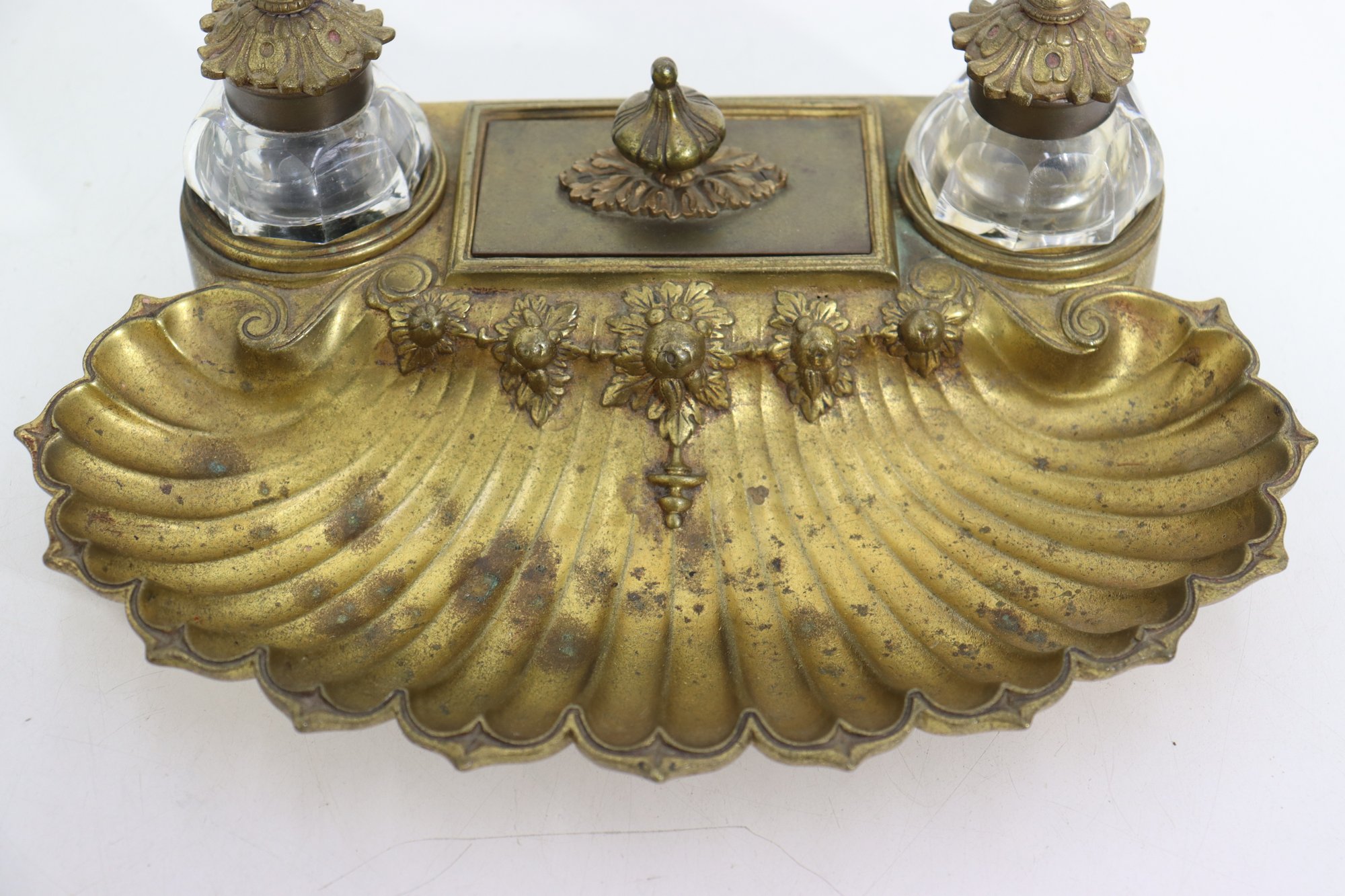 Beautiful antique brass double inkwell desk set featuring two glass inkwell inserts with ornate decorative brass lids and a center lift-top compartment (great for nibs, stamps, etc.). The front shell-form design creates a stunning Victorian style display piece with rich detail and patina throughout.