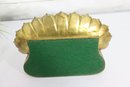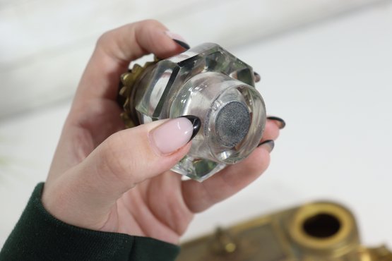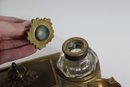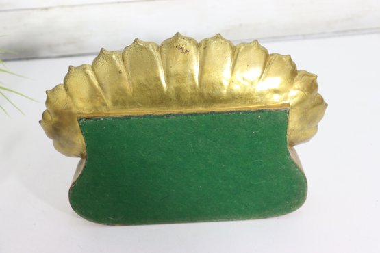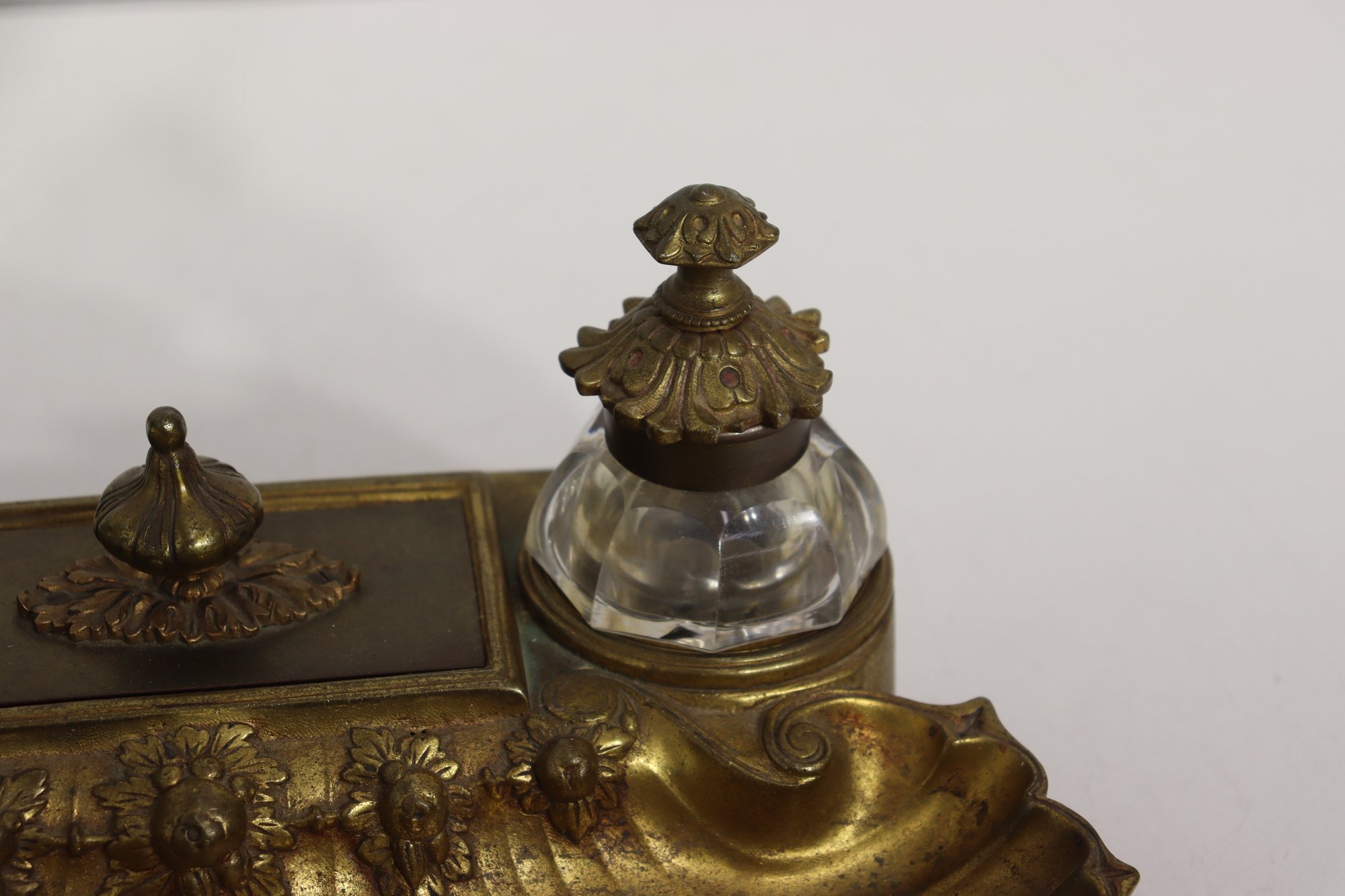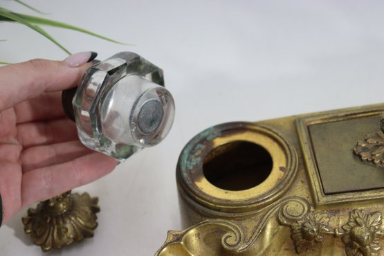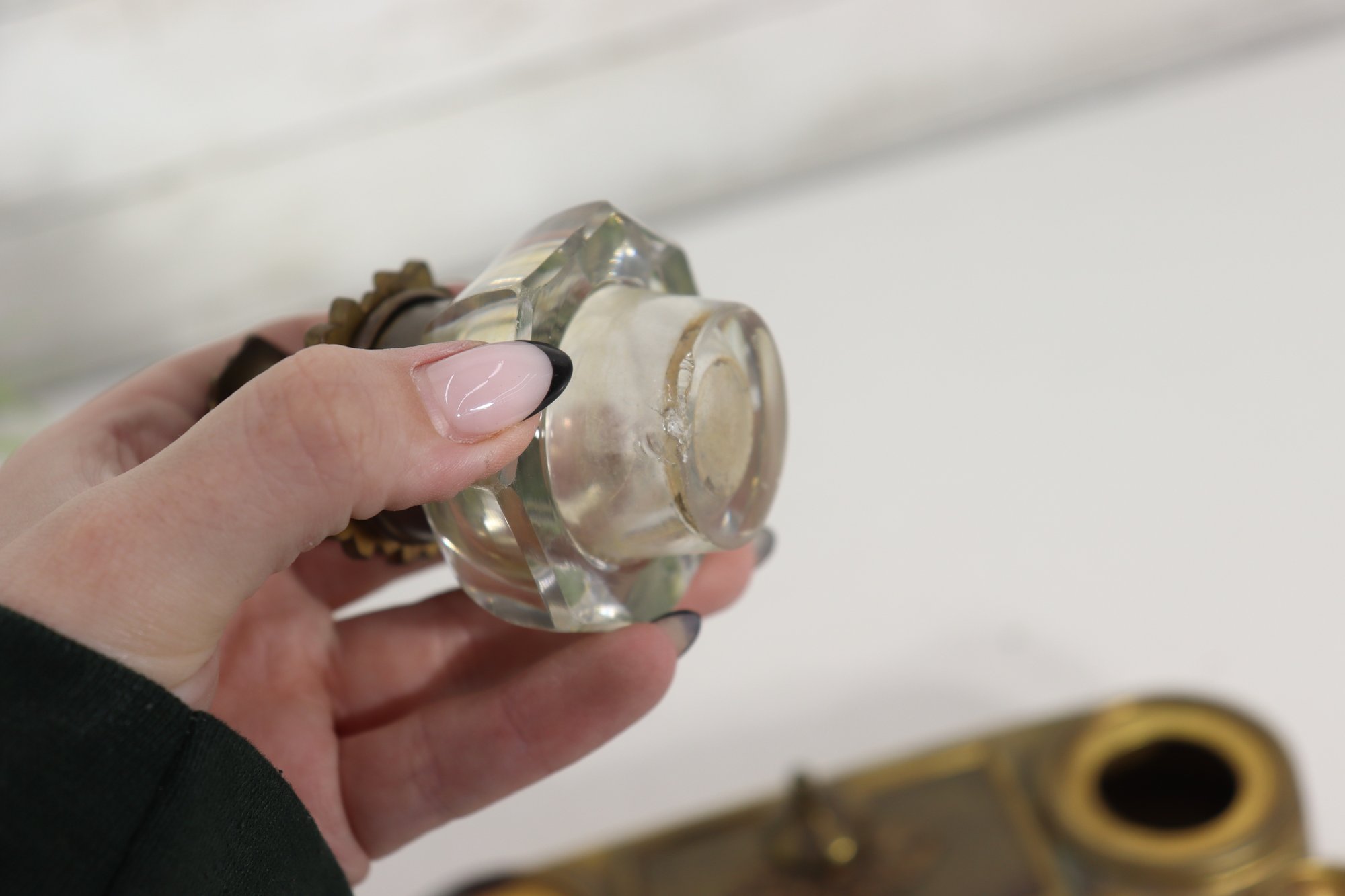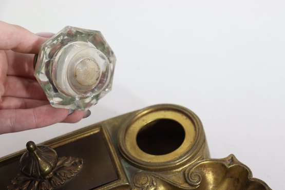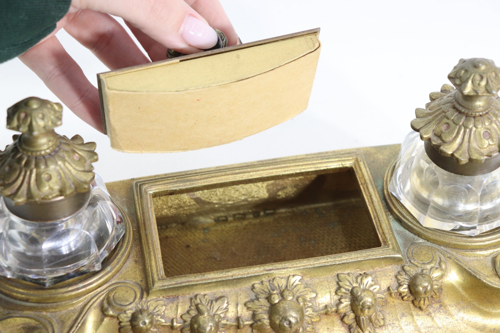 Beautiful antique brass double inkwell desk set featuring two glass inkwell inserts with ornate decorative brass lids and a center lift-top compartment (great for nibs, stamps, etc.). The front shell-form design creates a stunning Victorian style display piece with rich detail and patina throughout.