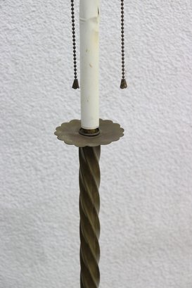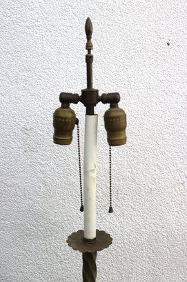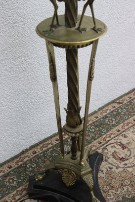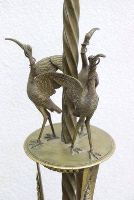 Beautiful antique brass floor lamp featuring an elegant and detailed design. The lamp showcases two sculpted cranes standing gracefully around the central column, adding a touch of Art Deco and Asian-inspired charm. The twisted column design leads up to a double-socket light fixture with pull chains, allowing for adjustable lighting.