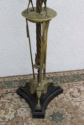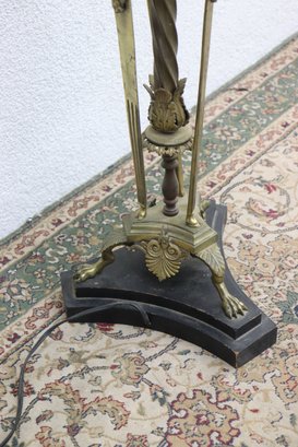 This lamp sits on a sturdy three-legged base with claw feet and intricate decorative accents, showing fine craftsmanship throughout. It appears to retain its original patina, giving it an authentic vintage character. The wiring is functional and the lamp lights up as shown in the photos.