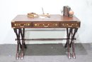 This antique campaign-style writing desk is a stunning example of fine craftsmanship, featuring brass inlay details on the solid wood top and drawer fronts. The X-leg base with turned supports gives this piece a distinguished, classic appeal. With three spacious drawers accented by brass pulls and corner brackets, this desk blends functionality with timeless design.