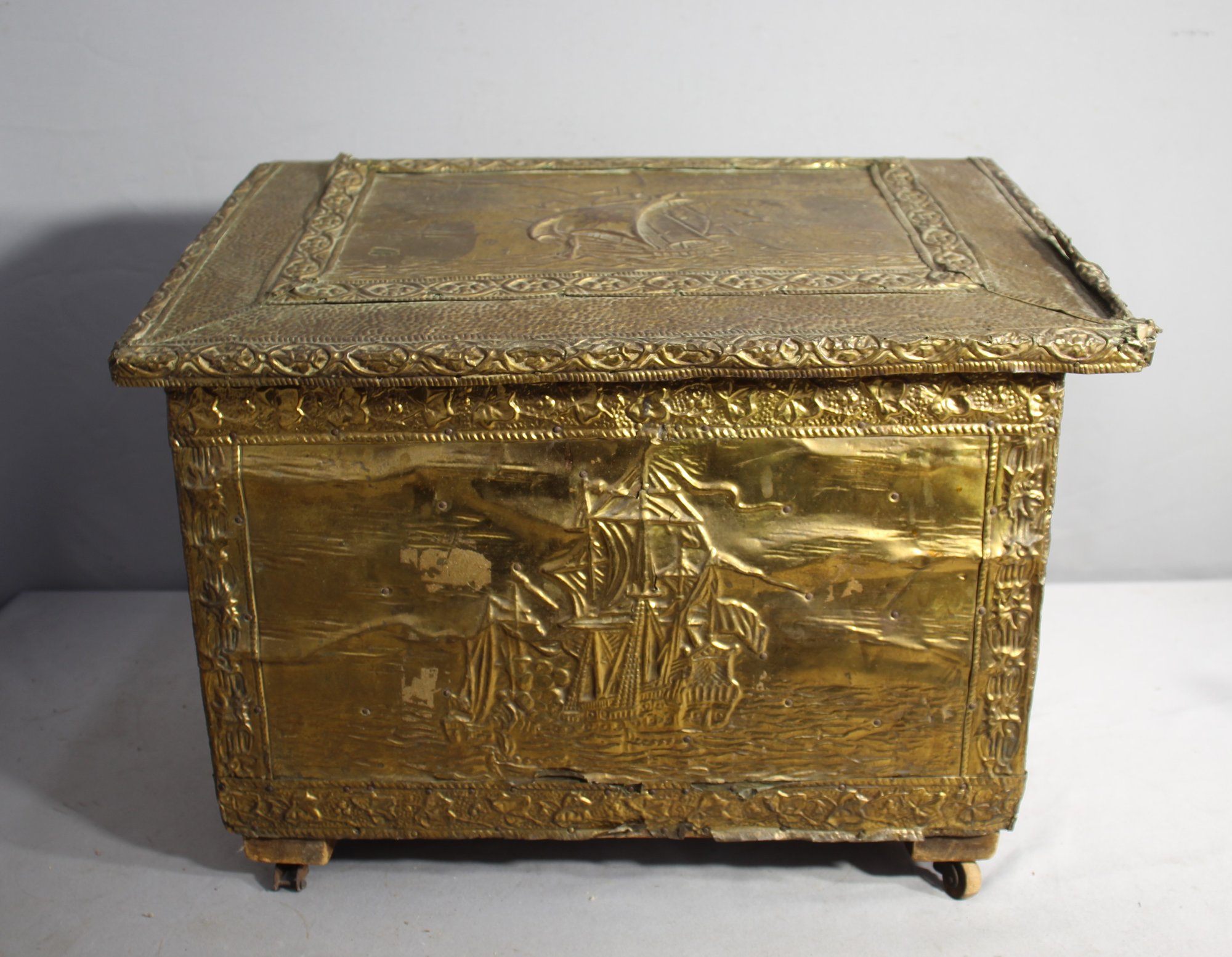 Embrace the charm of yesteryear with this antique fire box, a unique find perfect for collectors and decor enthusiasts. Crafted with a brass overlay, this piece features intricate embossed scenes of maritime adventures and ornate floral designs that bring a touch of nostalgia and artisanal craftsmanship to any setting. Standing on dainty feet, the box's wear and patina only add to its historical allure, making it not just a storage item but a conversation starter.