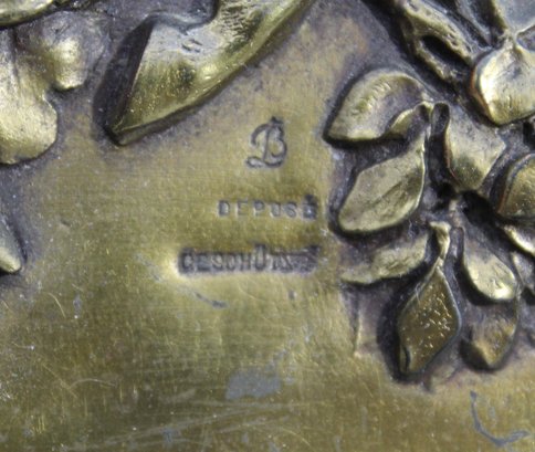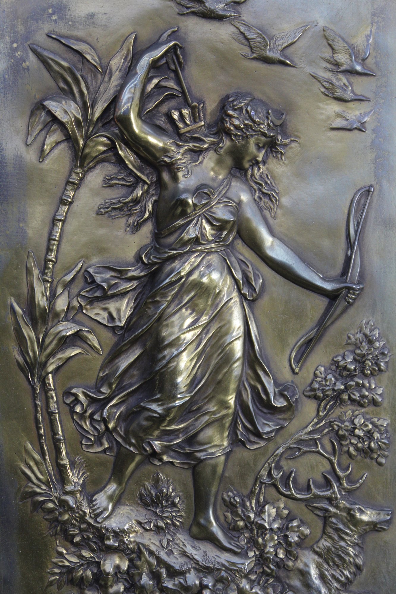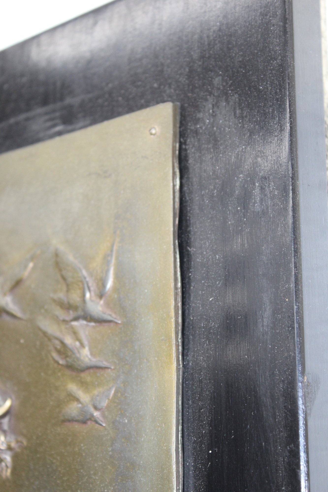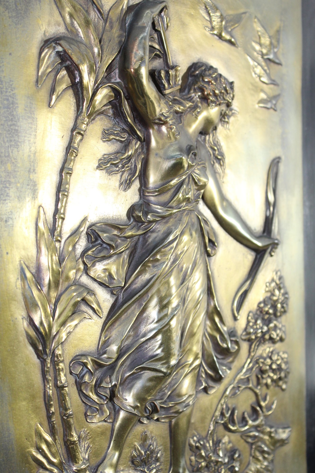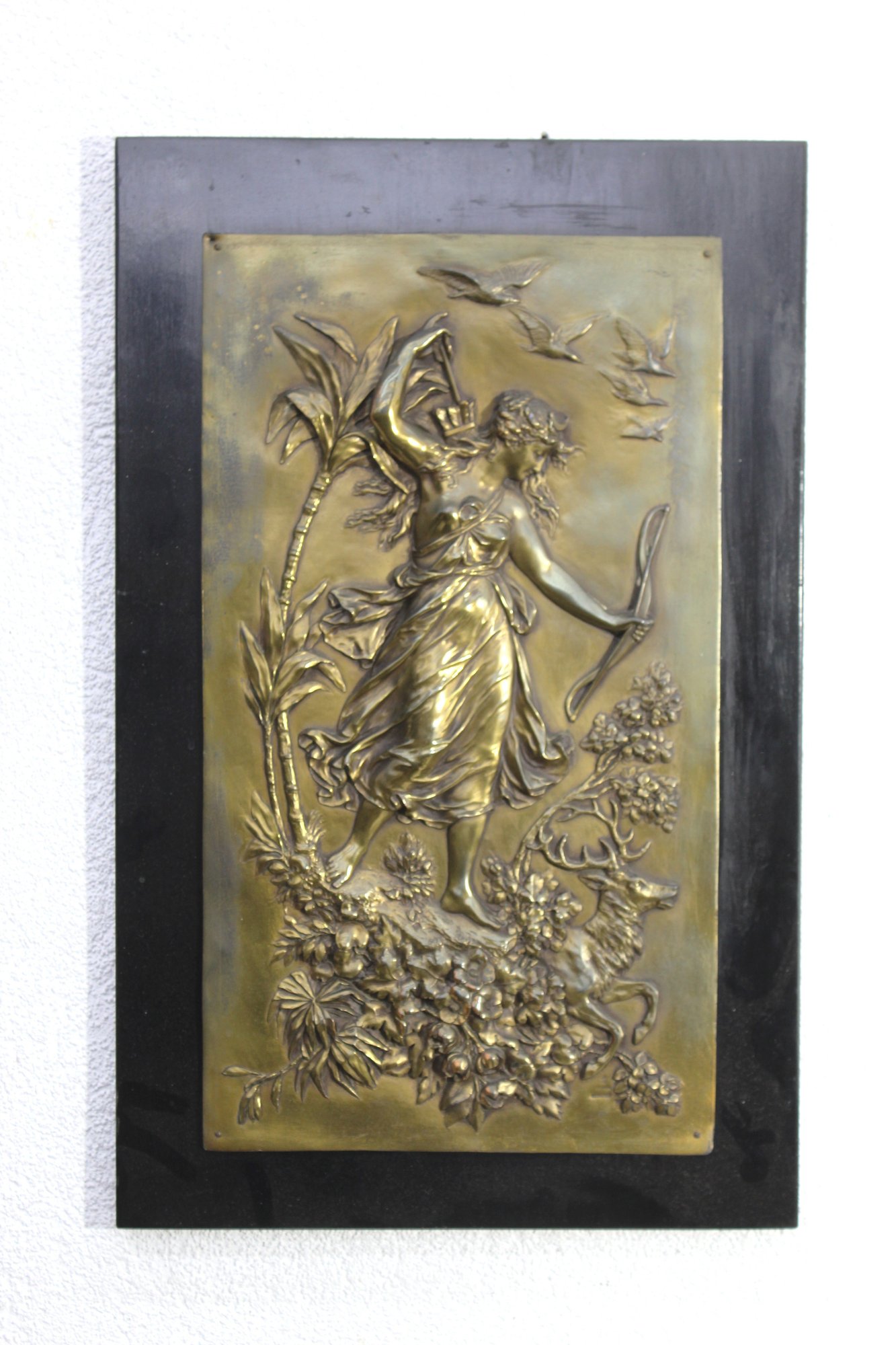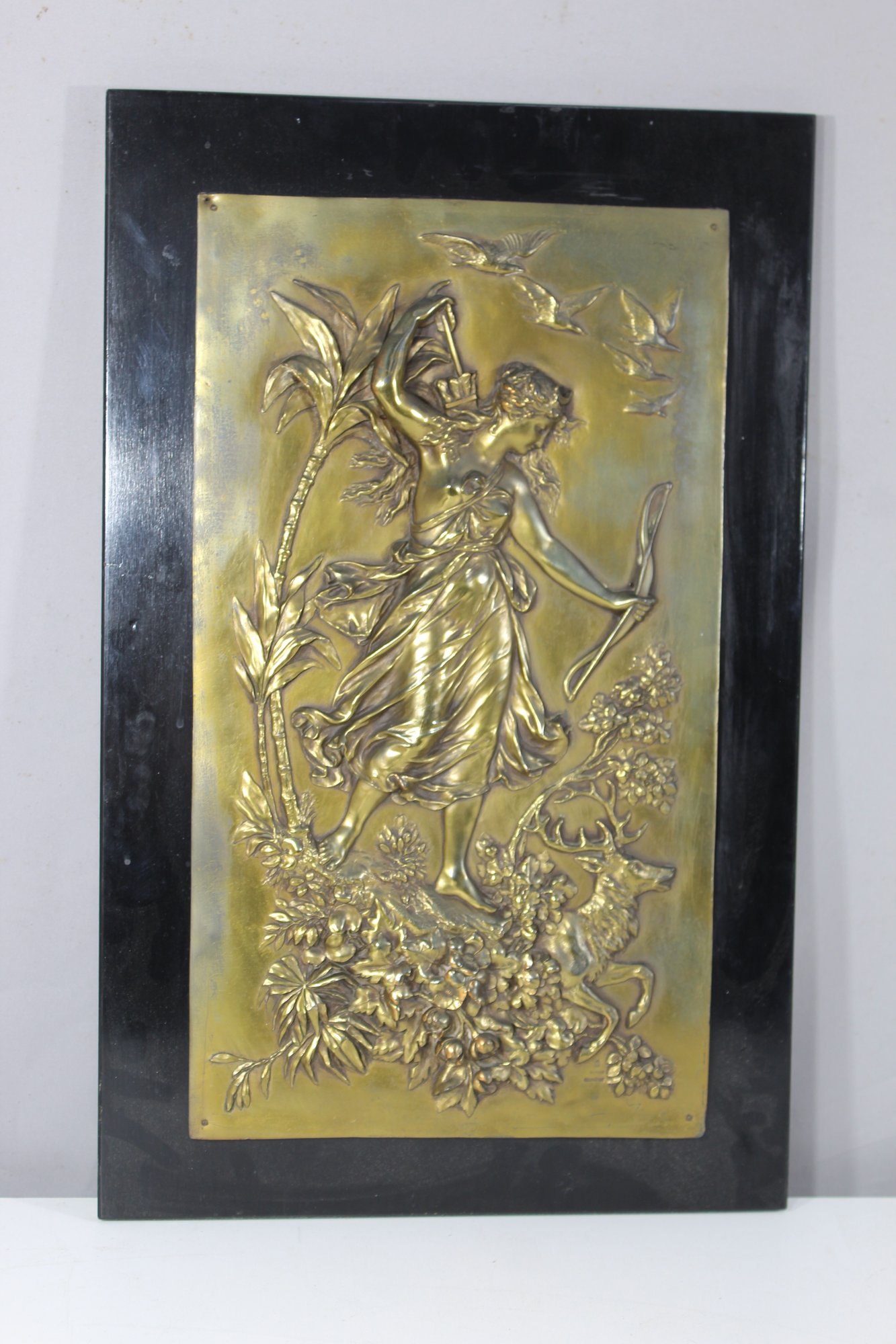 This exquisite antique brass relief wall plaque showcases a finely detailed depiction of a goddess in an elegant pose surrounded by natural elements such as birds and foliage. The plaque is mounted on a polished black wood frame, providing a striking contrast that enhances its timeless beauty.