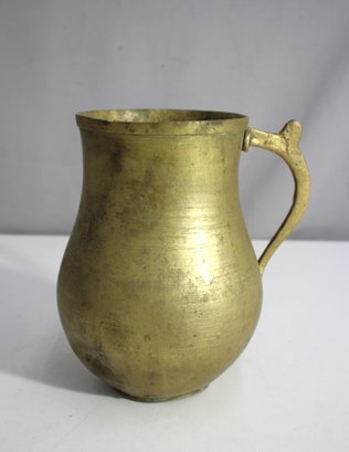 This auction features a charming 9-inch tall antique brass water pitcher with a gracefully curved handle. The pitcher showcases a simple yet classic design with a smooth finish and a rounded base, embodying vintage craftsmanship.