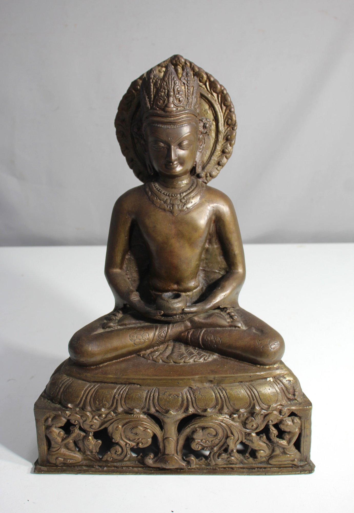 bronze Buddha statue exudes a sense of serenity and spirituality, depicting Buddha in a traditional meditative posture. The intricate detailing on the headdress, facial features, and the ornate base adds to the statue’s timeless appeal.