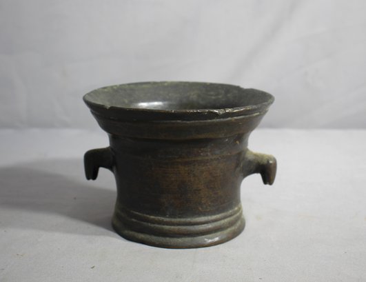 This robust piece, likely from the 18th to 19th century, was once a staple in pharmacies and kitchens for grinding and mixing herbs and spices. Its sturdy build, featuring two prominent side handles, suggests it was designed for frequent and practical use. Over the years, it has developed a mature patina that adds to its rich character and historic value