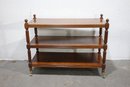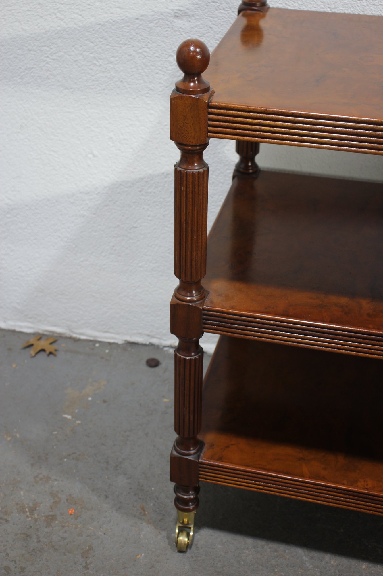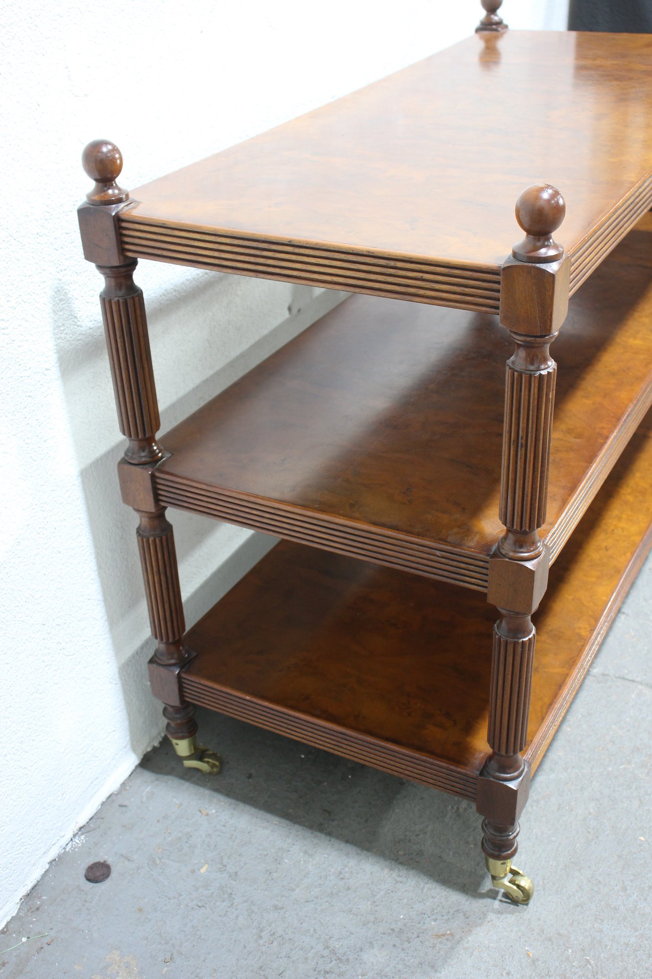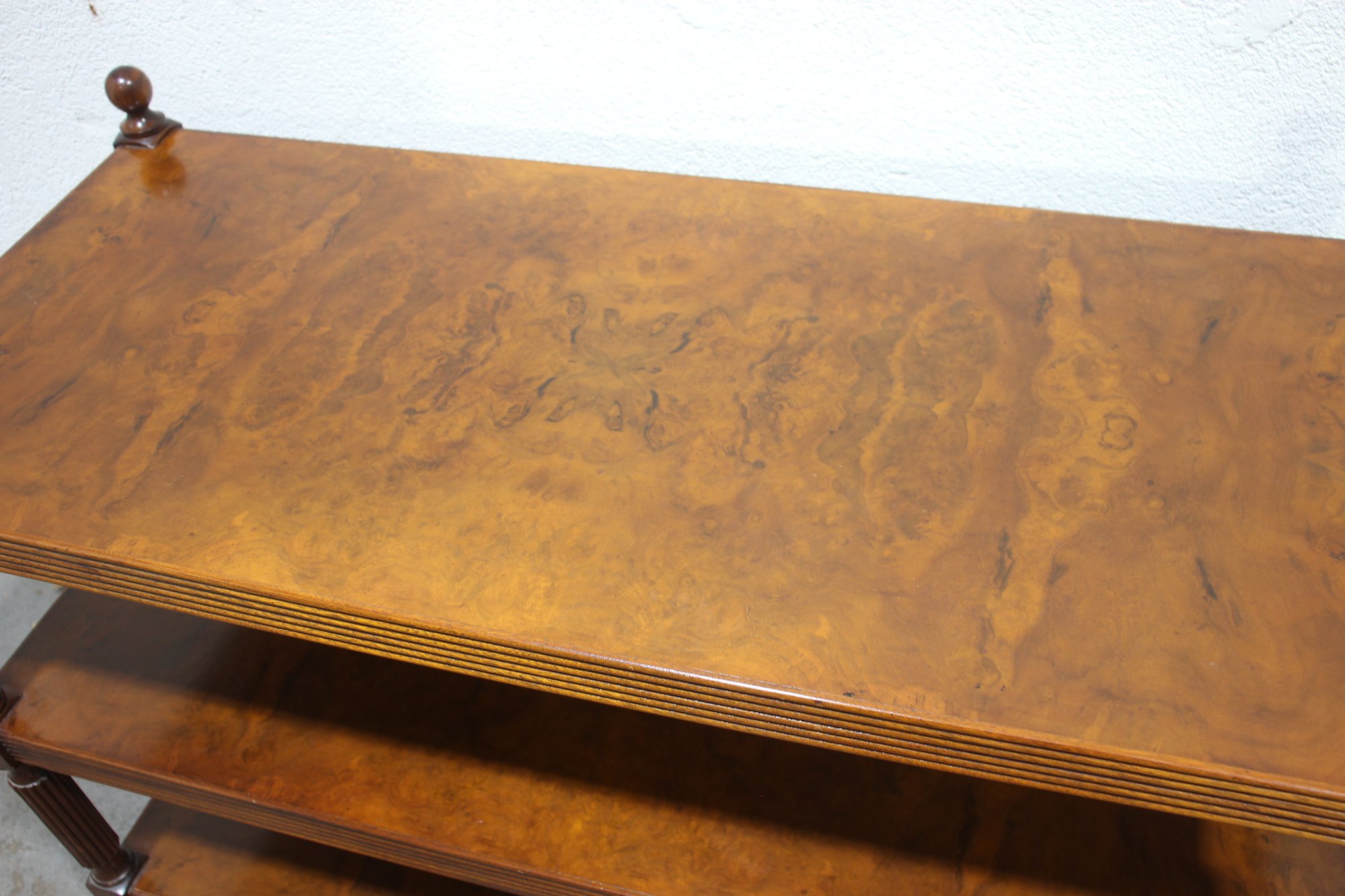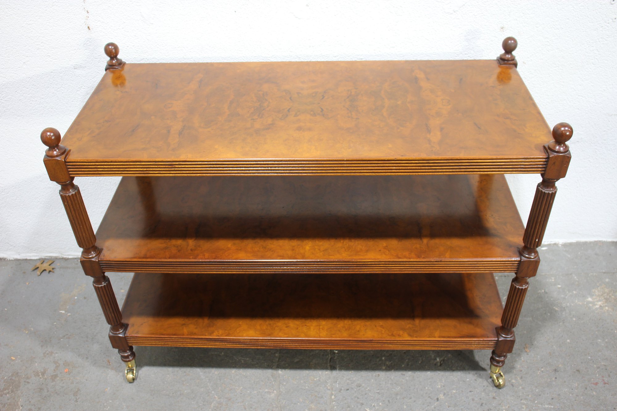 a stunning antique three-tiered serving cart, featuring a rich burl wood veneer finish and elegant turned legs. This beautifully crafted piece offers both functionality and vintage charm, perfect for use as a bar cart, display shelf, or sideboard.