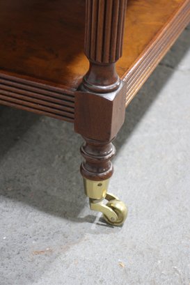 The top tier showcases a gorgeous burl wood grain with subtle inlaid details, while the lower shelves provide ample storage space for serving ware or decor. The cart is supported by four intricately turned legs capped with brass casters, allowing for easy mobility. Decorative finials on each corner complete the sophisticated design.
