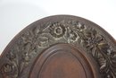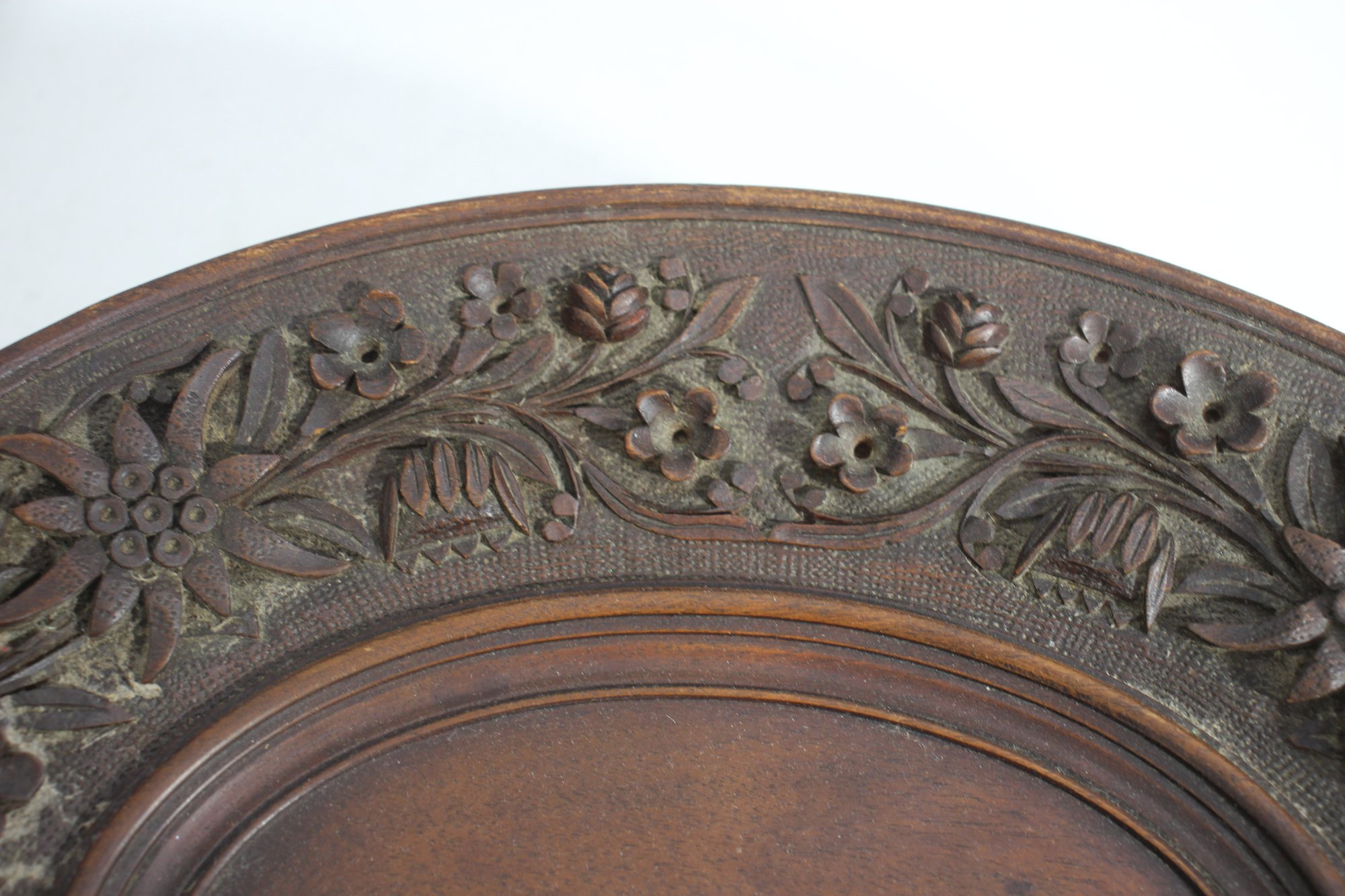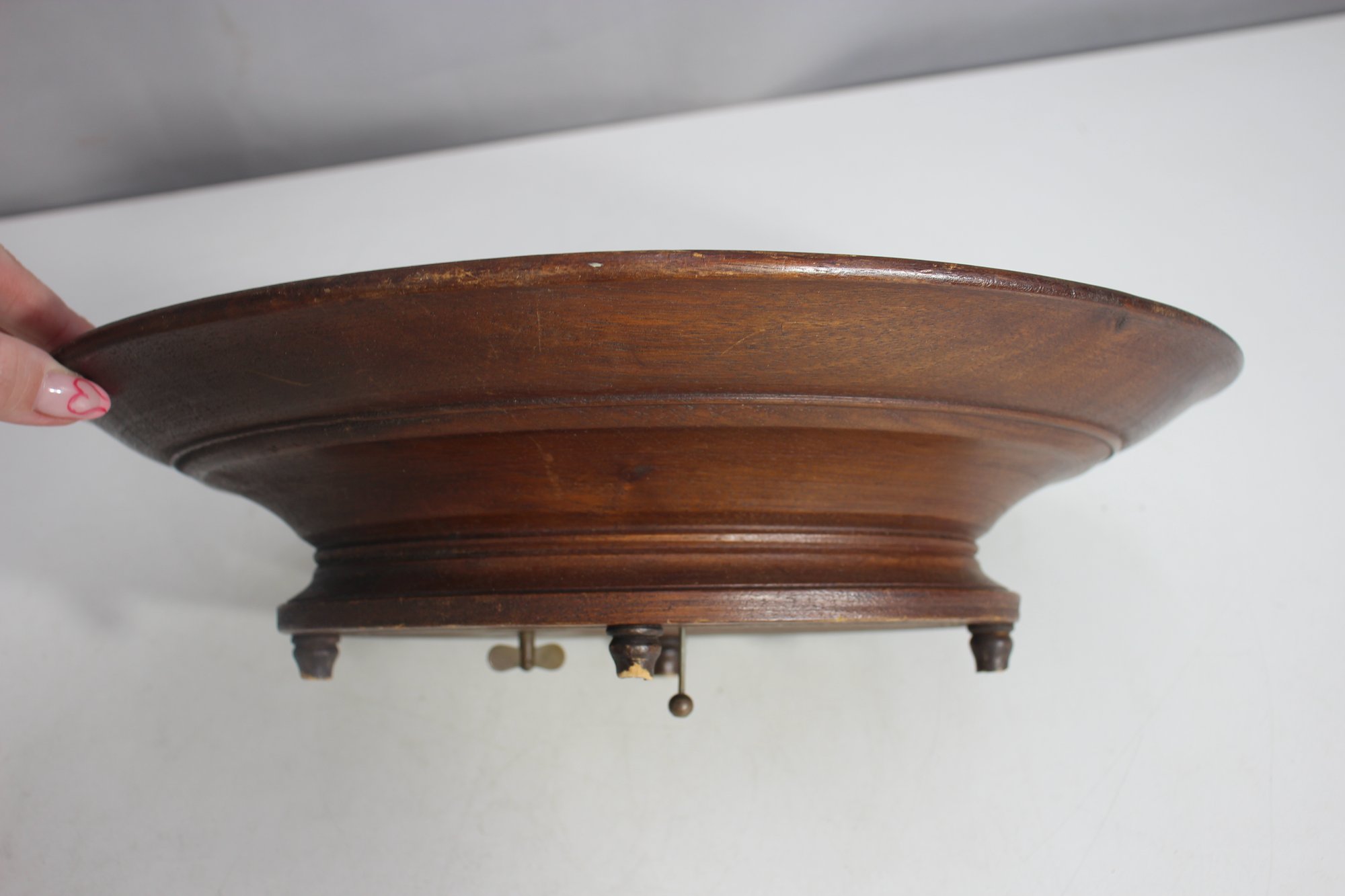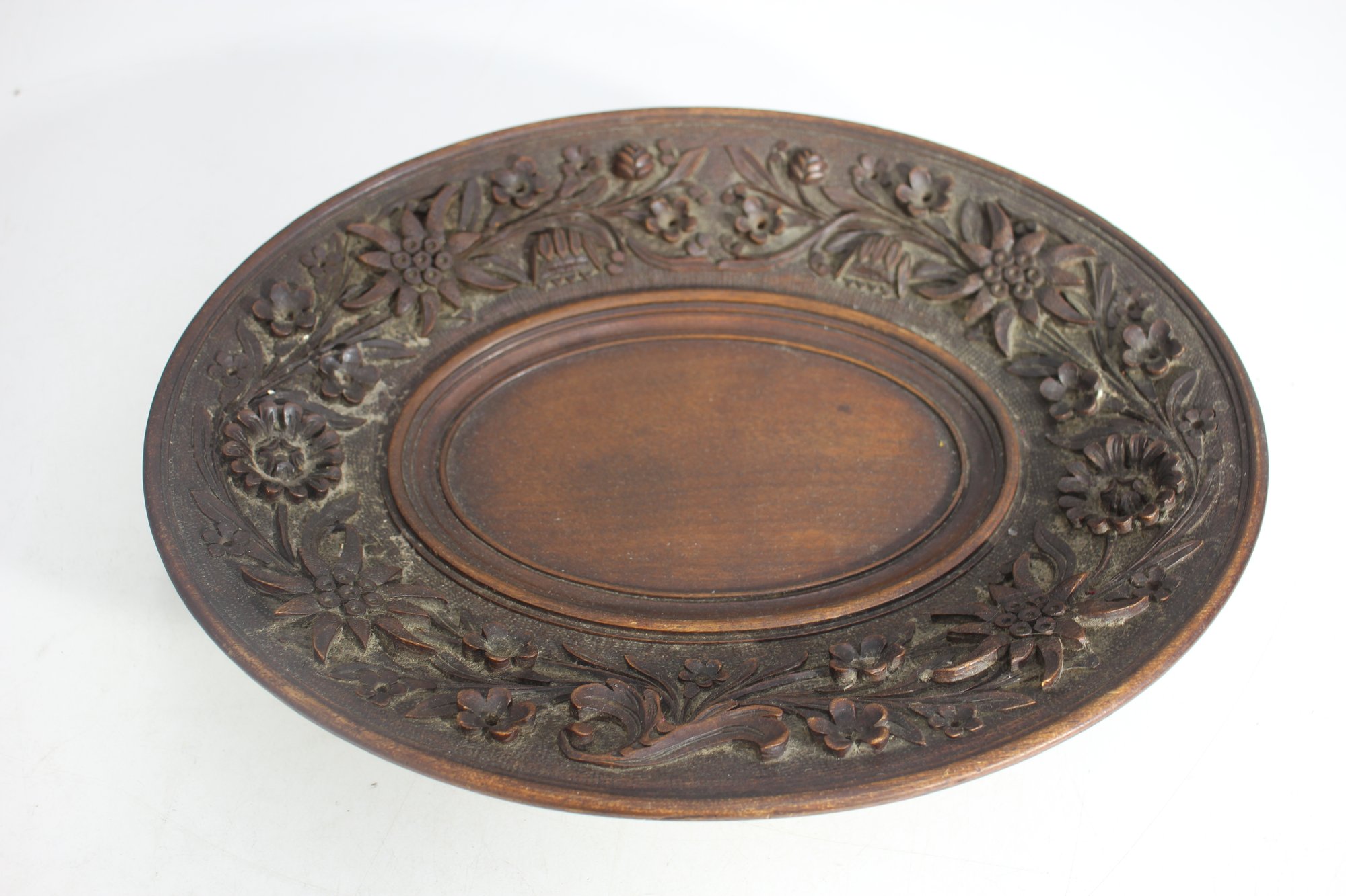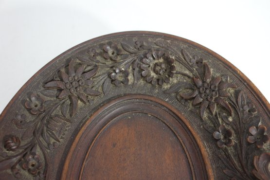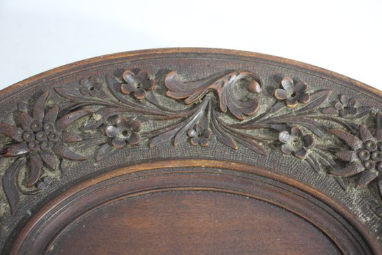 This beautiful antique wooden pedestal bowl features intricate hand-carved floral detailing around the rim and a raised base with small feet, giving it an elegant and timeless appeal.