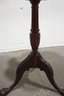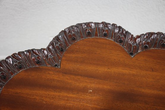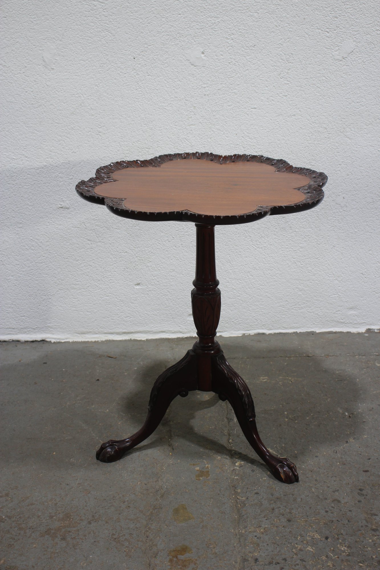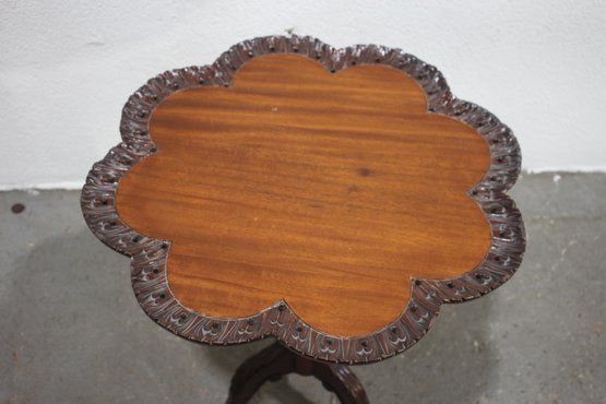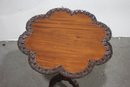 antique mahogany pie crust side table featuring exquisite craftsmanship and ornate detailing. The scalloped "pie crust" edge is intricately carved, highlighting the elegance of this timeless piece.