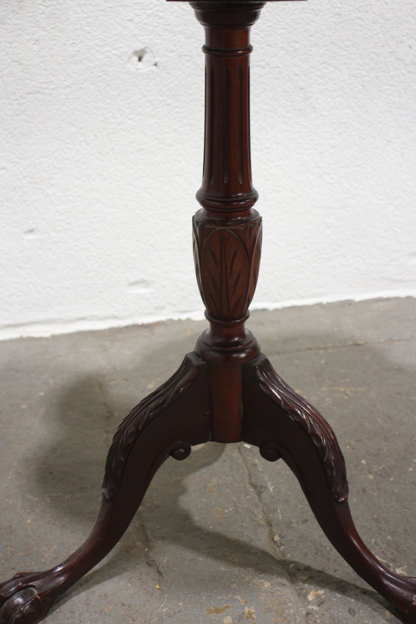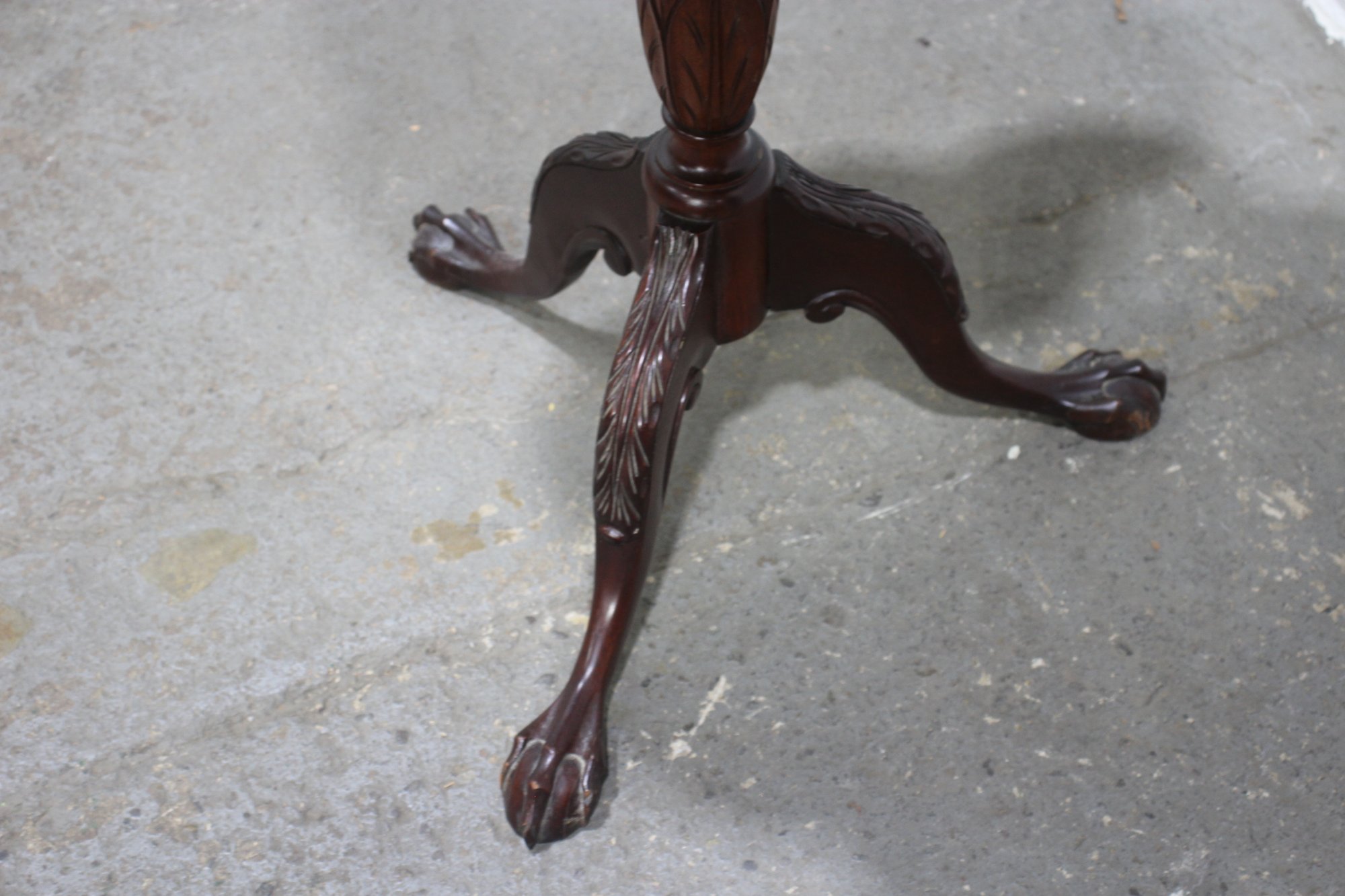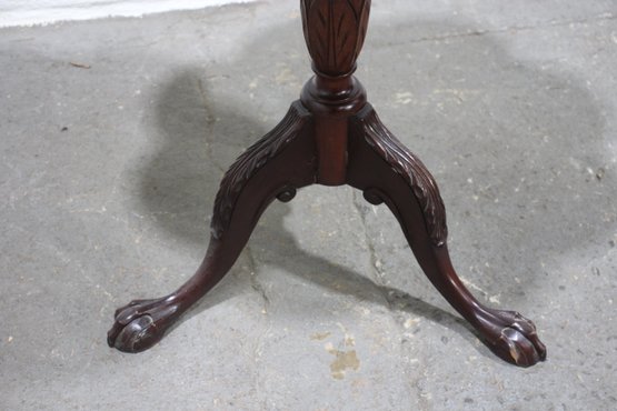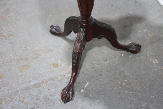 The pedestal base is equally impressive, with three claw feet and additional carved accents along the legs and support column. This piece would make a beautiful statement in a traditional or vintage-inspired setting, ideal for use as an accent table, plant stand, or display piece.