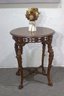 antique carved wood side table is a true statement piece, featuring ornate floral detailing, a round marquetry-inlaid top, and beautifully sculpted cabriole legs with claw feet. The rich craftsmanship and intricate lattice apron showcase European influences, making it an elegant addition to any Victorian, Rococo, or traditional-style interior.