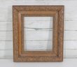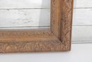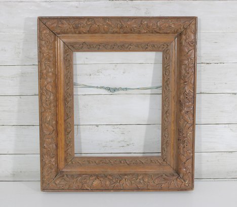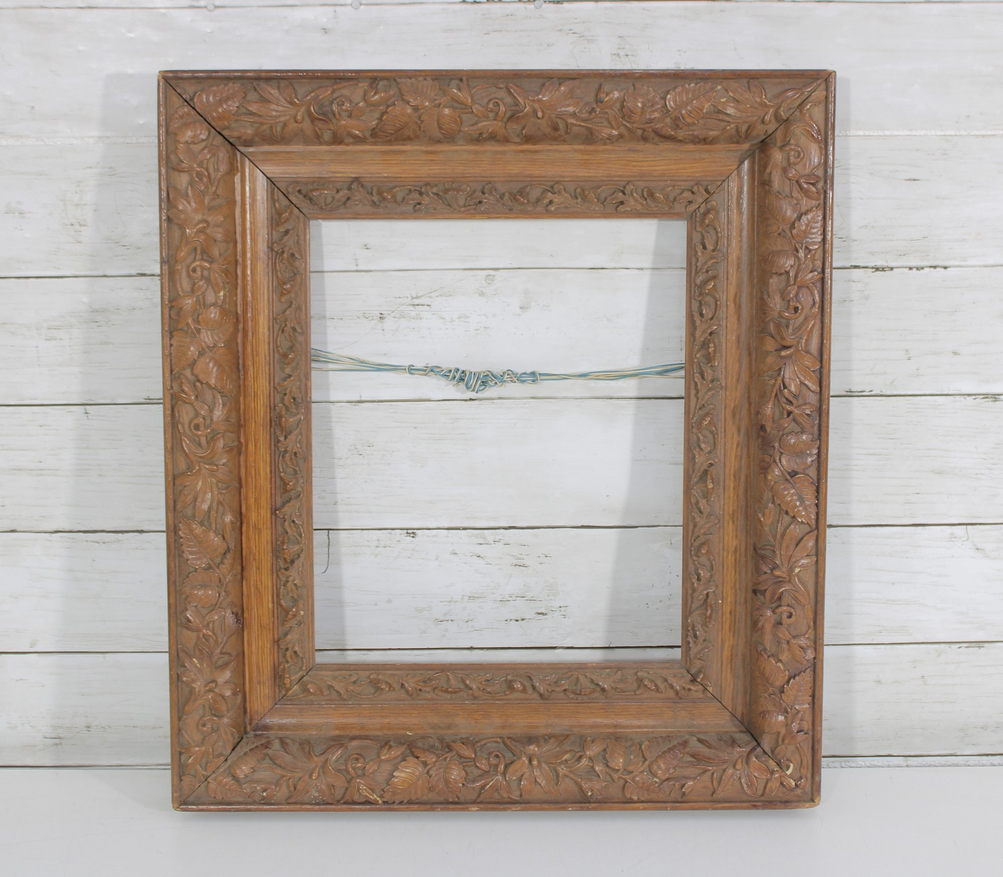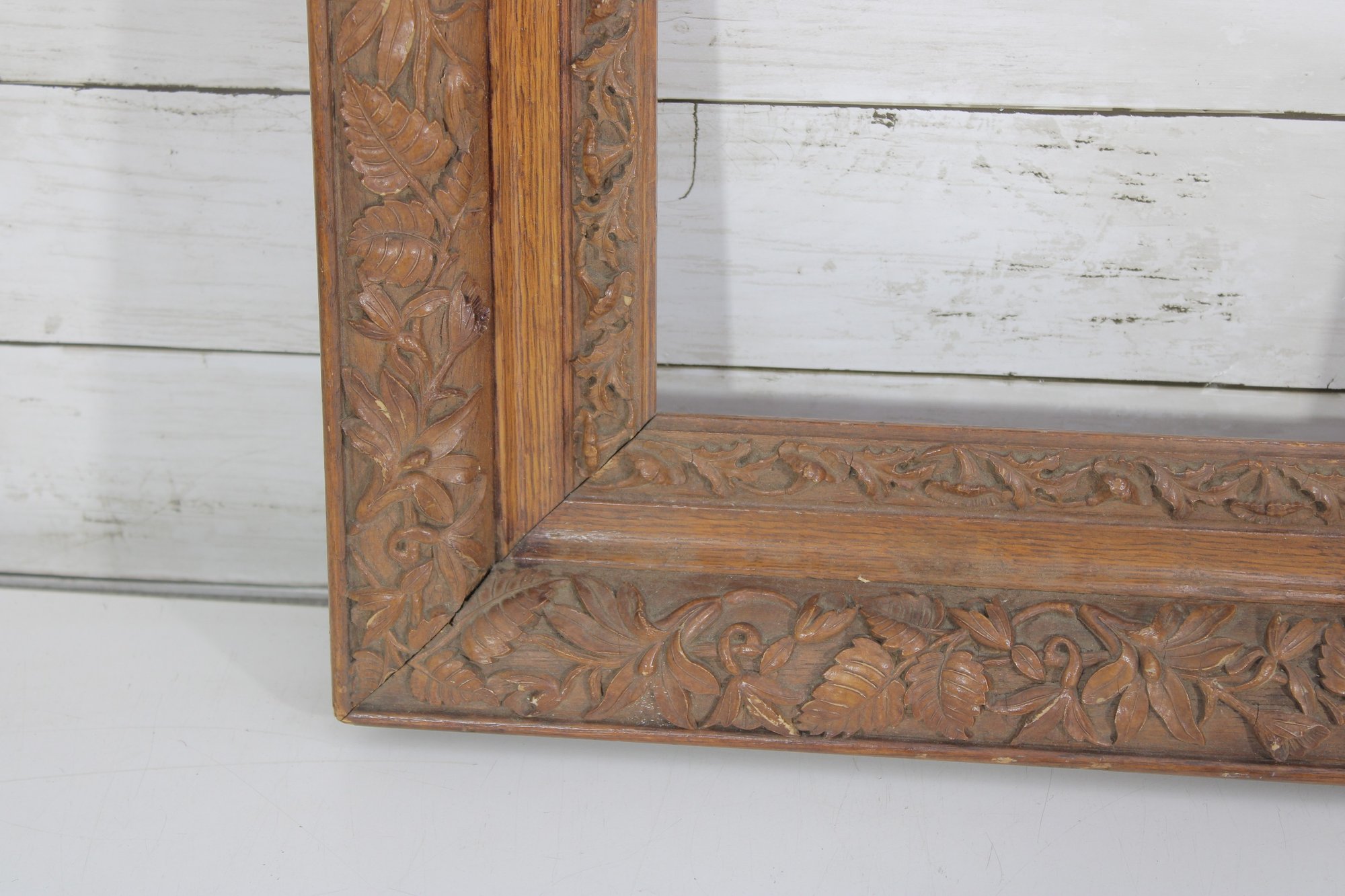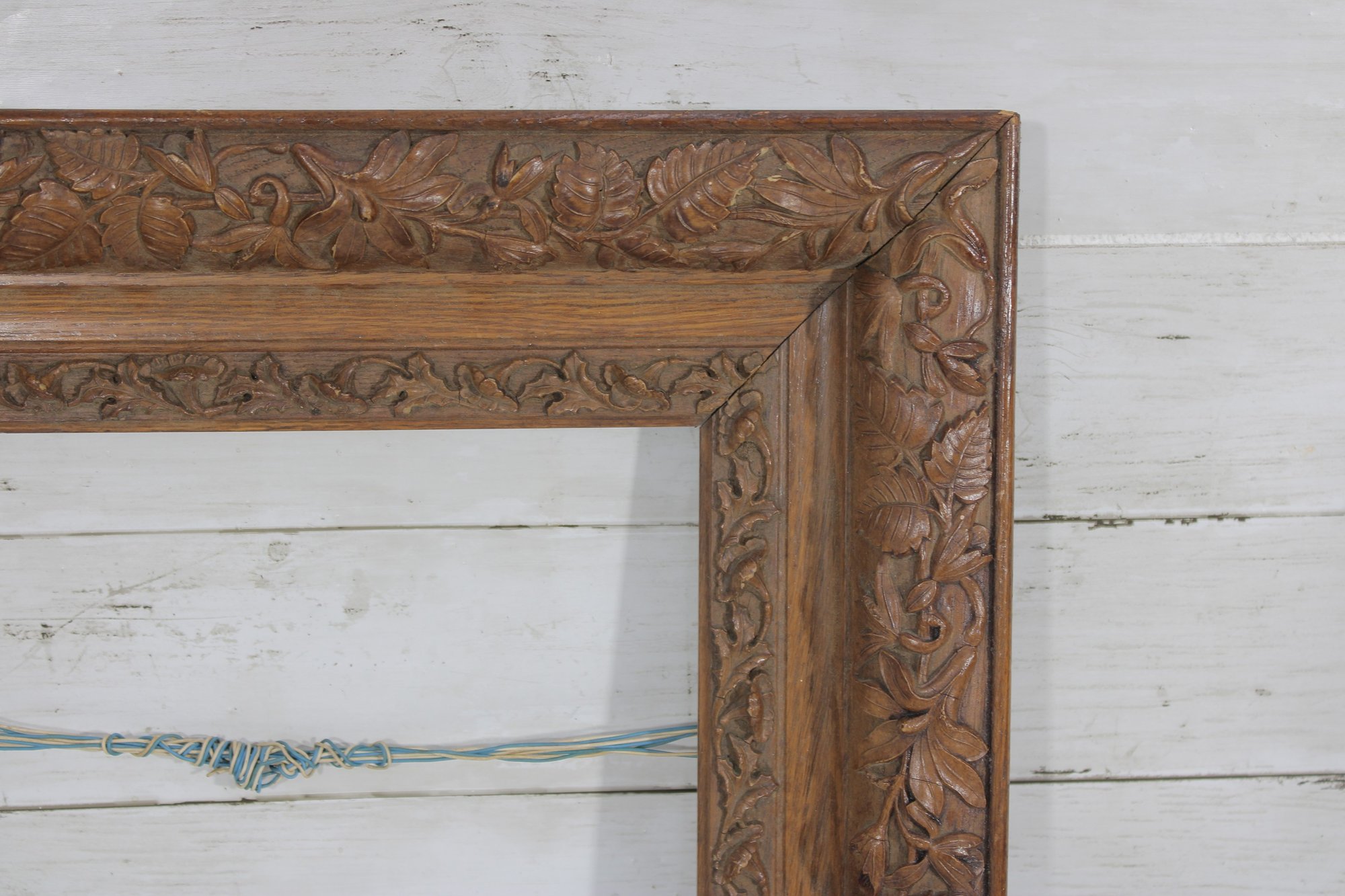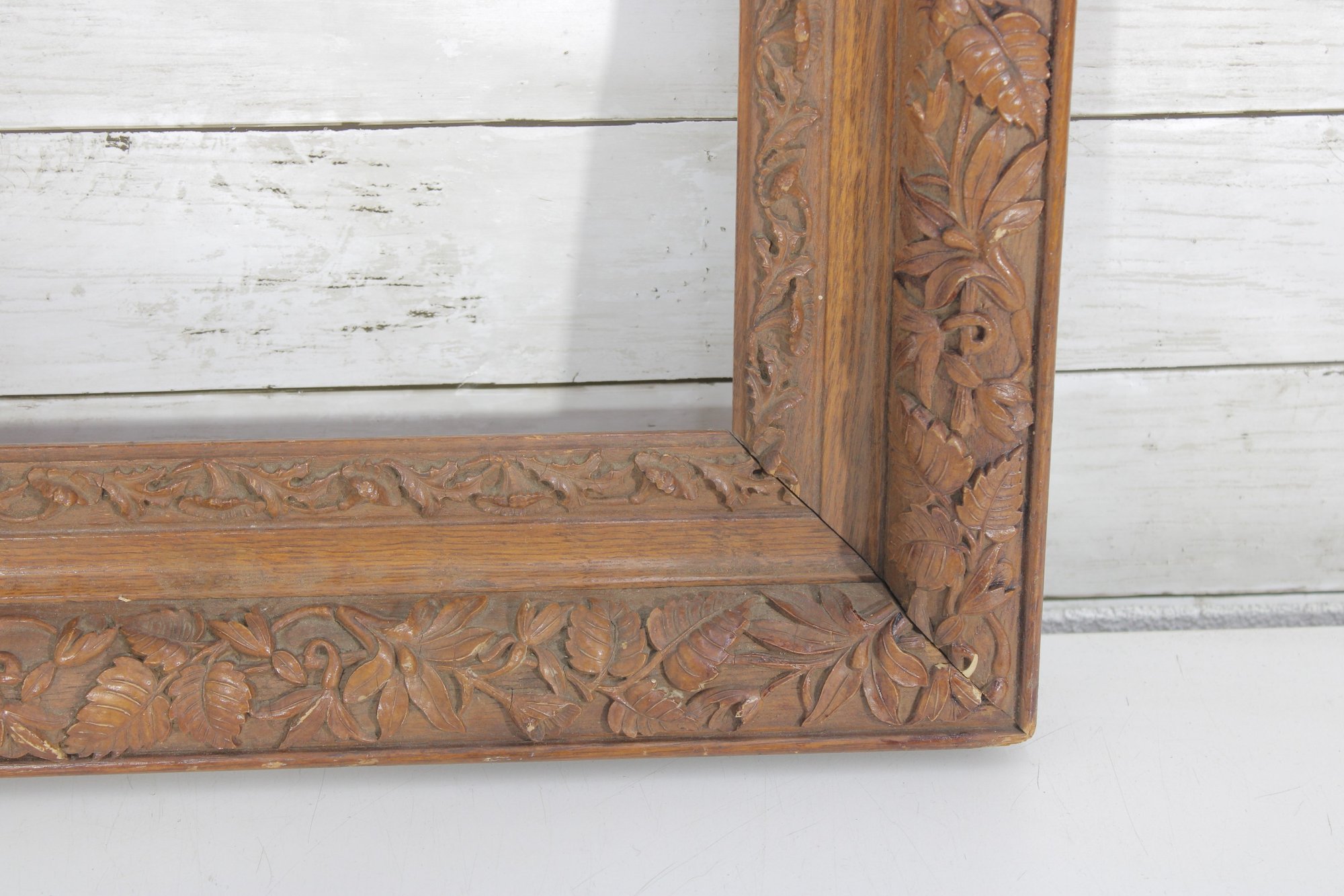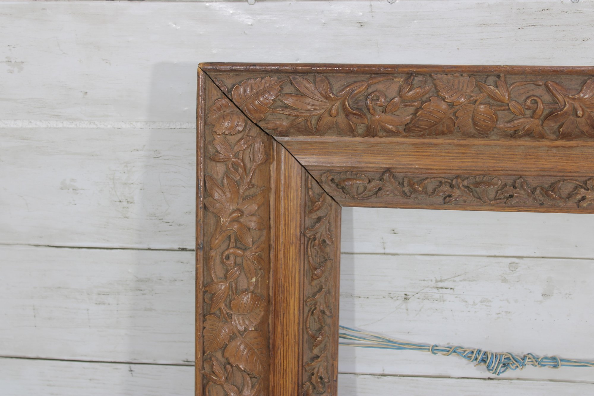 beautiful antique carved wood picture frame featuring detailed floral and foliate relief carving throughout the outer border. The frame measures approximately 19 inches x 16.5 inches overall.