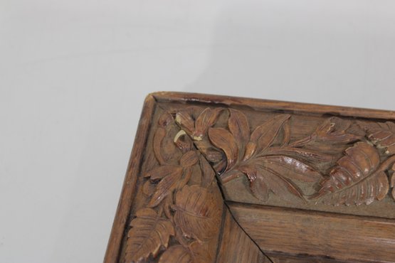 The wide molded frame showcases intricate hand-carved vine and leaf motifs, giving it wonderful depth and texture. The warm natural wood tone has a rich patina consistent with age, enhancing its rustic, old-world character.