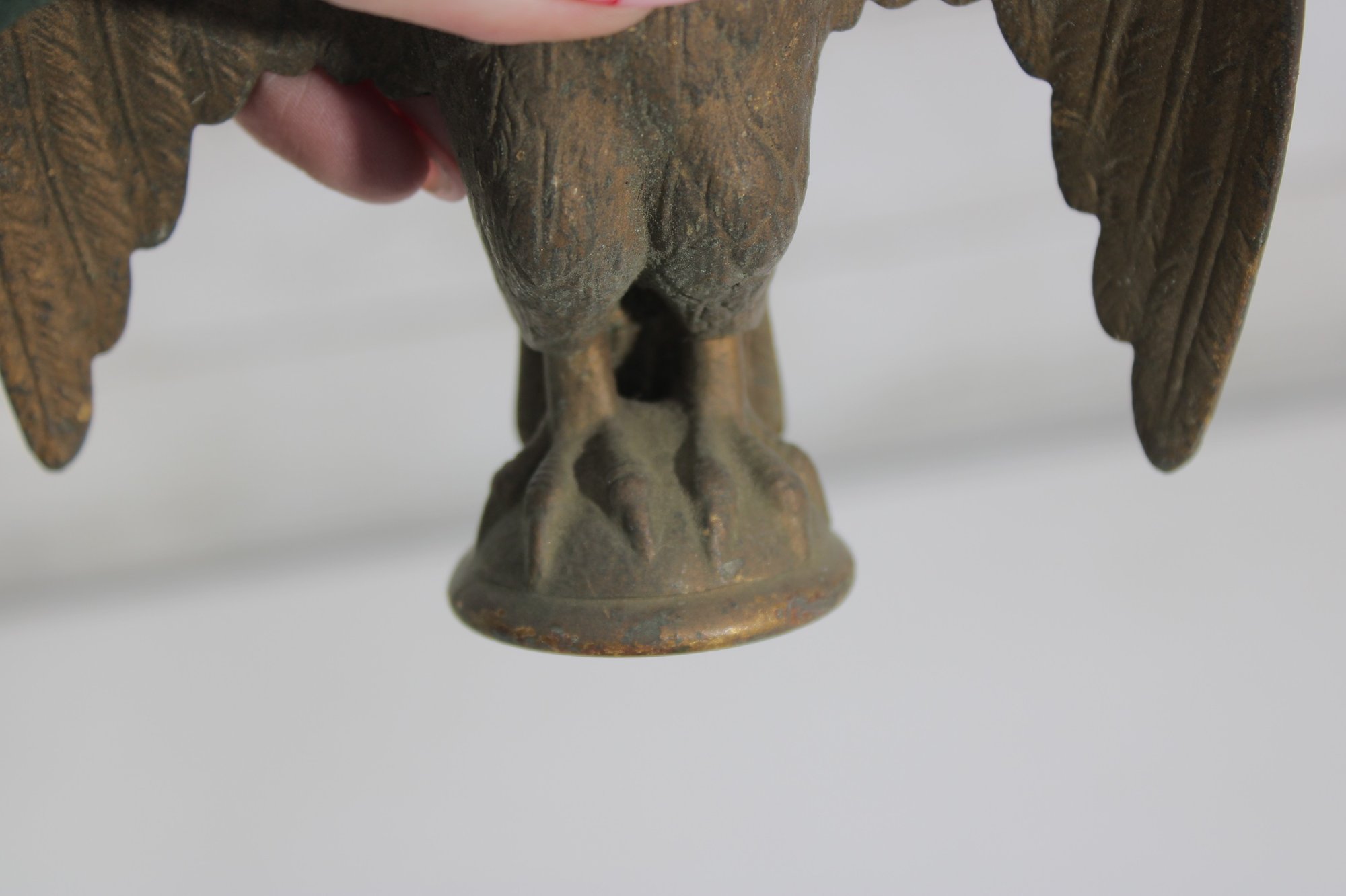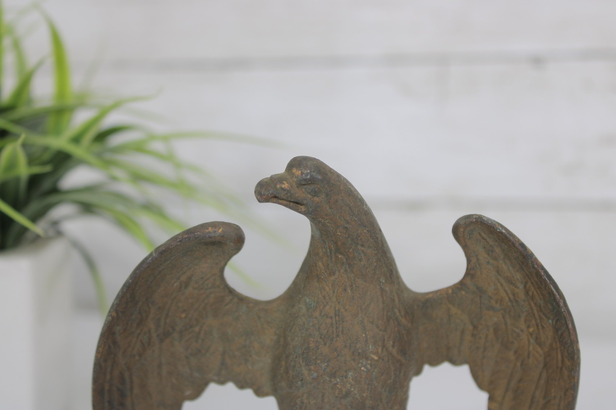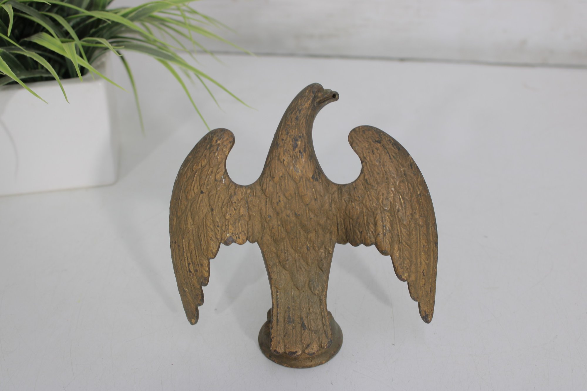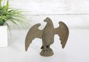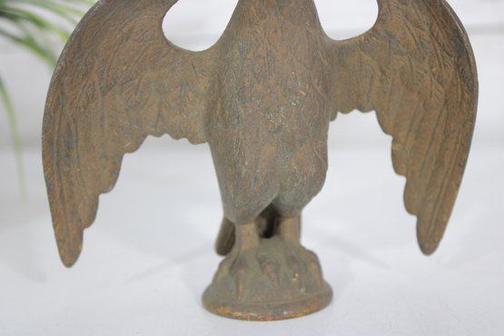 antique cast iron eagle figure, depicted with wings fully spread and standing on a round base. The eagle shows bold form and surface texture, with a naturally aged patina that enhances its character and authenticity.