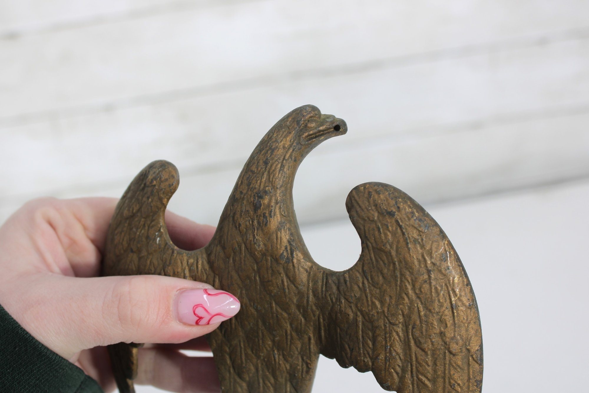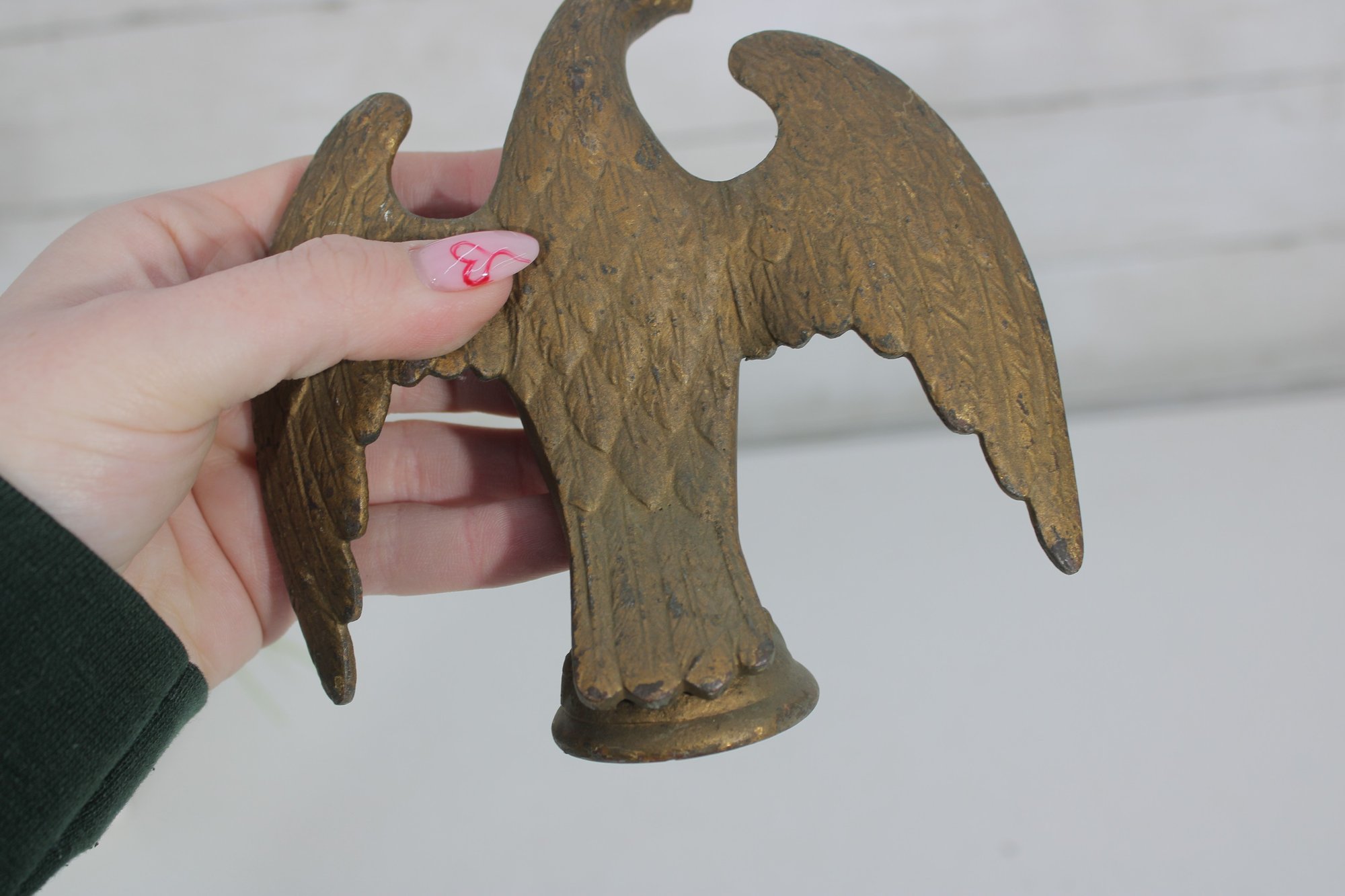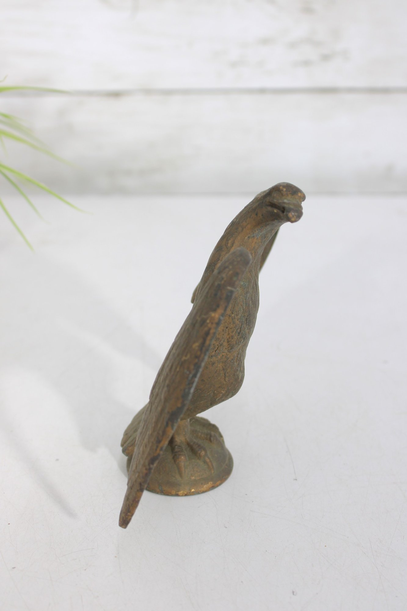 antique cast iron eagle figure, depicted with wings fully spread and standing on a round base. The eagle shows bold form and surface texture, with a naturally aged patina that enhances its character and authenticity.