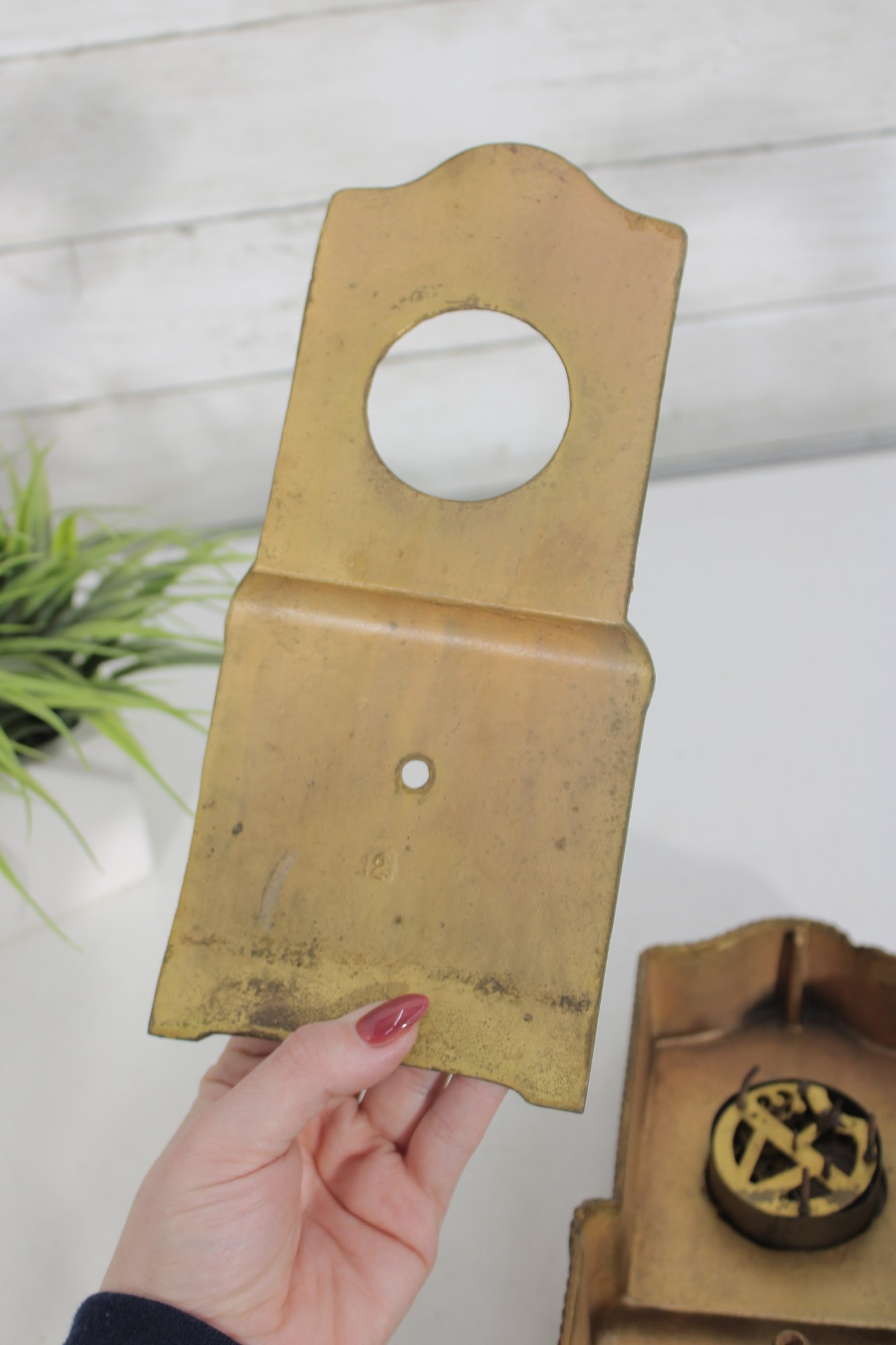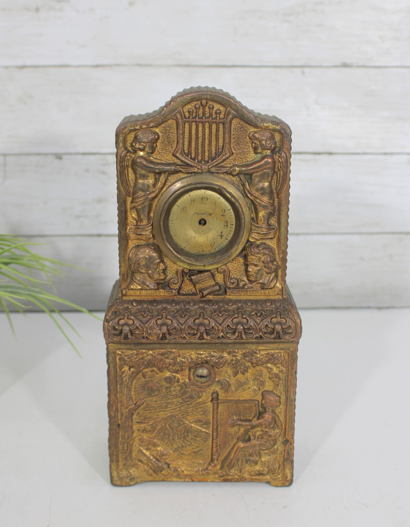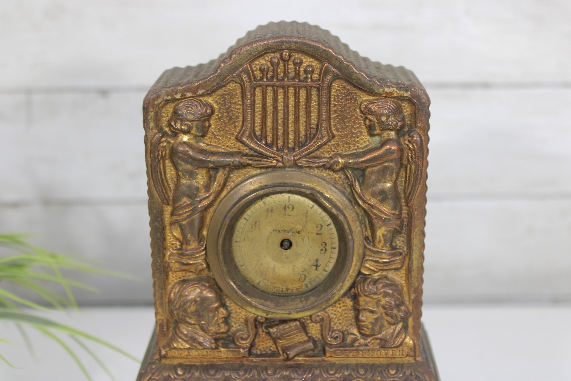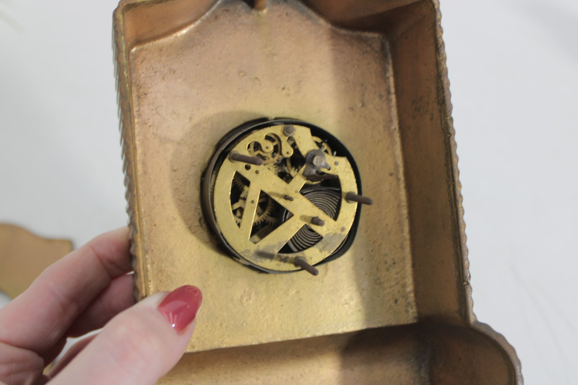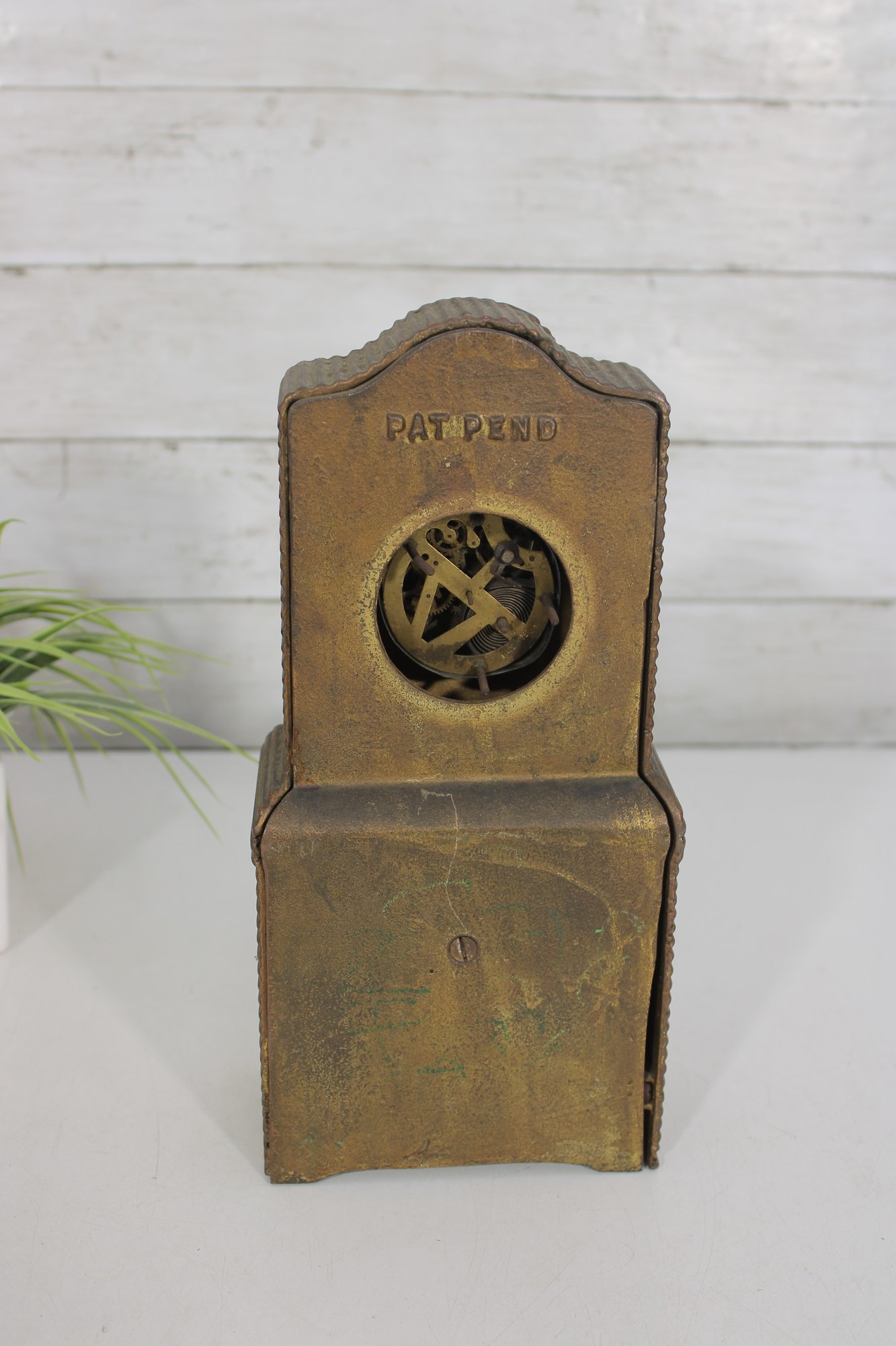 Measuring approximately 11" high by 5" wide, this piece makes a wonderful decorative accent for a mantel, shelf, or collection of antique timepieces. The interior houses a mechanical movement, visible from the rear access panel, adding to its authentic vintage appeal.
