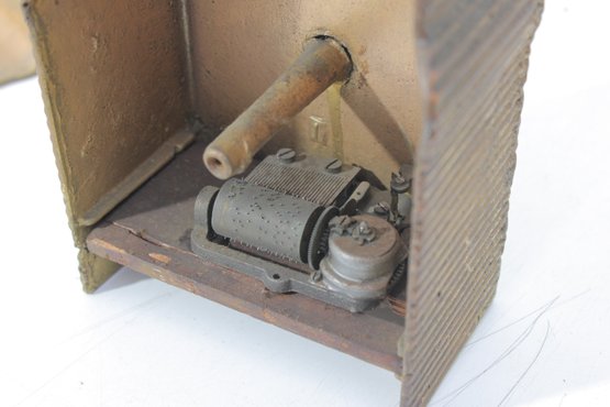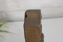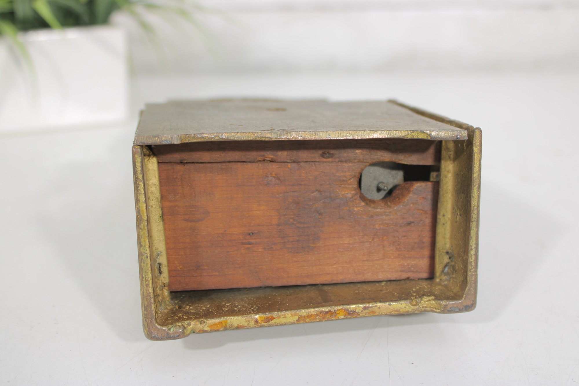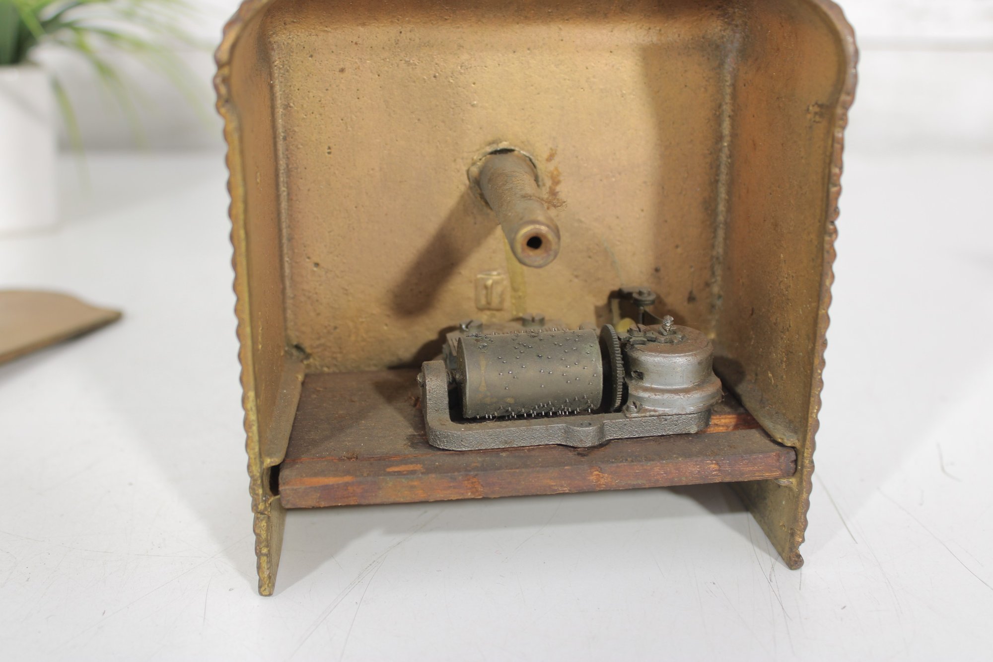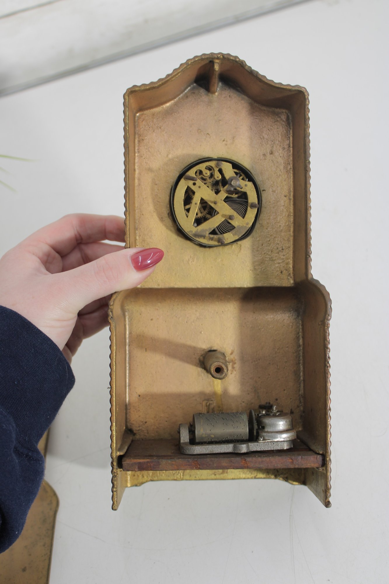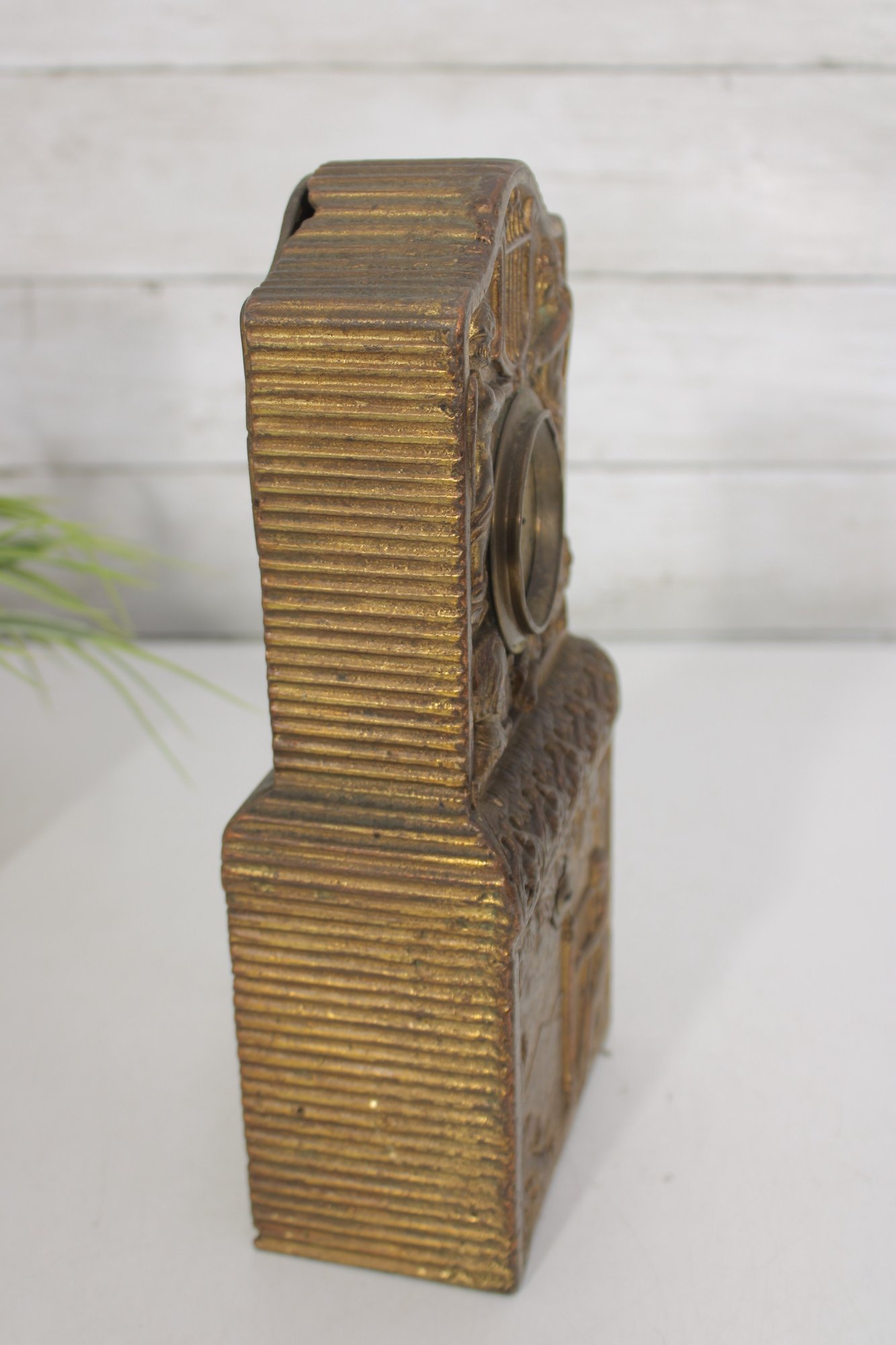 Measuring approximately 11" high by 5" wide, this piece makes a wonderful decorative accent for a mantel, shelf, or collection of antique timepieces. The interior houses a mechanical movement, visible from the rear access panel, adding to its authentic vintage appeal.