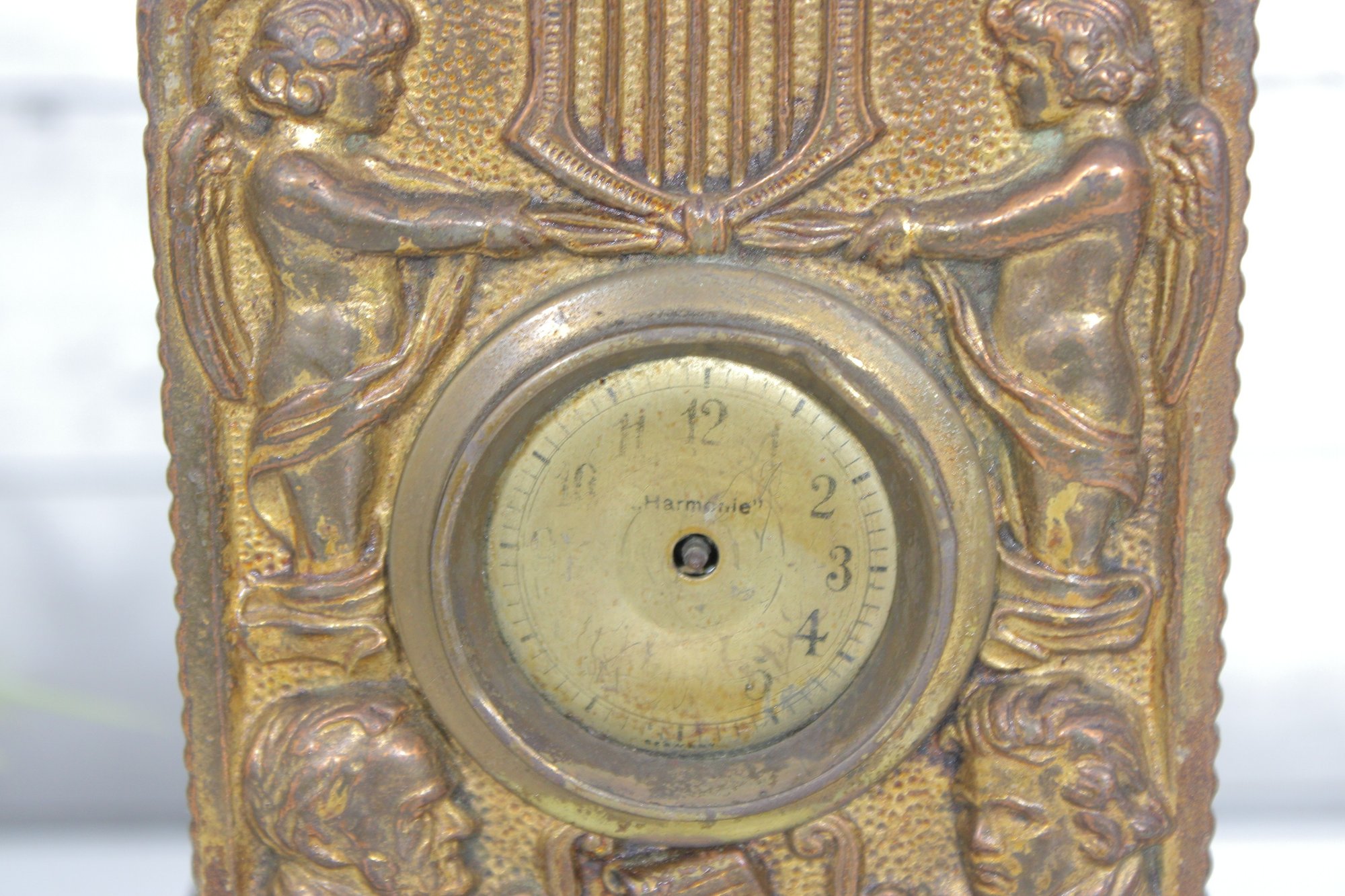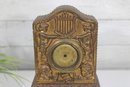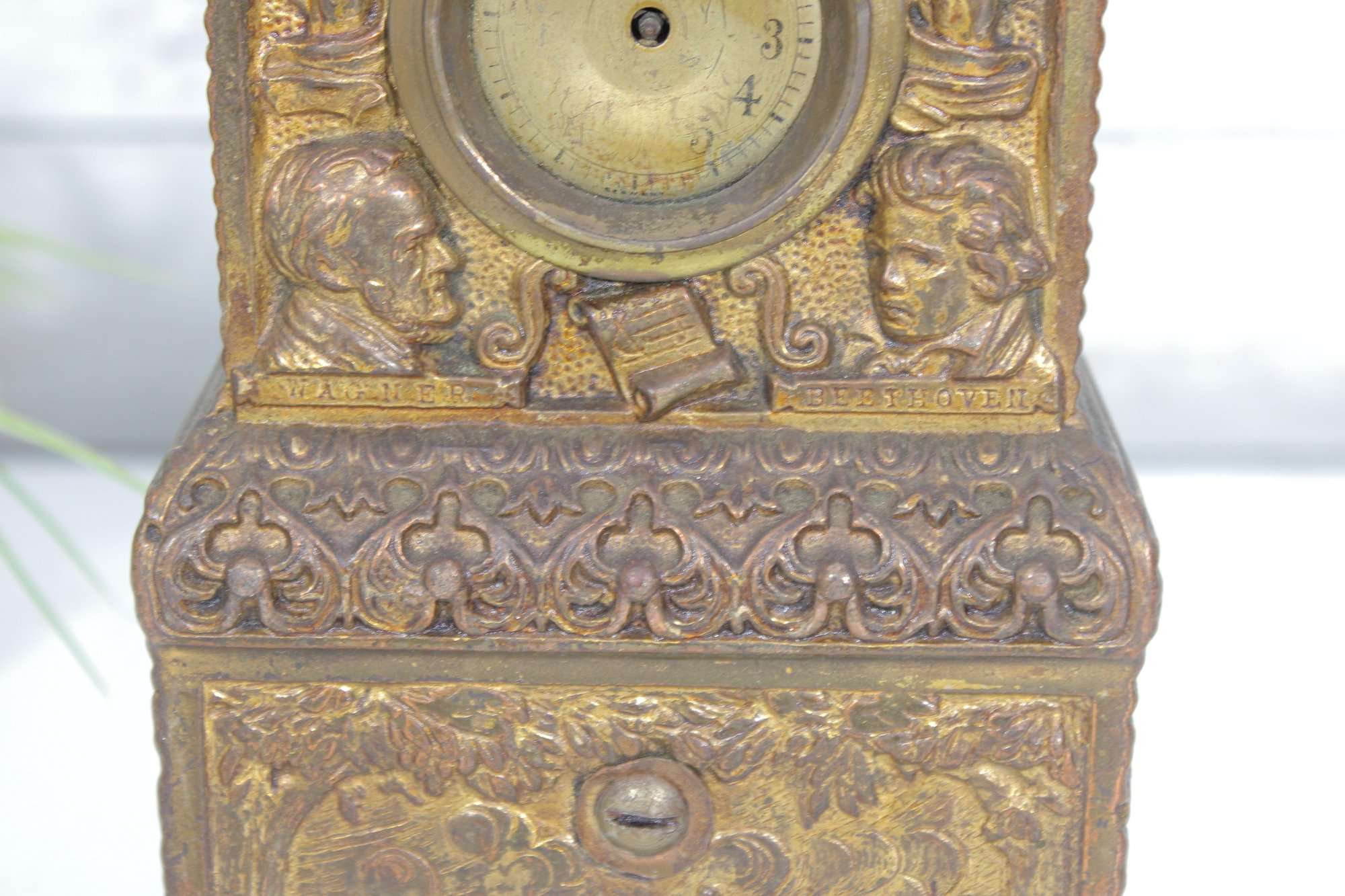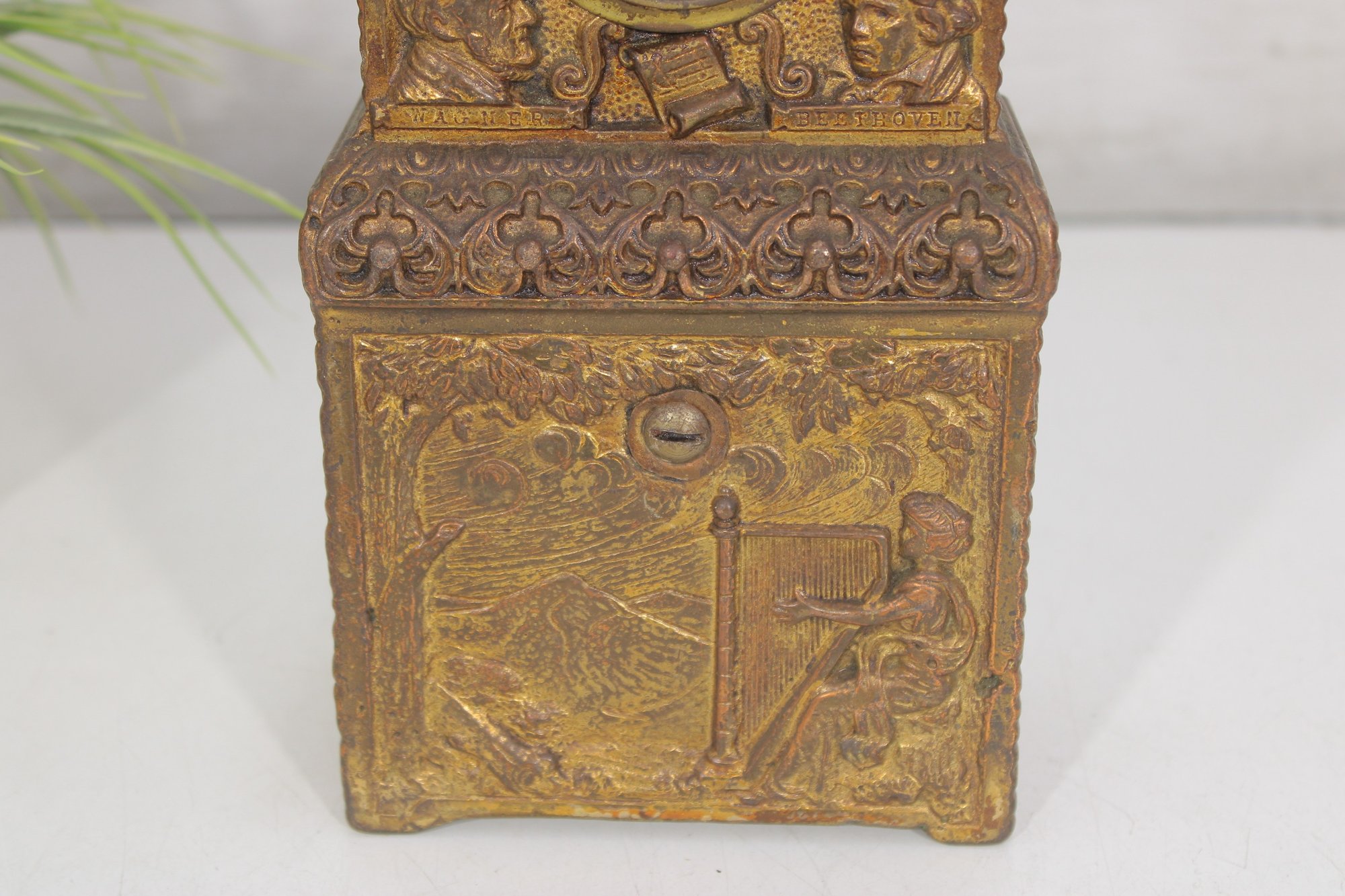 Striking antique mantel clock featuring an ornate cast metal case with detailed figural relief decoration. The front showcases classical-style figures and decorative motifs surrounding the clock dial, giving it a rich architectural presence reminiscent of late 19th to early 20th century design.