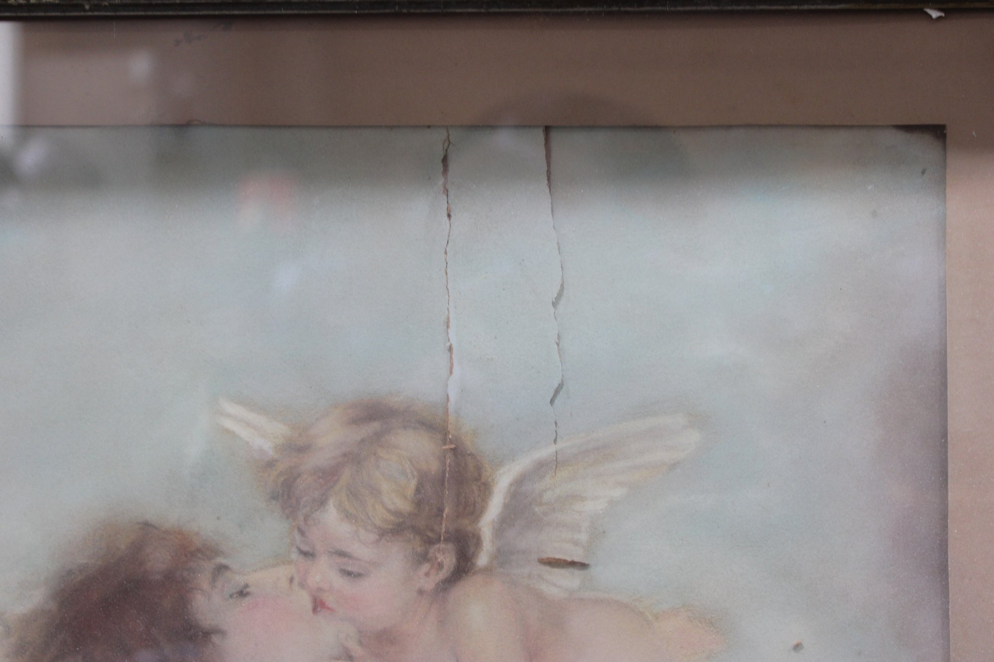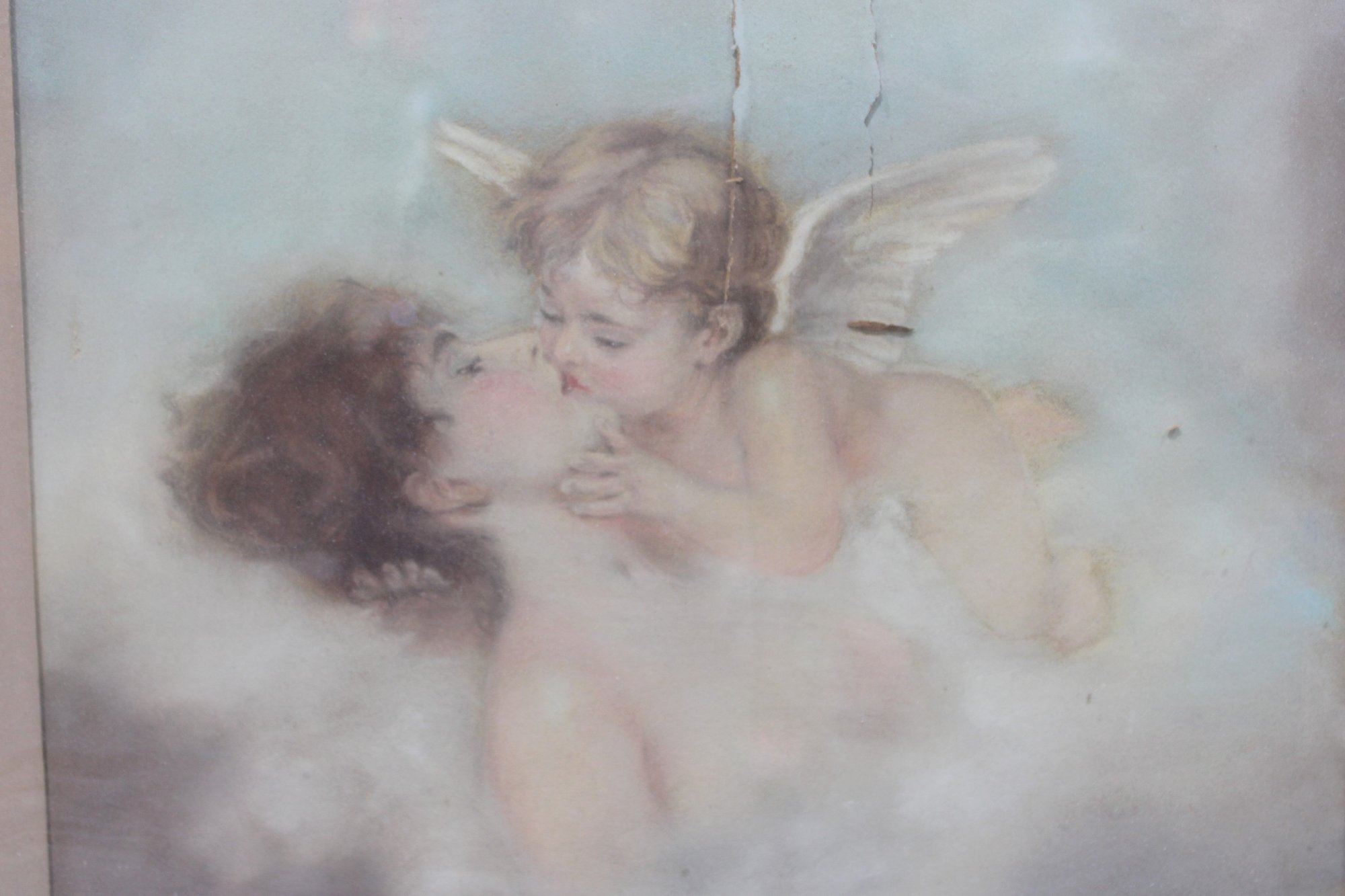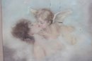 This charming antique print depicts a tender romantic scene of cherubs floating among soft clouds, rendered in gentle pastel tones that evoke the sentimental aesthetic popular in the late 19th to early 20th century. The figures’ delicate expressions, feathered wings, and softly blended background create a dreamy, ethereal atmosphere.