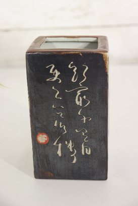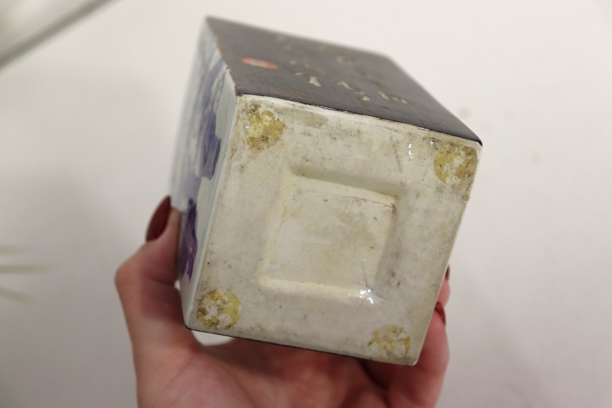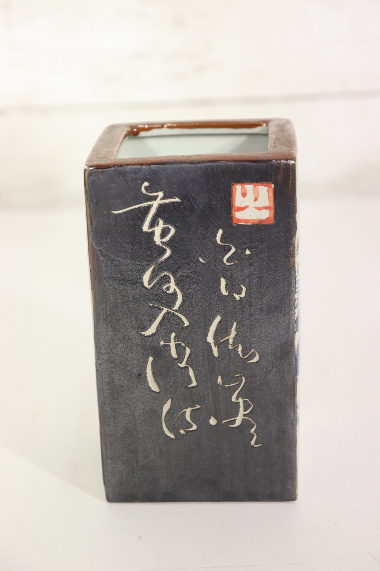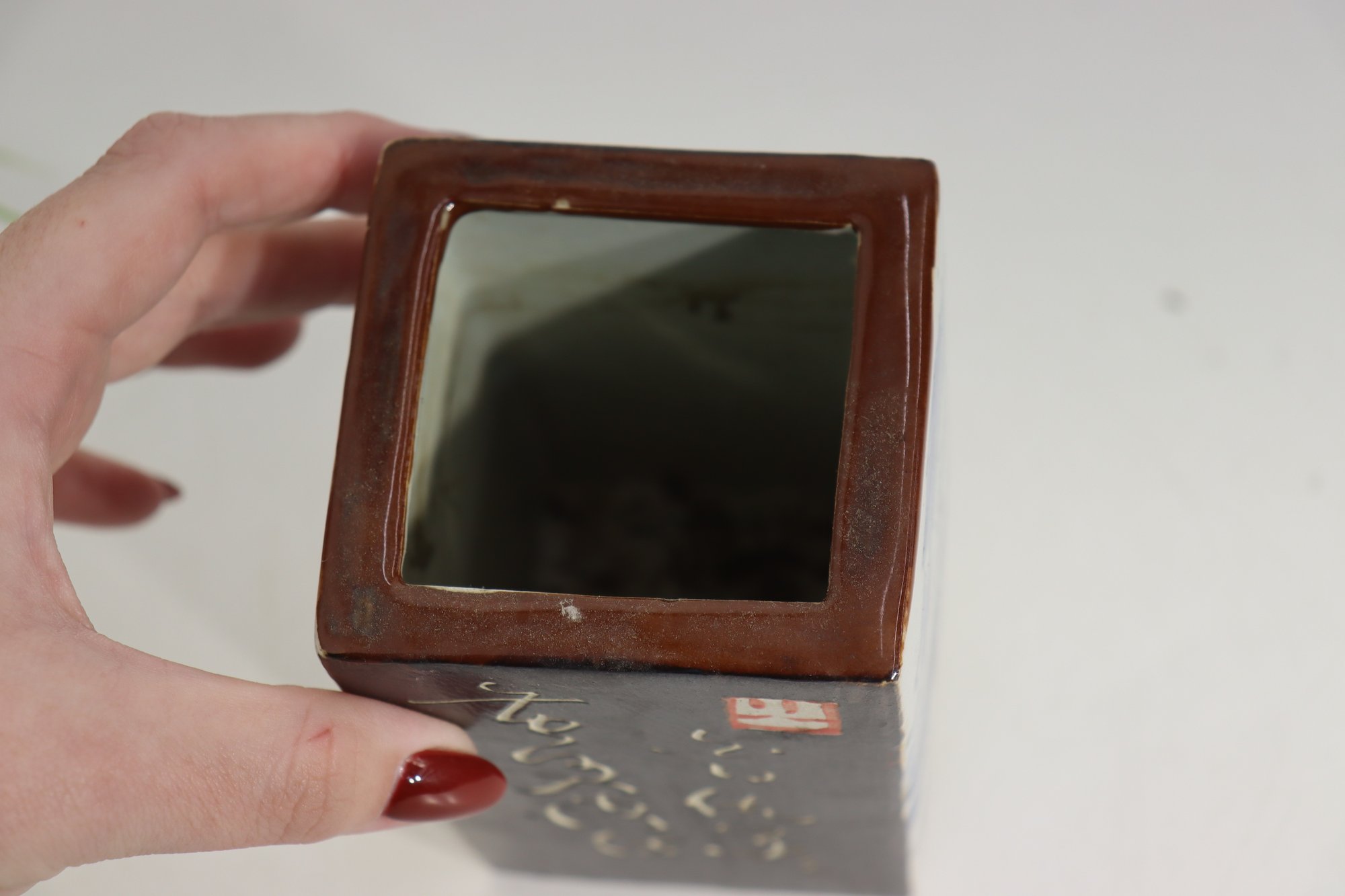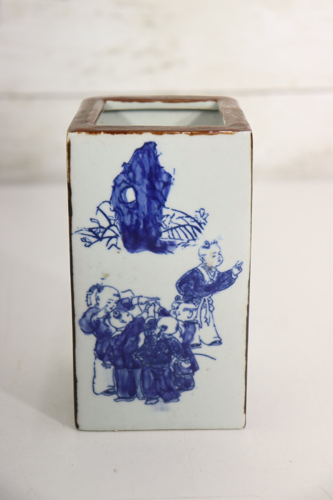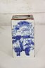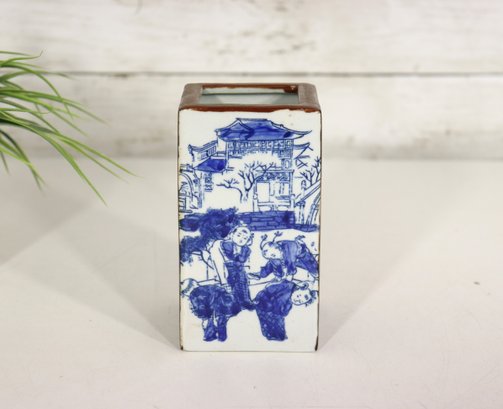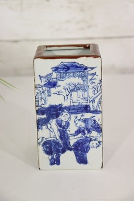 Beautiful antique Chinese porcelain brush pot or vase, measuring approximately 5.5 inches high by 3 inches wide and 3 inches deep. This square-form vessel features a striking hand-painted blue and white scene depicting figures in a landscape with architecture, rendered in traditional Chinese artistry.
