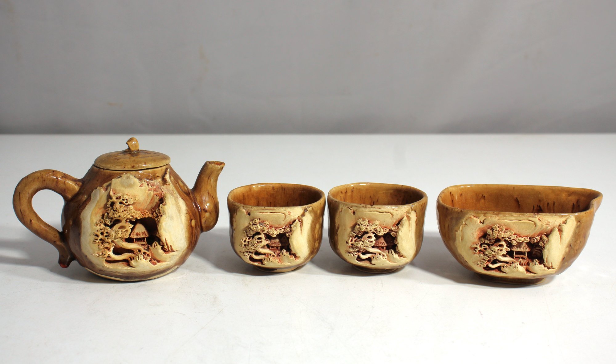 A beautifully crafted ceramic tea set from the Qing Dynasty, China. This set includes a teapot and two teacups, each adorned with intricate carvings of traditional Chinese motifs. The carvings on each piece showcase scenes from nature and architecture, adding a touch of elegance to the set. The teapot features a finely shaped handle and spout, perfect for display or use. There is slight wear consistent with age, enhancing the antique value of this historical collection.