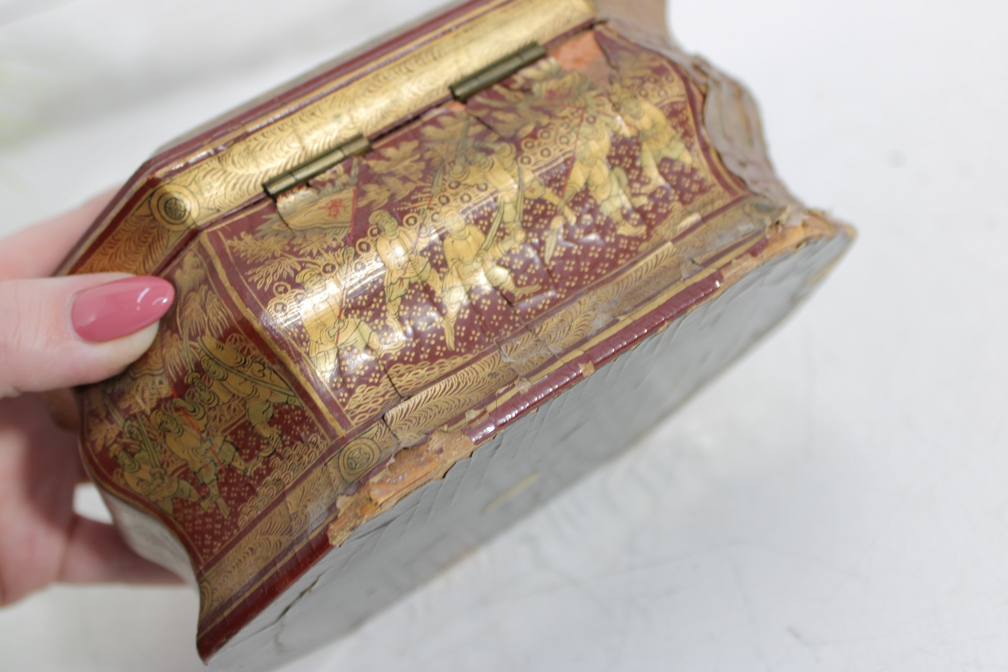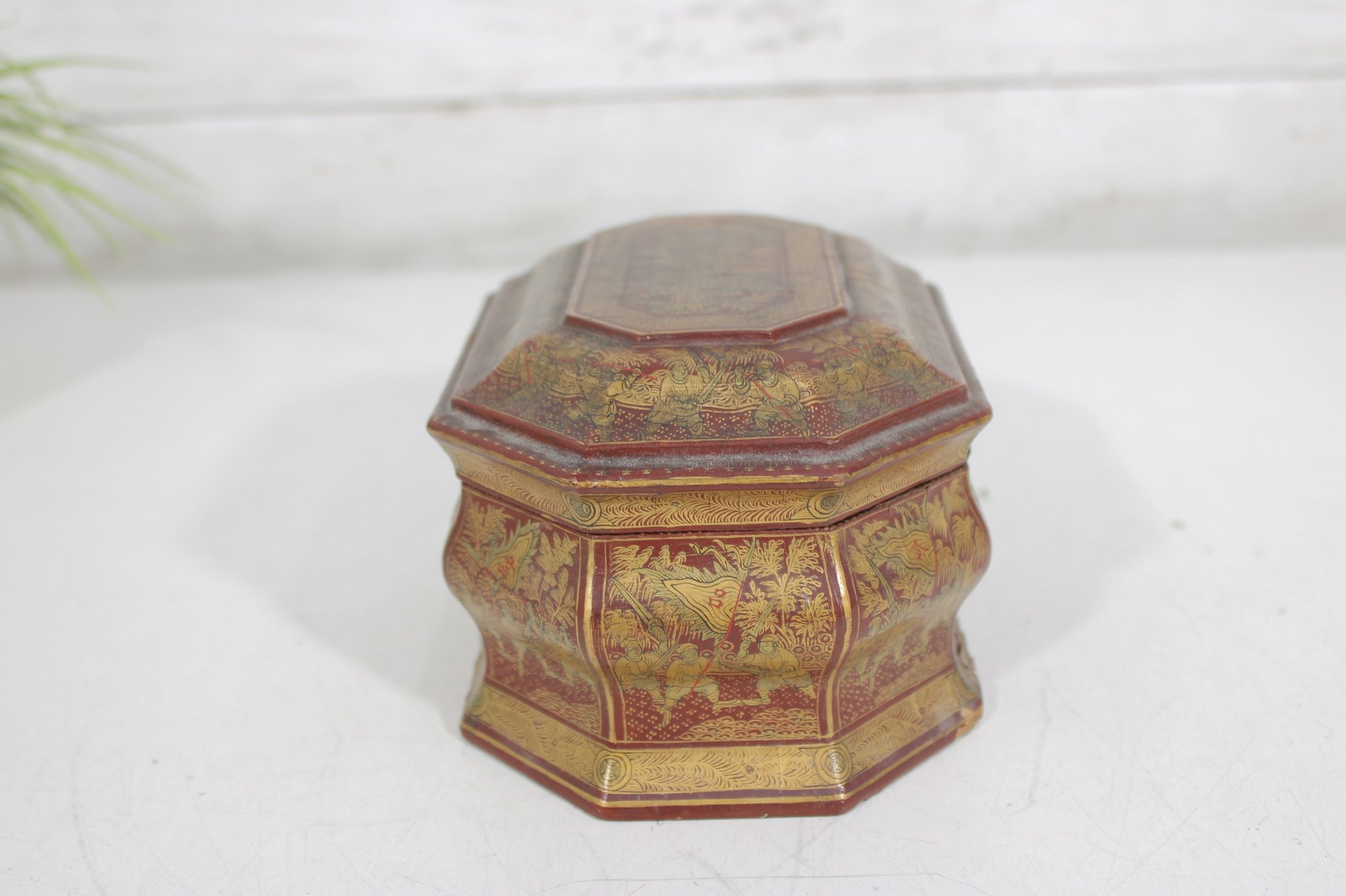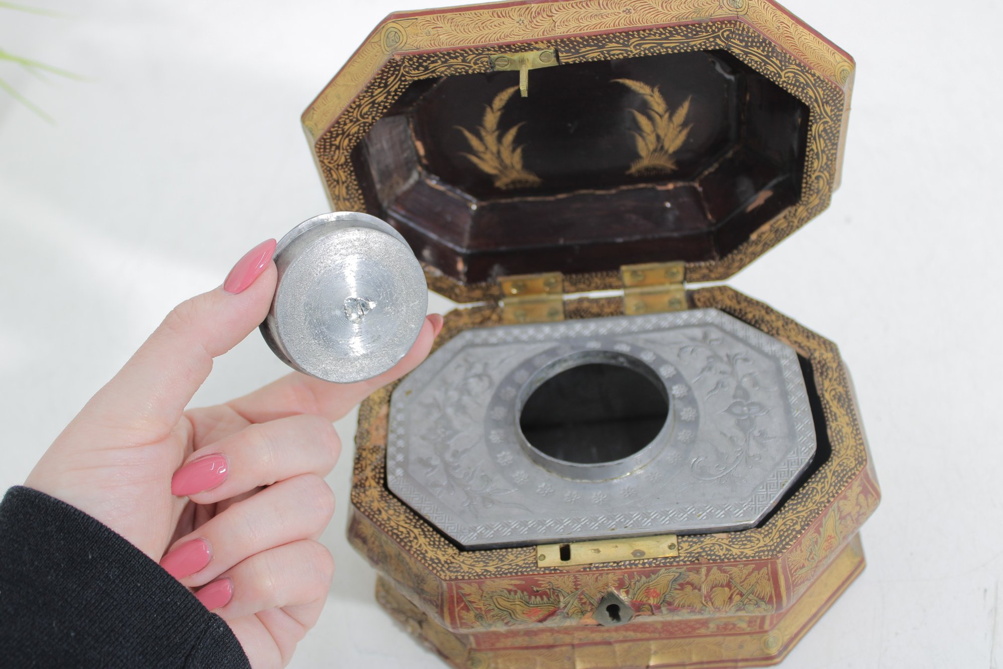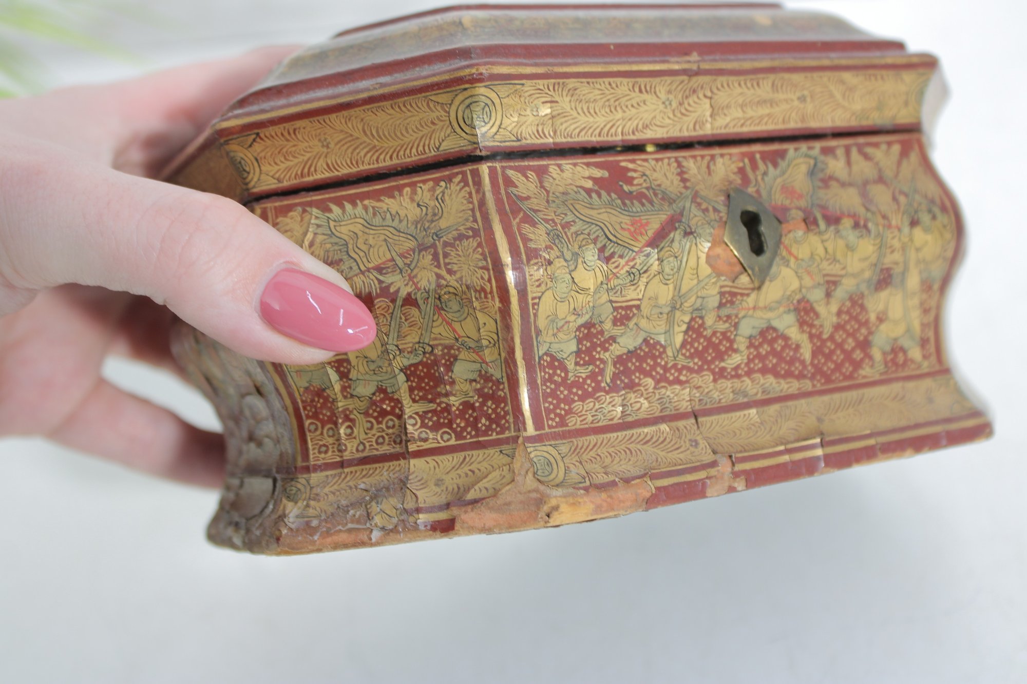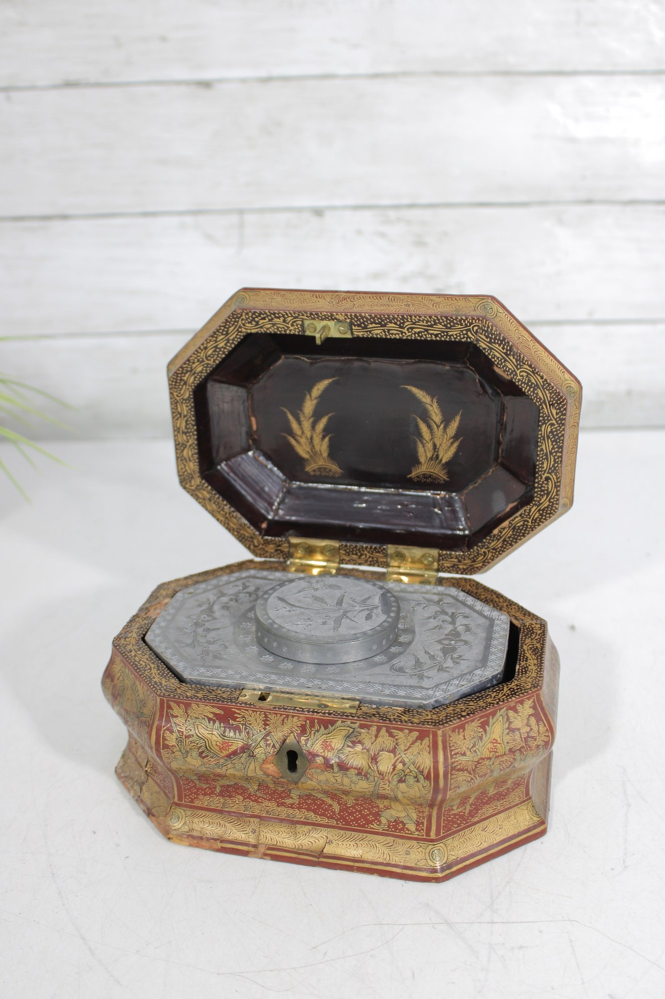 Chinese lacquer tea caddies like this were produced for the export trade in the 18th and 19th centuries, used to store valuable loose-leaf tea. Today they are highly sought after by collectors of Asian antiques, tea-related objects, and decorative lacquerware.