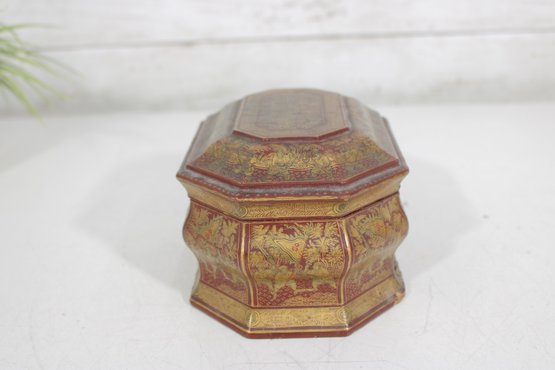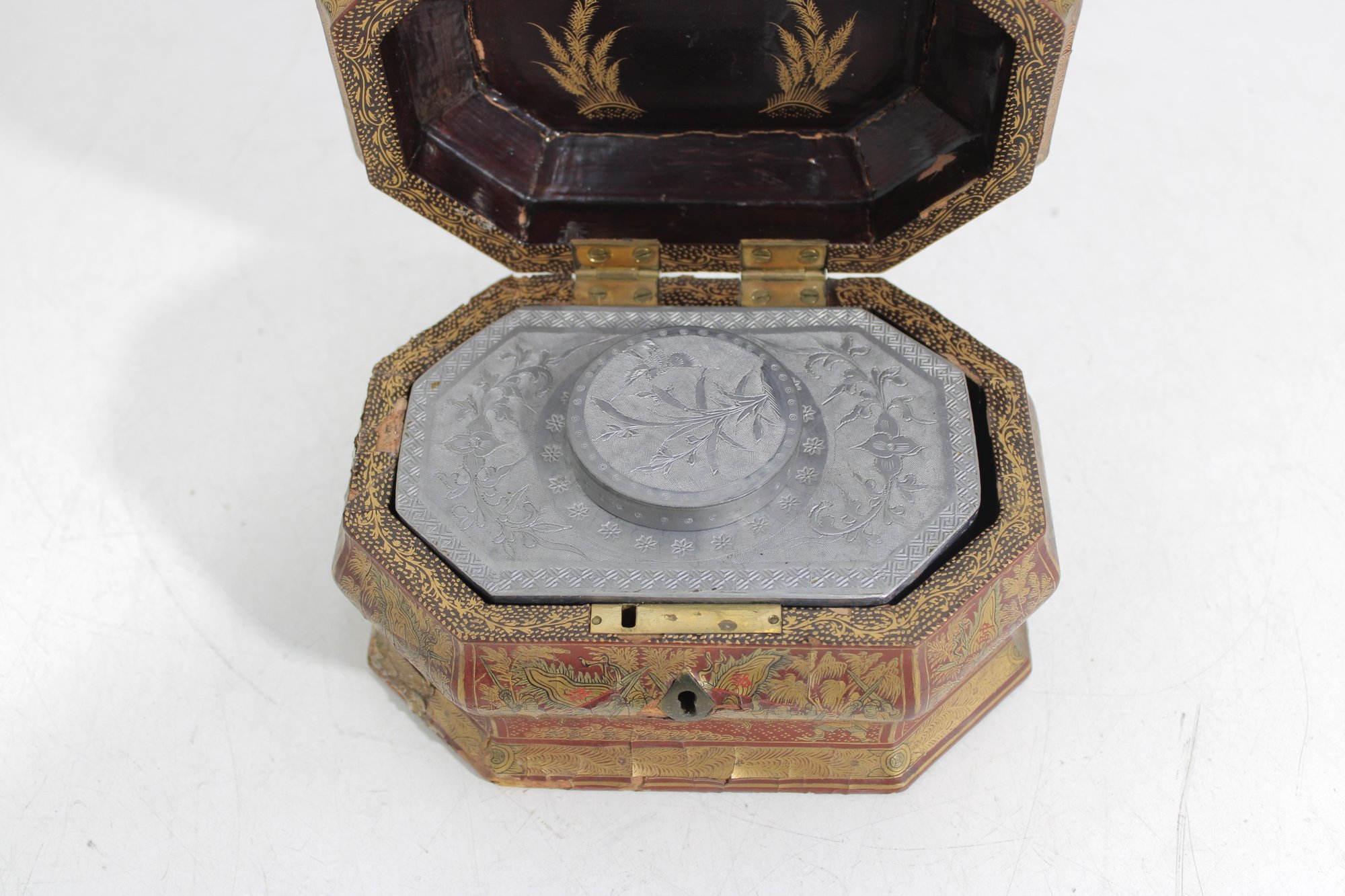 antique Chinese export lacquered tea caddy, featuring an elegant octagonal form with detailed black and gold decoration. The exterior is richly adorned with traditional landscape scenes, figures, trees, and decorative borders executed in fine gilt over a red and black lacquer ground.