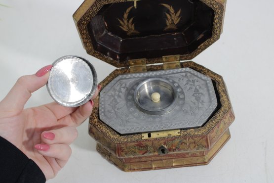 The hinged lid opens to reveal the interior storage compartment along with the removable inner lid insert, traditionally used to help seal and preserve tea. The interior of the lid and box are finished in dark lacquer with decorative gilt accents.